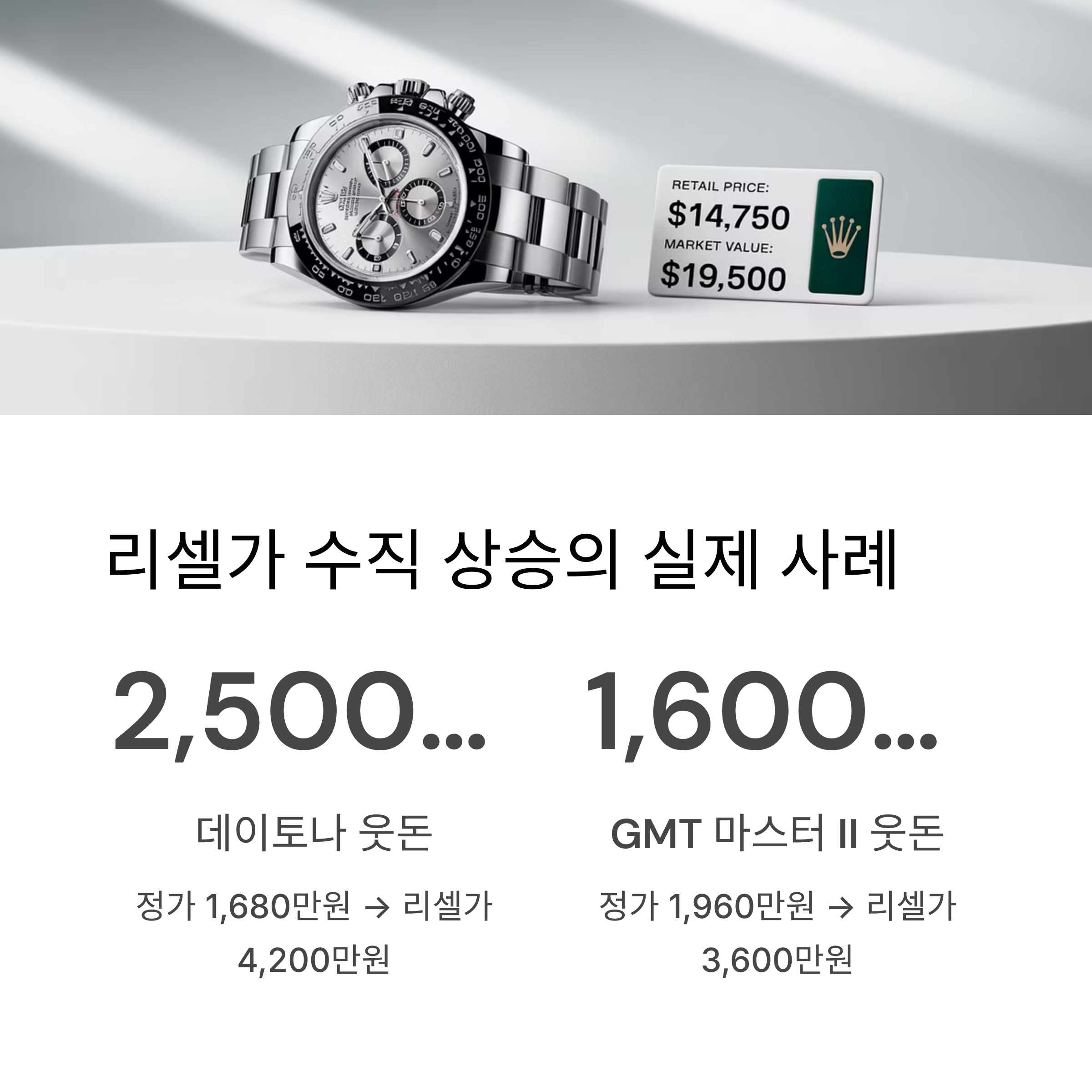 고가 모델일수록 웃돈 폭도 기하급수적으로 커집니다. 예를 들어 데이토나는 정가가 1,600만 원대지만, 리셀가는 4,000만 원을 넘나듭니다. 웃돈만 2천만 원 이상 붙는 셈이죠.