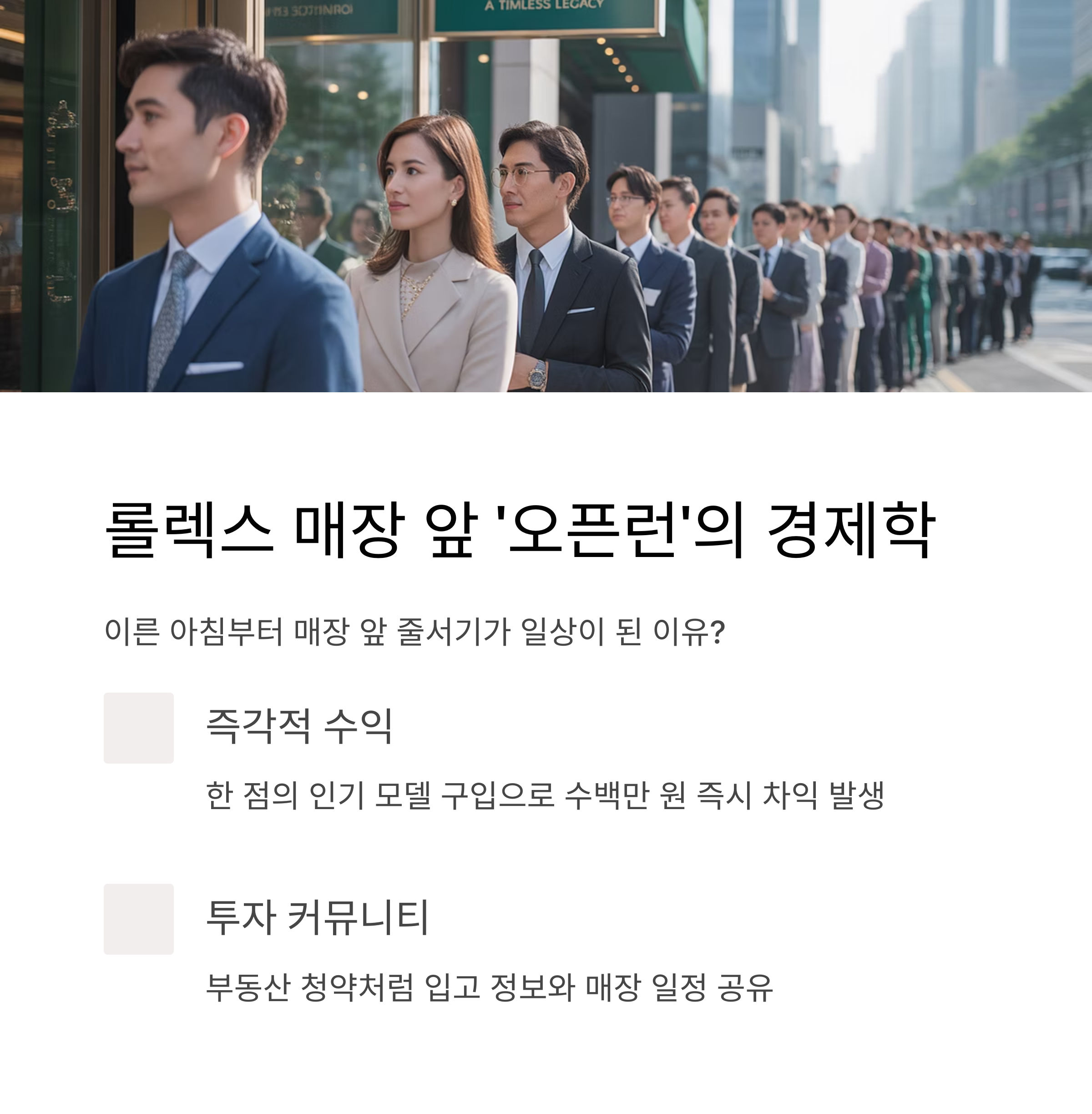 입고량이 적고 수요는 많은 상황에서, 구입에 성공한 시계는 중고 시장에서 200~500만 원의 웃돈이 붙는 일이 다반사입니다. 특히 MZ세대를 중심으로 “한 번 사두면 가격이 오르기만 한다”는 믿음이 확산되며, 실착용이 아닌 ‘투자’ 목적의 구매도 늘고 있습니다.