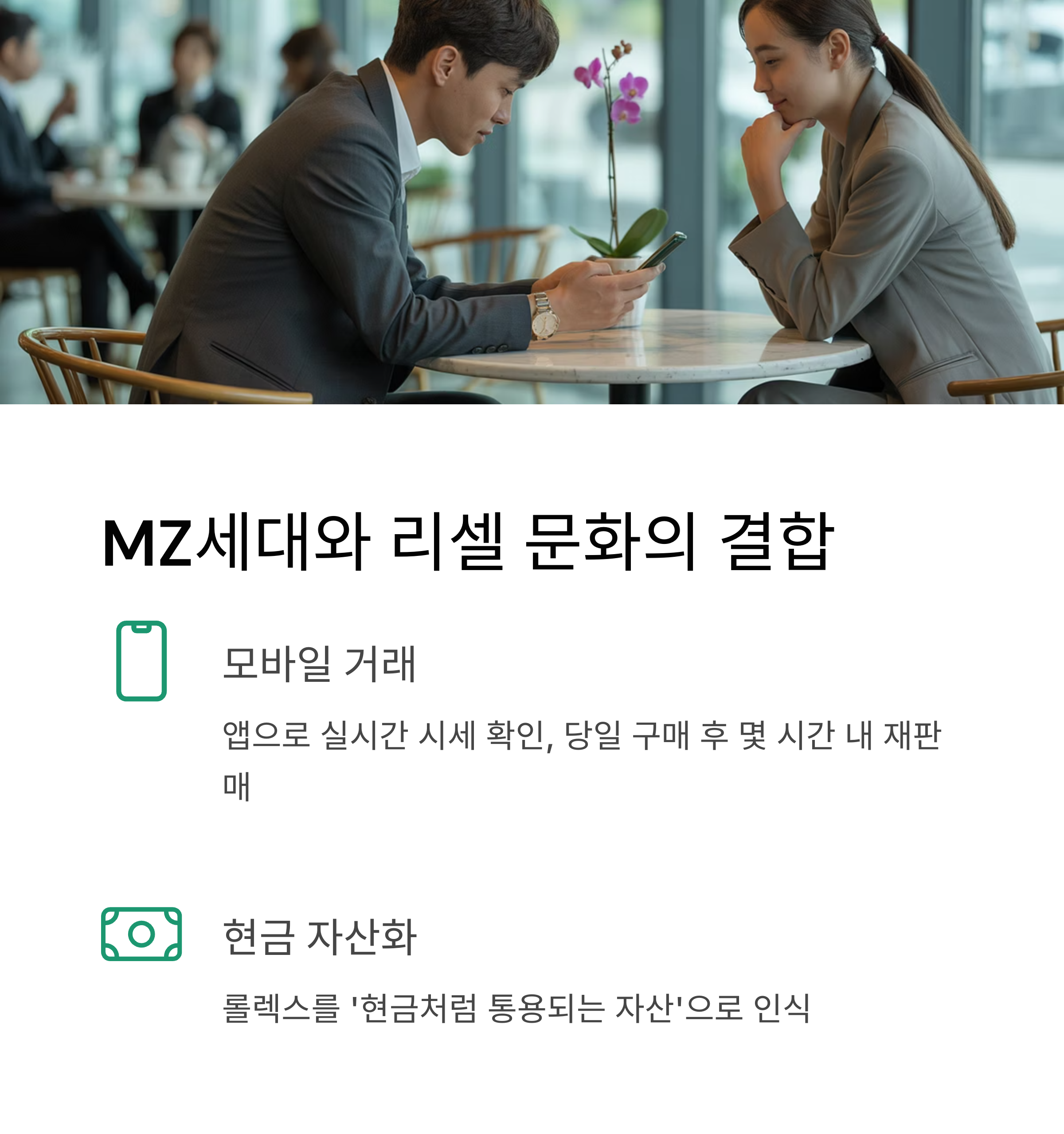 중고 거래에 거부감이 없는 MZ세대는 롤렉스 리셀 시장의 핵심 소비층으로 떠올랐습니다. 앱으로 손쉽게 시계 시세를 확인하고, 당일 구매한 롤렉스를 몇 시간 내에 프리미엄을 얹어 판매하는 사례도 흔합니다.