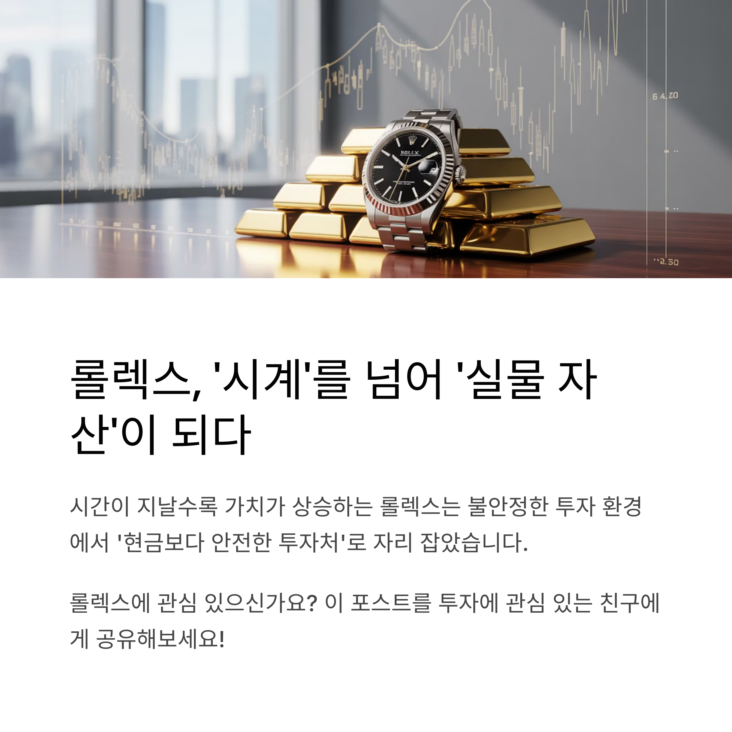 시계는 시간이 지나도 가치가 하락하지 않는 ‘실물 자산’으로 여겨지며, 특히 롤렉스는 가격이 하락하는 경우가 거의 없다는 점에서 ‘현금보다 안전한 투자처’라는 평을 듣습니다.