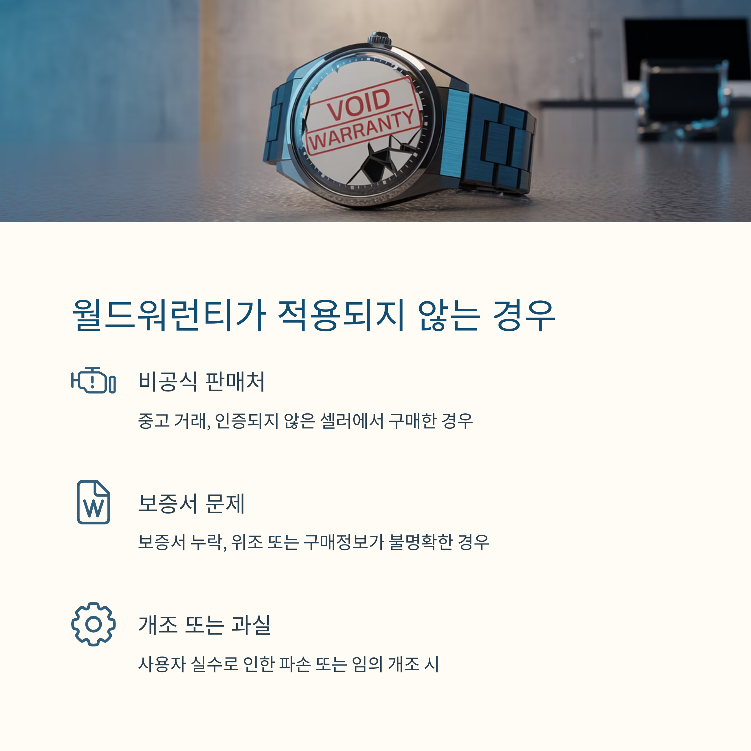 월드워런티가 모든 병행수입 시계에 자동 적용되는 것은 아닙니다. 아래와 같은 경우에는 워런티가 무효가 될 수 있습니다.