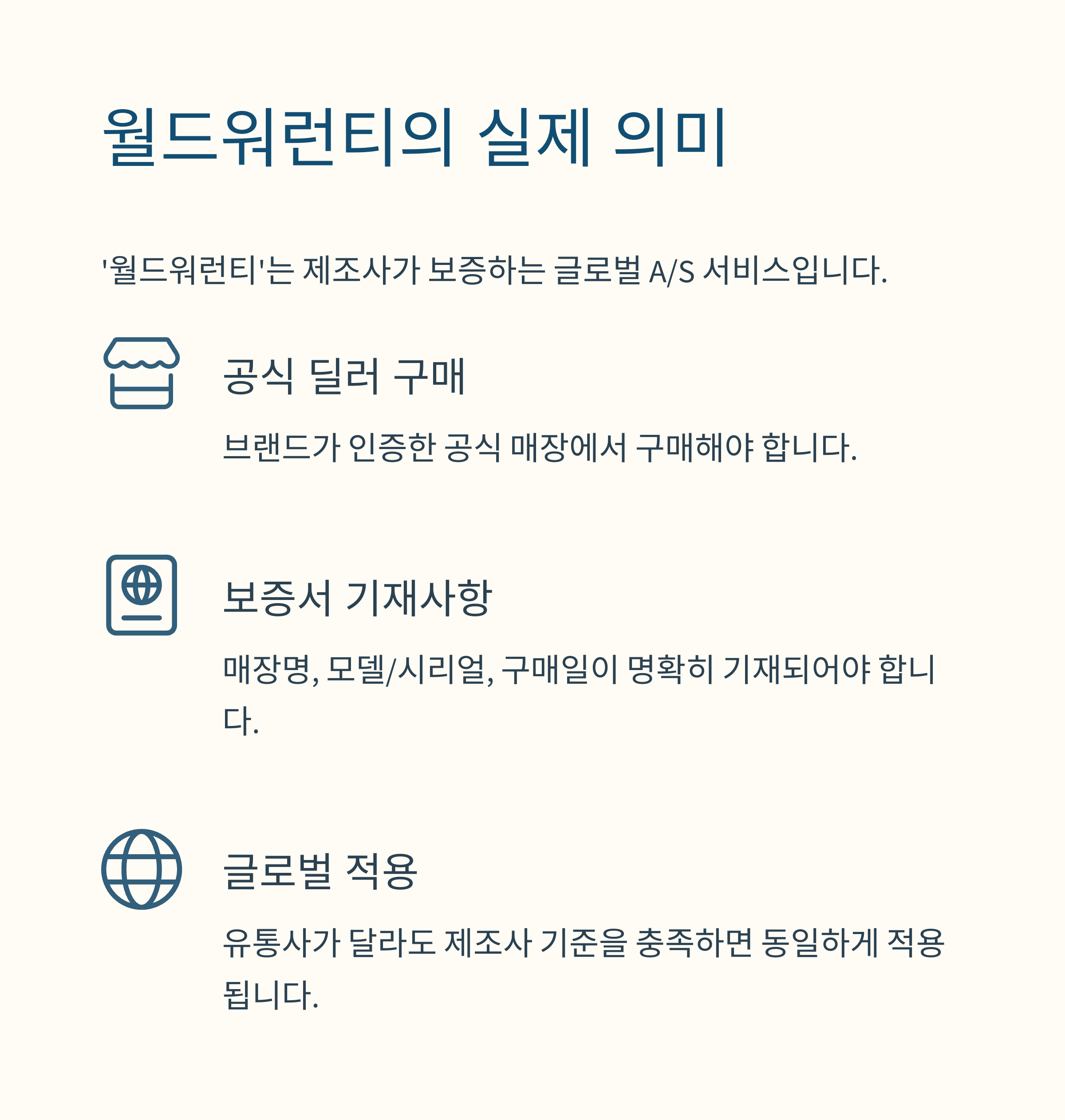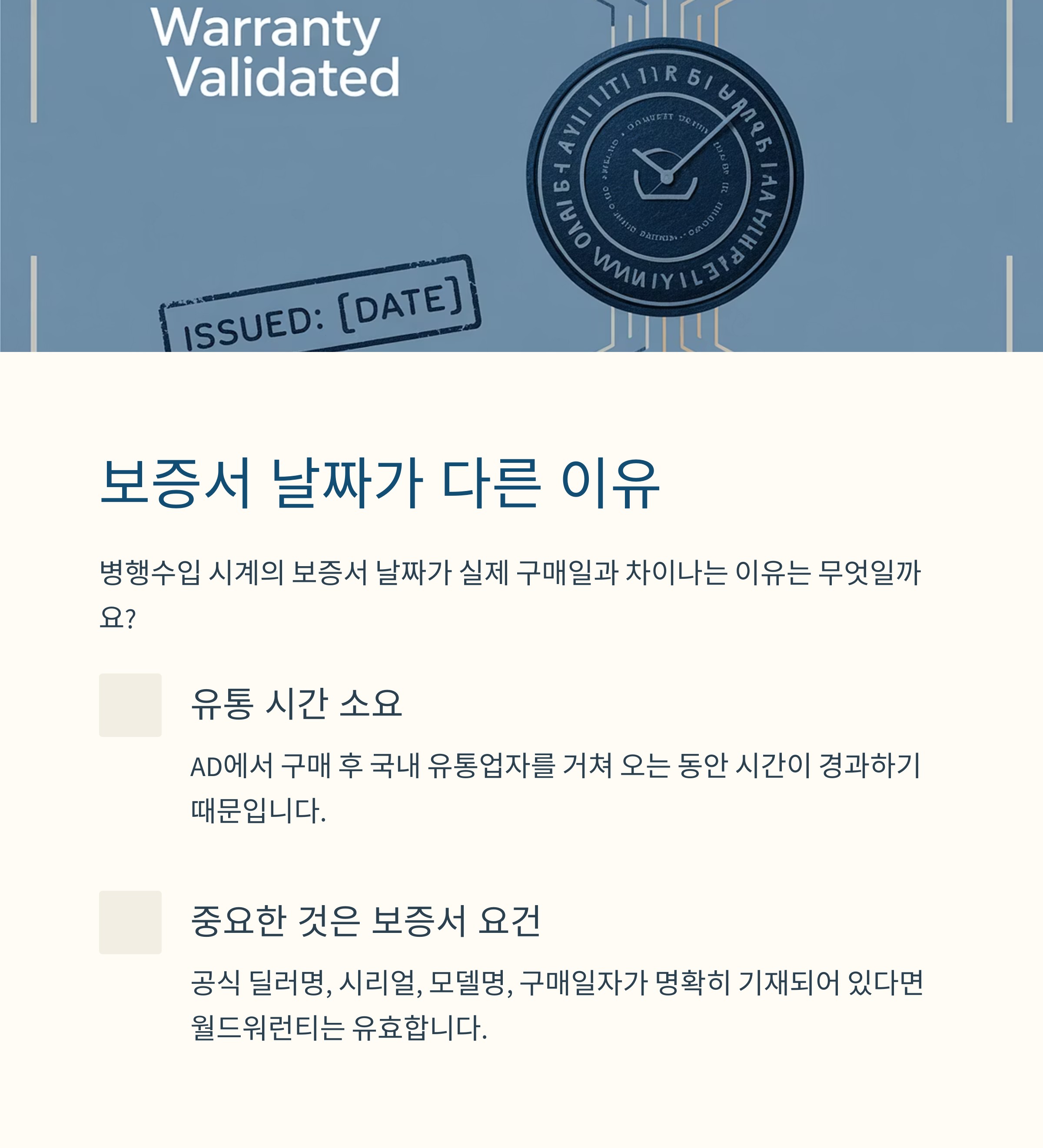 시계를 구매할 때 가장 걱정되는 요소 중 하나는 '워런티', 즉 제품 보증 서비스입니다. 특히 병행수입 시계라면 더더욱 그 보증 범위와 적용 조건이 궁금하실 텐데요. 이번 글에서는 정식수입과 병행수입의 차이, 그리고 월드워런티의 실제 적용 여부를 명확하게 정리해보겠습니다.