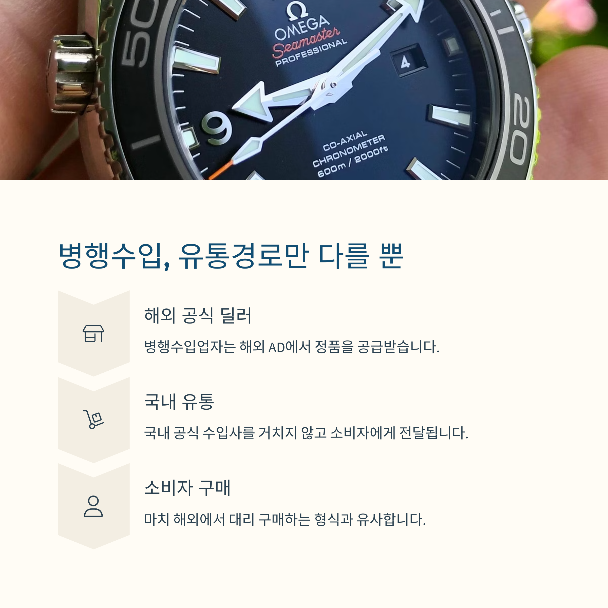 병행수입업자는 보통 해외의 공식 딜러(AD)로부터 정품 시계를 공급받습니다. 이 과정에서 시계는 국내 공식 수입사를 거치지 않지만, 제품 자체는 동일합니다.