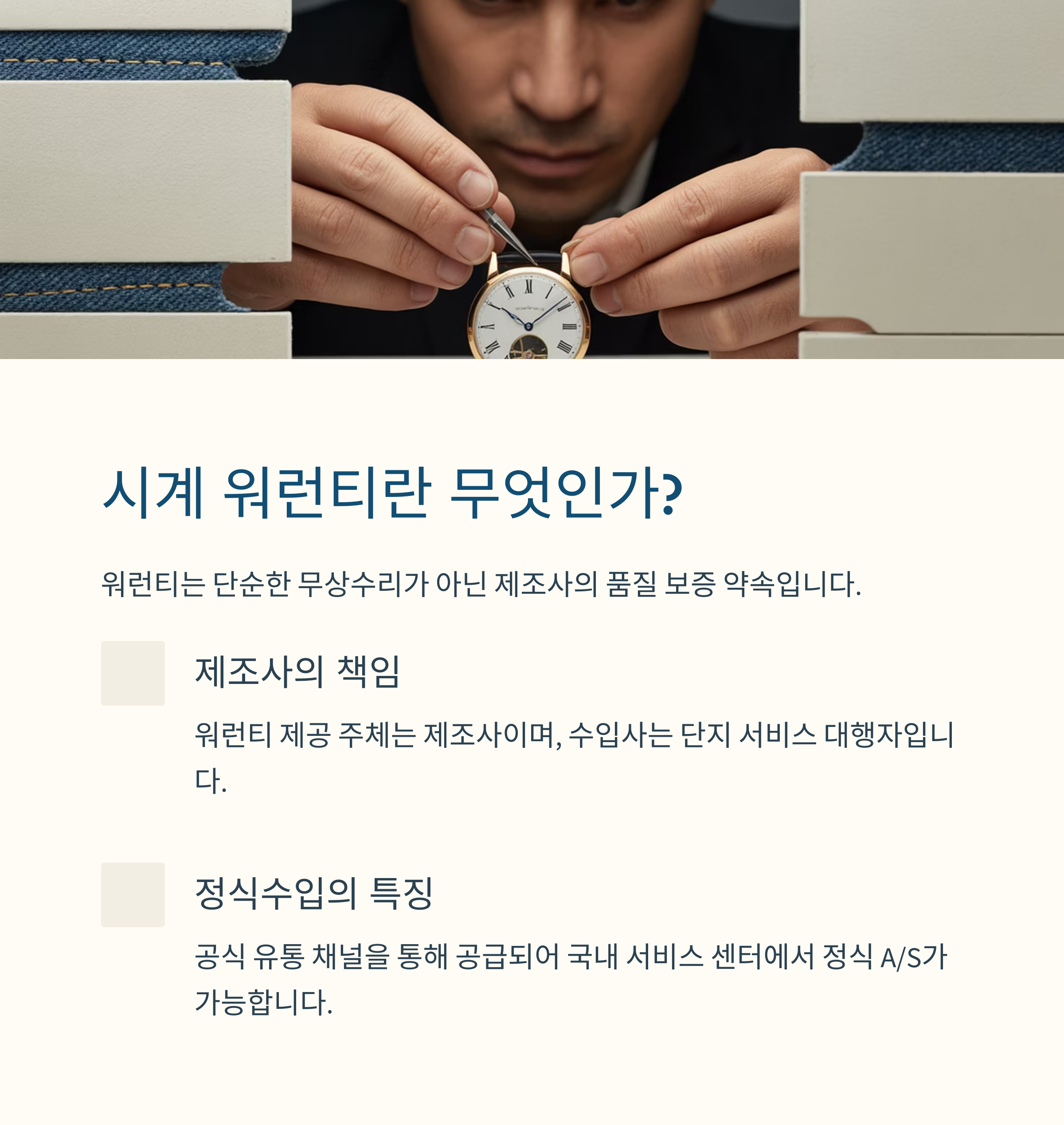시계 워런티는 제조사가 자사 제품에 대해 일정 기간 동안 품질 보증을 약속하는 제도입니다. 단순히 무상 수리의 개념이 아닌, 제조사의 책임 하에 품질을 유지하겠다는 약속입니다.