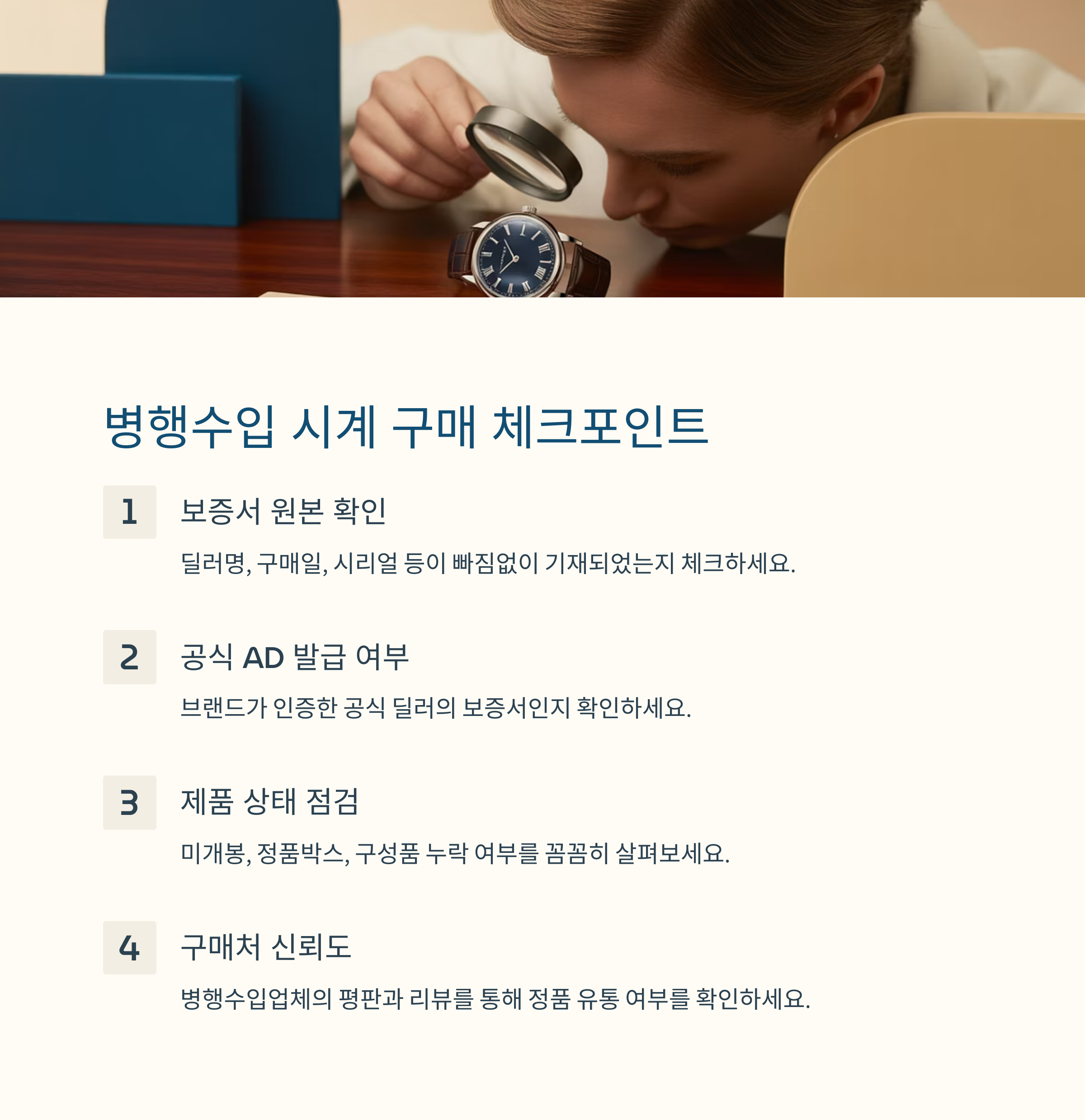 이 4가지 요소만 꼼꼼히 체크하면 병행수입 시계도 안심하고 사용할 수 있습니다.