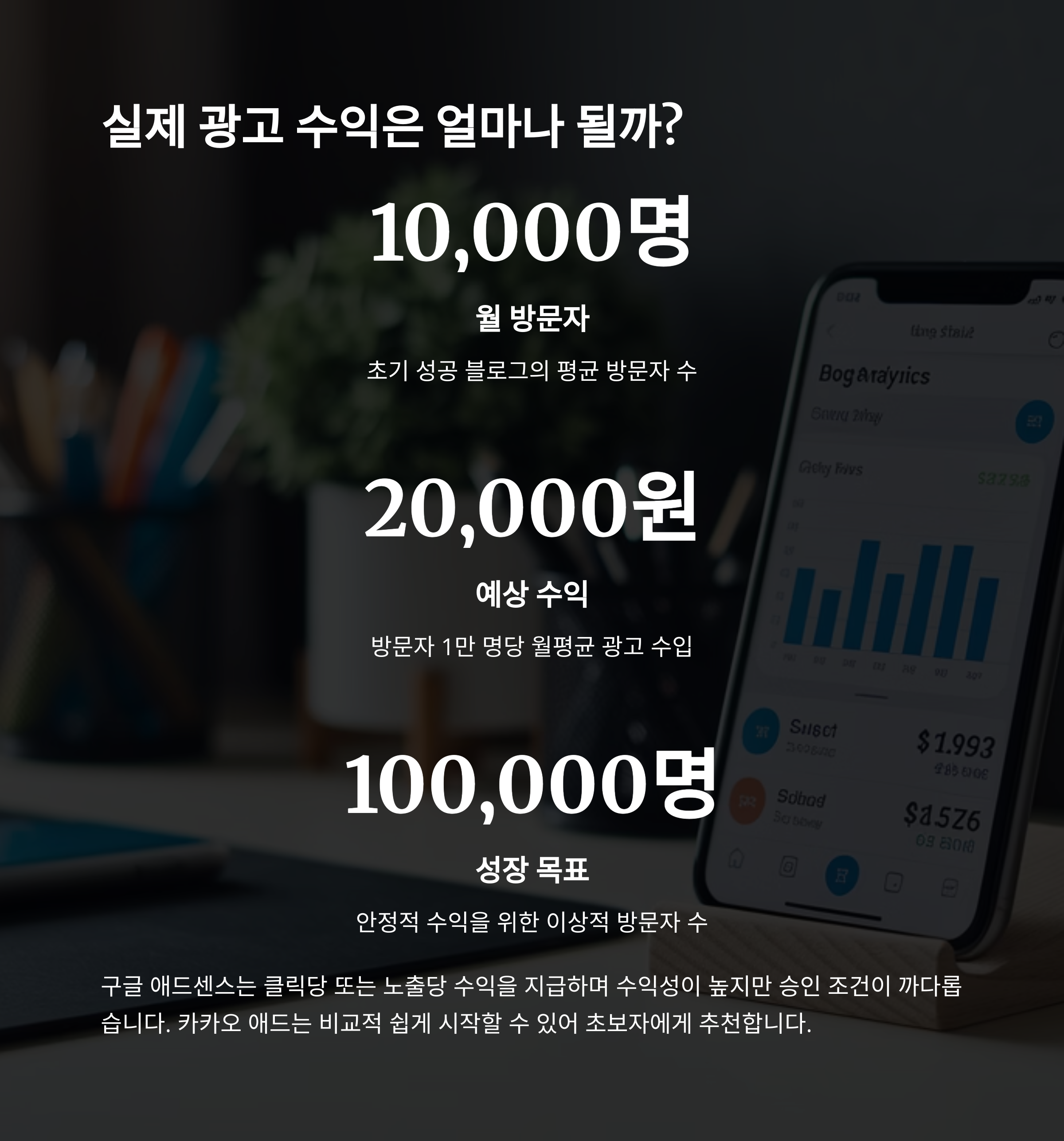 콘텐츠의 품질과 꾸준함이 결국 트래픽의 열쇠가 됩니다. 한편, 구글 애드센스를 통한 광고 수익은 방문자 수에 비례해 성장합니다. 1만 명 방문자를 유도하면 약 2만 원의 기본 광고 수익을 기대할 수 있습니다.