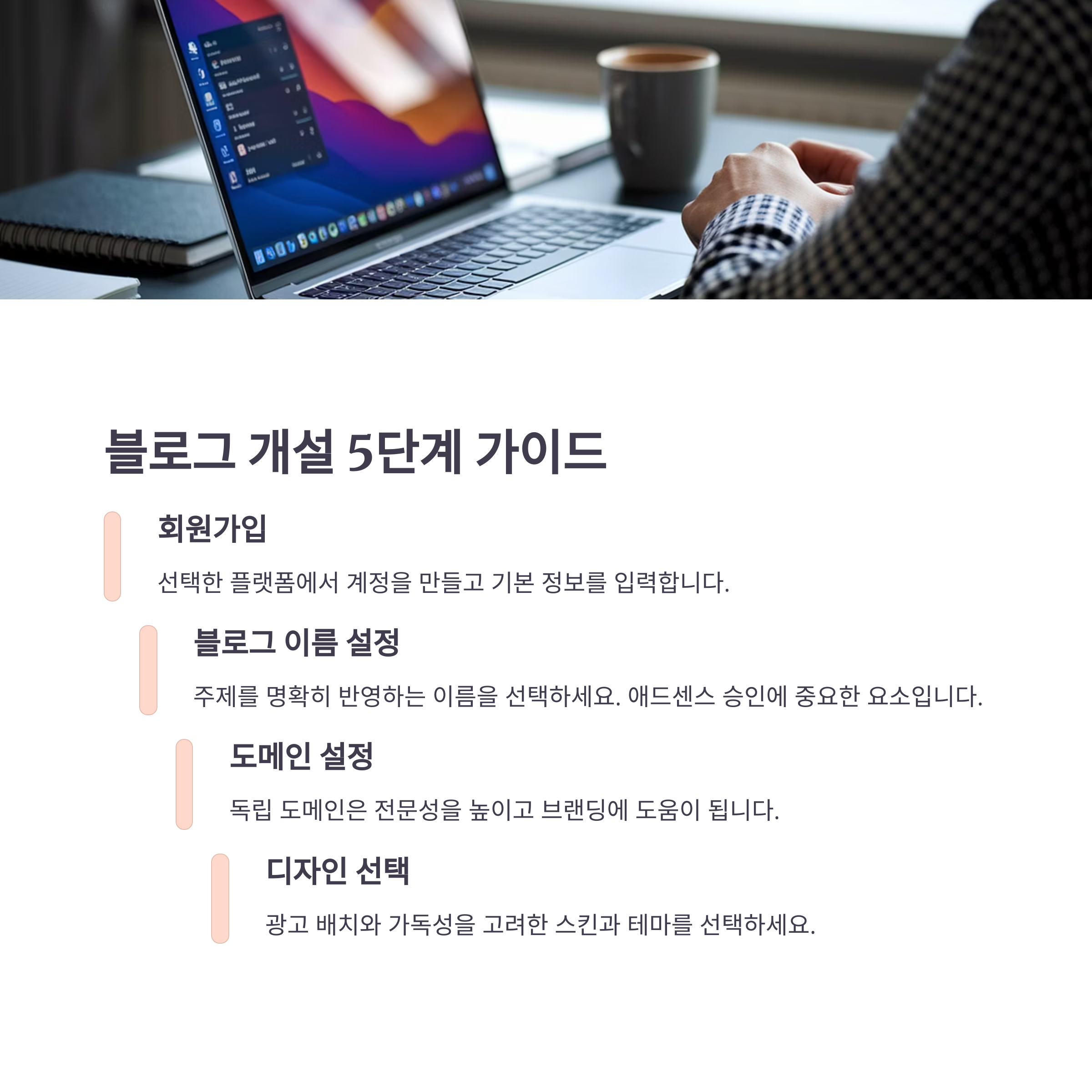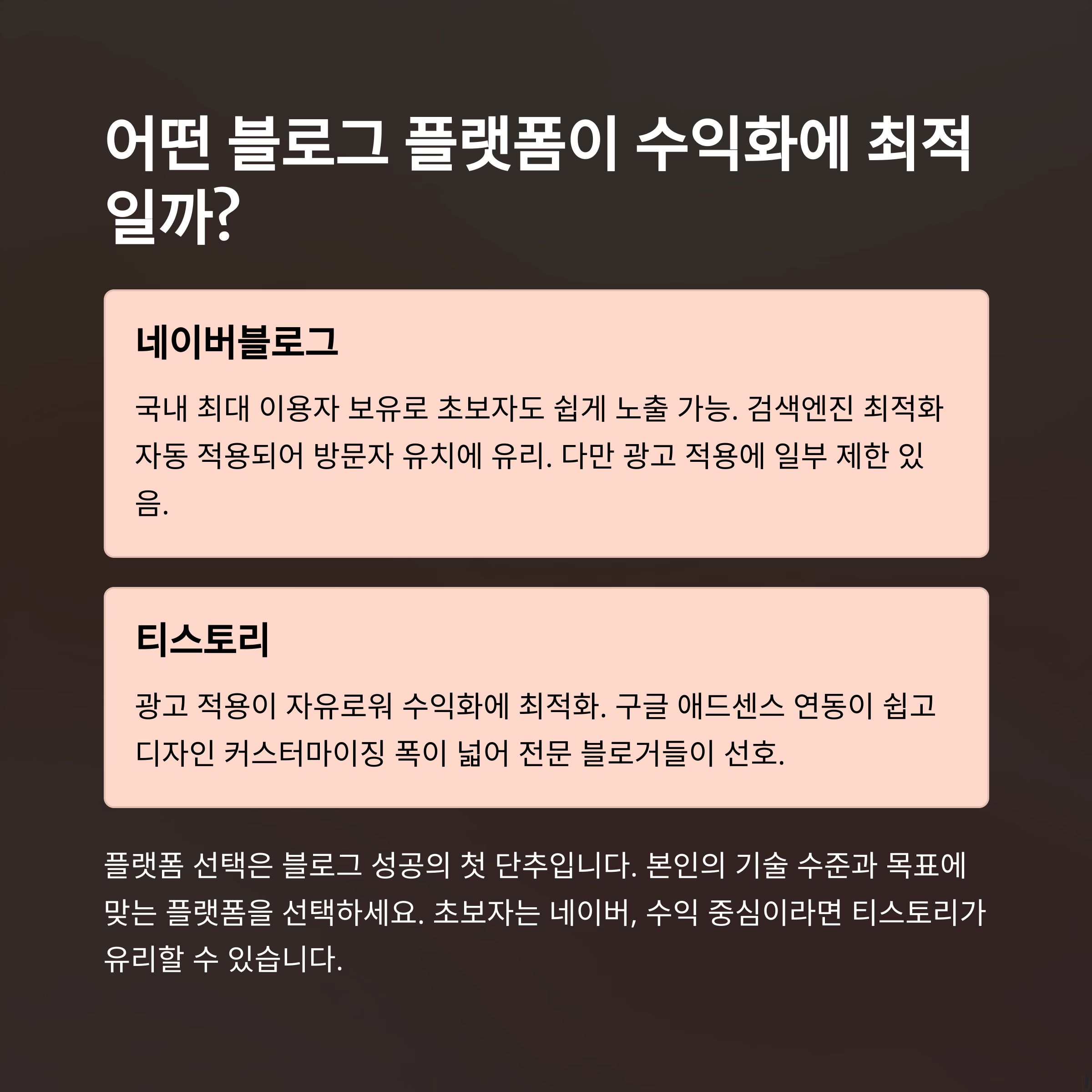 수익형 블로그 성공의 첫 번째 열쇠는 꾸준한 콘텐츠 작성입니다. 플랫폼 선택 시 티스토리는 커스터마이징에 강점이 있습니다.