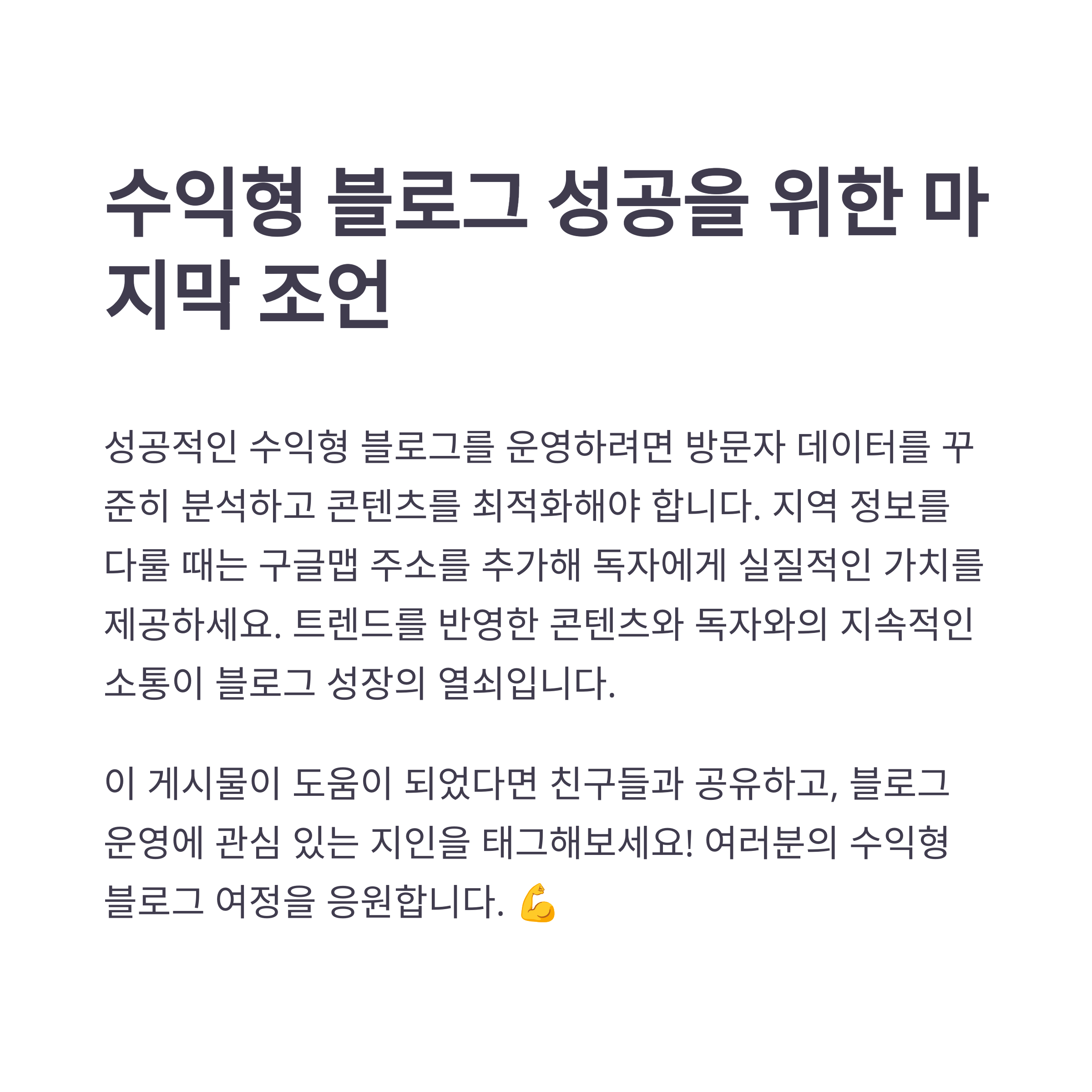 정기적인 콘텐츠 생산과 꾸준한 최적화 작업이 반드시 동반되어야 합니다. 궁극적으로 성공을 위해선 효과적인 광고 배치와 방문자 유도 전략이 필수적입니다. 지금 바로 위의 가이드를 실천해 보고 수익형 블로그의 무한한 가능성을 경험해 보세요.