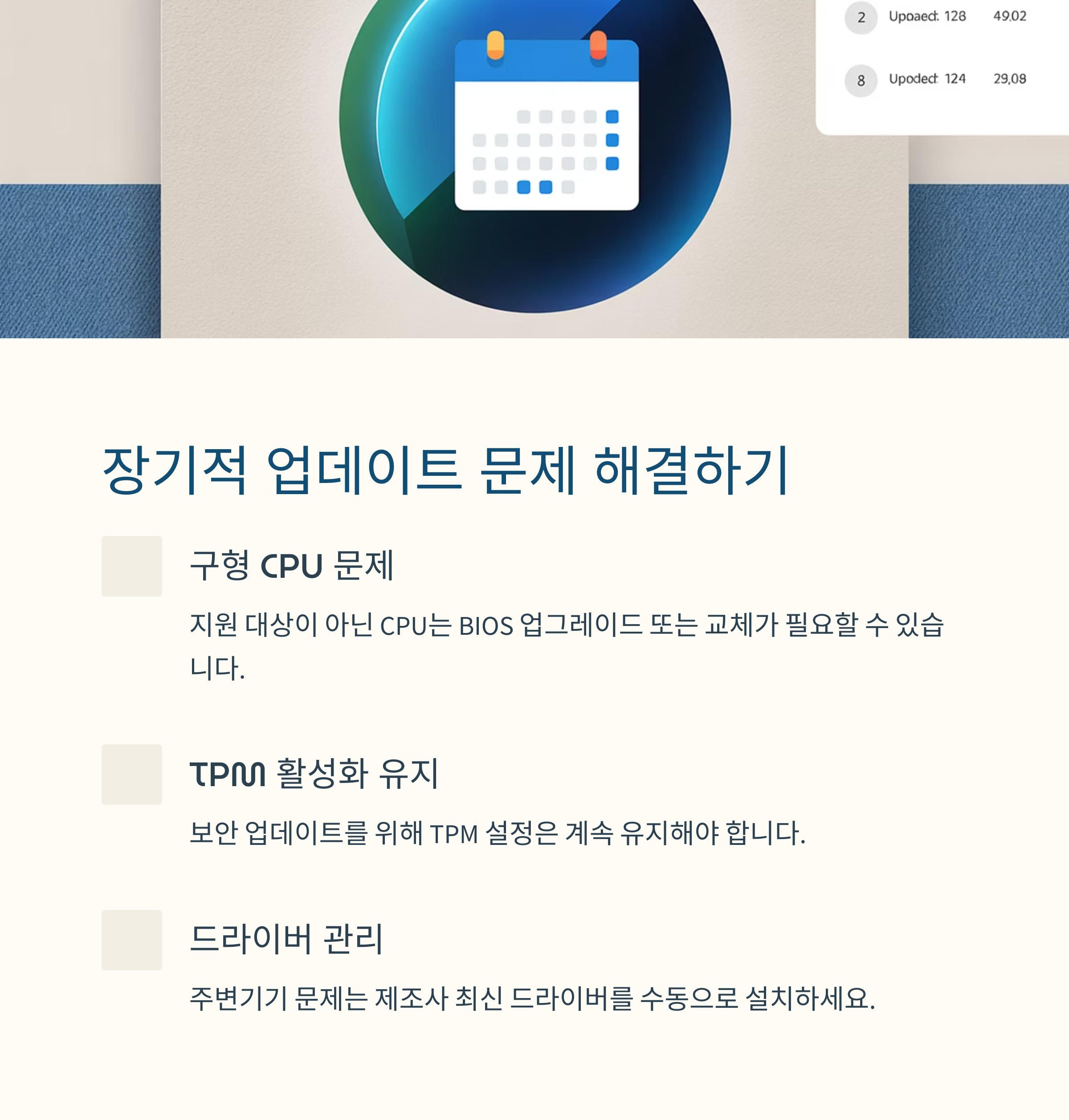 | 구형 CPU 사용 | 기능 제한, 업데이트 오류 | BIOS 업그레이드 또는 CPU 교체 |