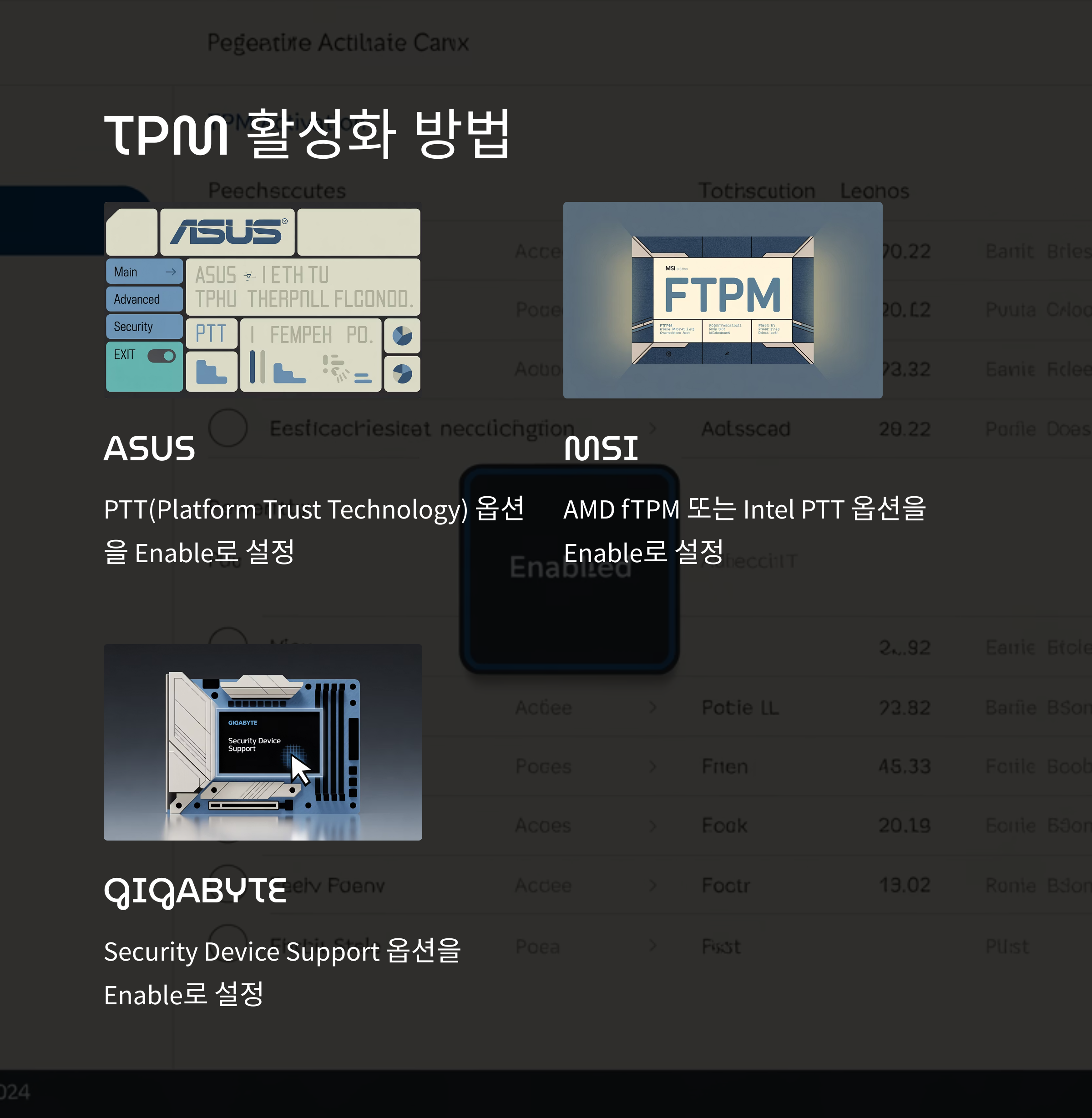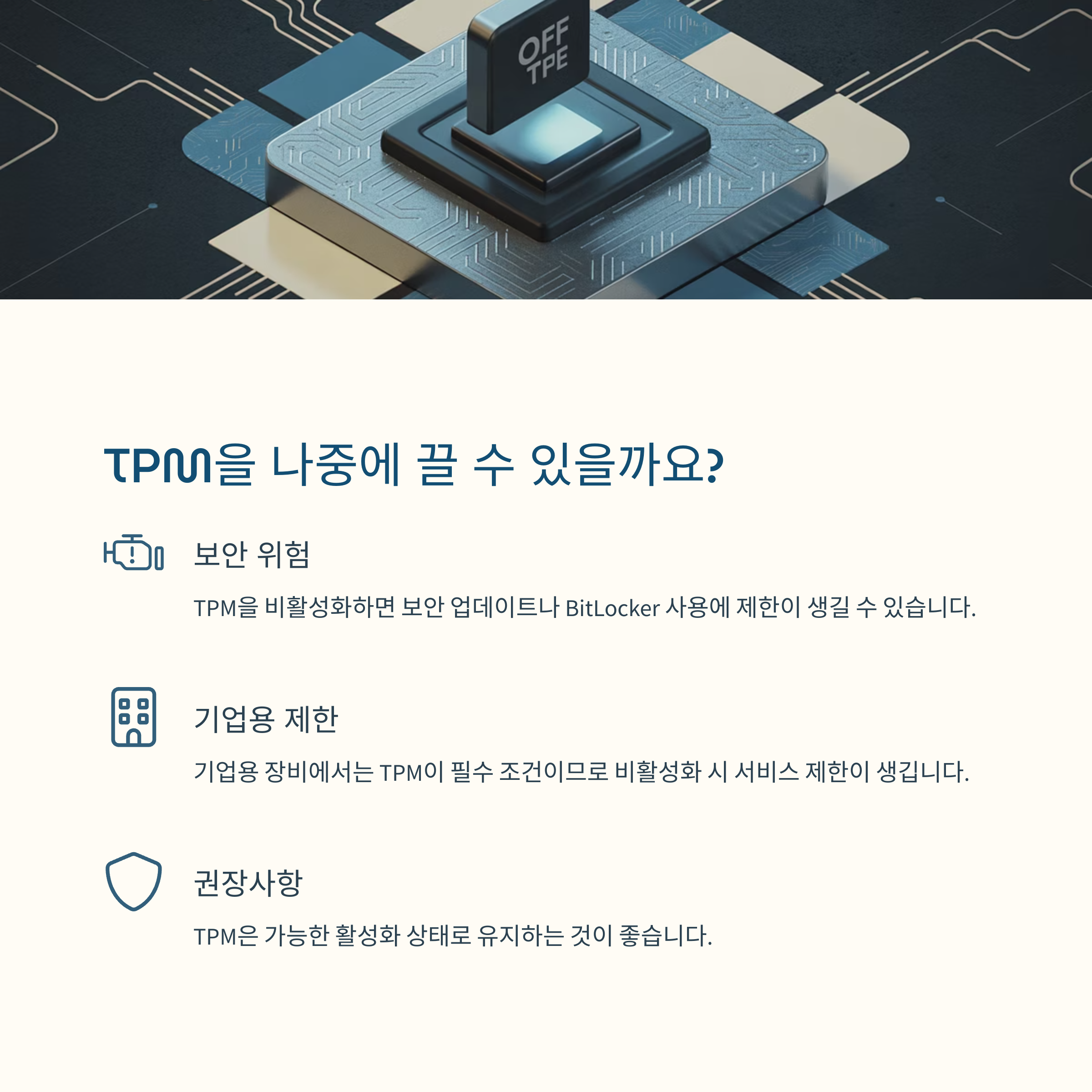 | TPM 비활성화 | 보안 업데이트 미지원 | TPM 설정 유지 |