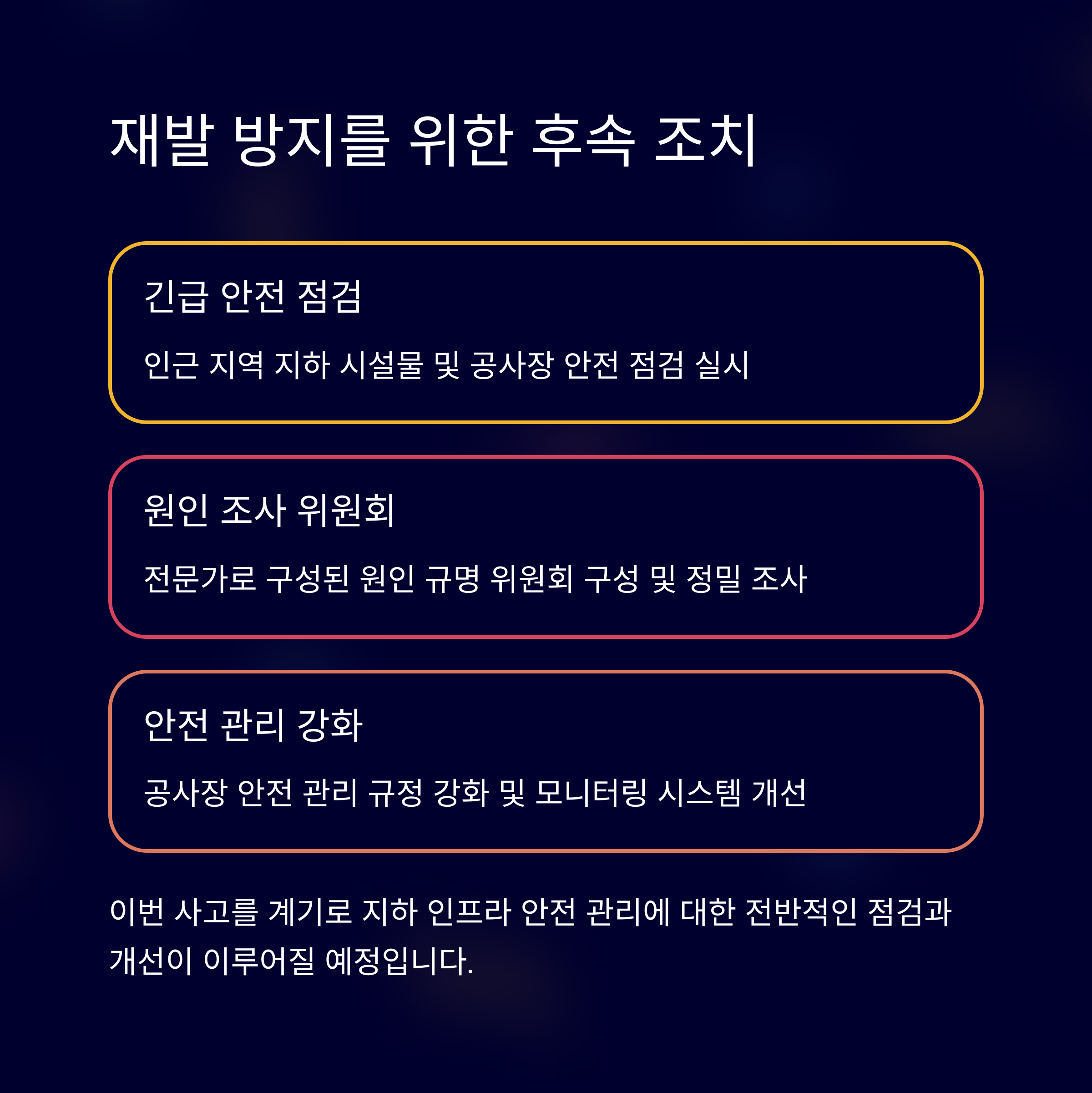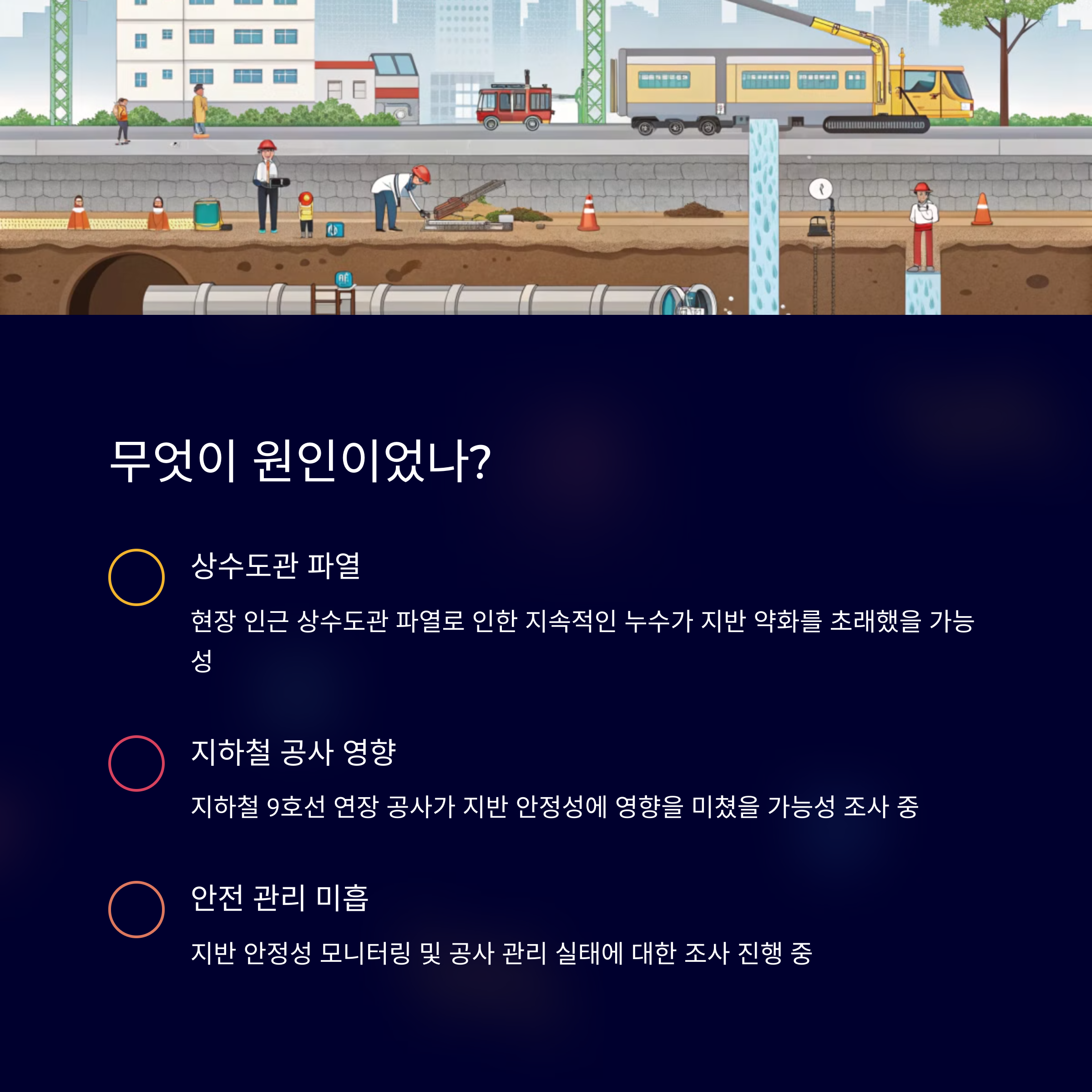 명일동 싱크홀 사고는 갑작스럽게 발생한 자연재해처럼 보일 수 있으나, 자세히 들여다보면 인재의 가능성이 제기됩니다. 싱크홀이 발생한 지역은 지하철 9호선 연장 공사와 인접해 있으며, 상수도관 파열도 함께 발견되었습니다. 이는 단순한 사고가 아니라 지반 안정성 관리의 실패일 수 있으며, 해당 사고의 법적 책임 소재가 중요하게 다뤄지는 이유입니다. 현재 서울시와 강동구청, 그리고 공사 시공사 측은 원인 분석과 책임 소재를 밝히기 위한 정밀 조사에 착수했습니다. 이러한 조사 결과에 따라 피해자와 유가족이 받을 수 있는 보상의 방향이 달라지게 됩니다.