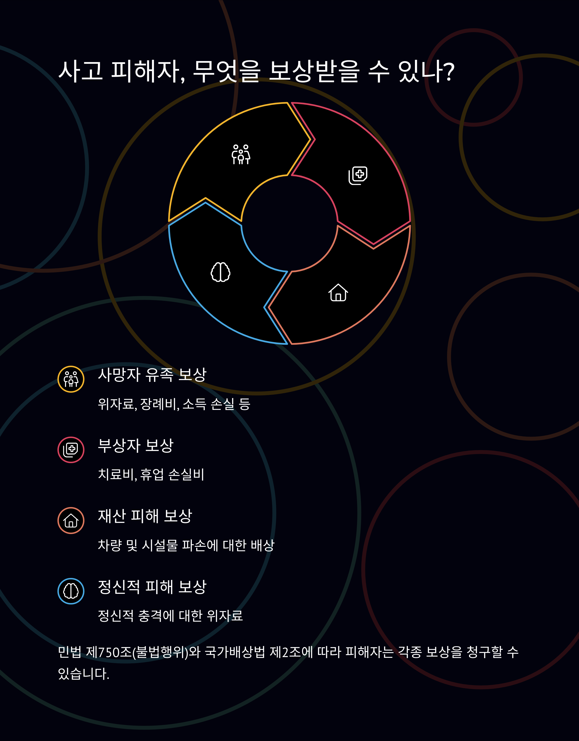 이번 사고의 피해자는 사망 및 경상을 포함하고 있으며, 해당 상황에 따라 민법 또는 국가배상법을 통해 보상을 청구할 수 있습니다. 특히 민법 제750조는 과실이나 고의로 타인에게 피해를 준 경우 손해배상 책임이 발생한다고 명시합니다. 만약 공사 시공사의 관리 소홀로 사고가 발생했다면 시공사에 민사 소송을 제기할 수 있으며, 국가 또는 지방자치단체의 관리 부실이라면 국가배상법에 따른 청구도 가능합니다. 사망자의 유족은 위자료, 장례비, 손실 소득 등을 청구할 수 있고, 부상자는 치료비, 휴업 손실, 후유 장애에 대한 보상을 받을 수 있습니다.