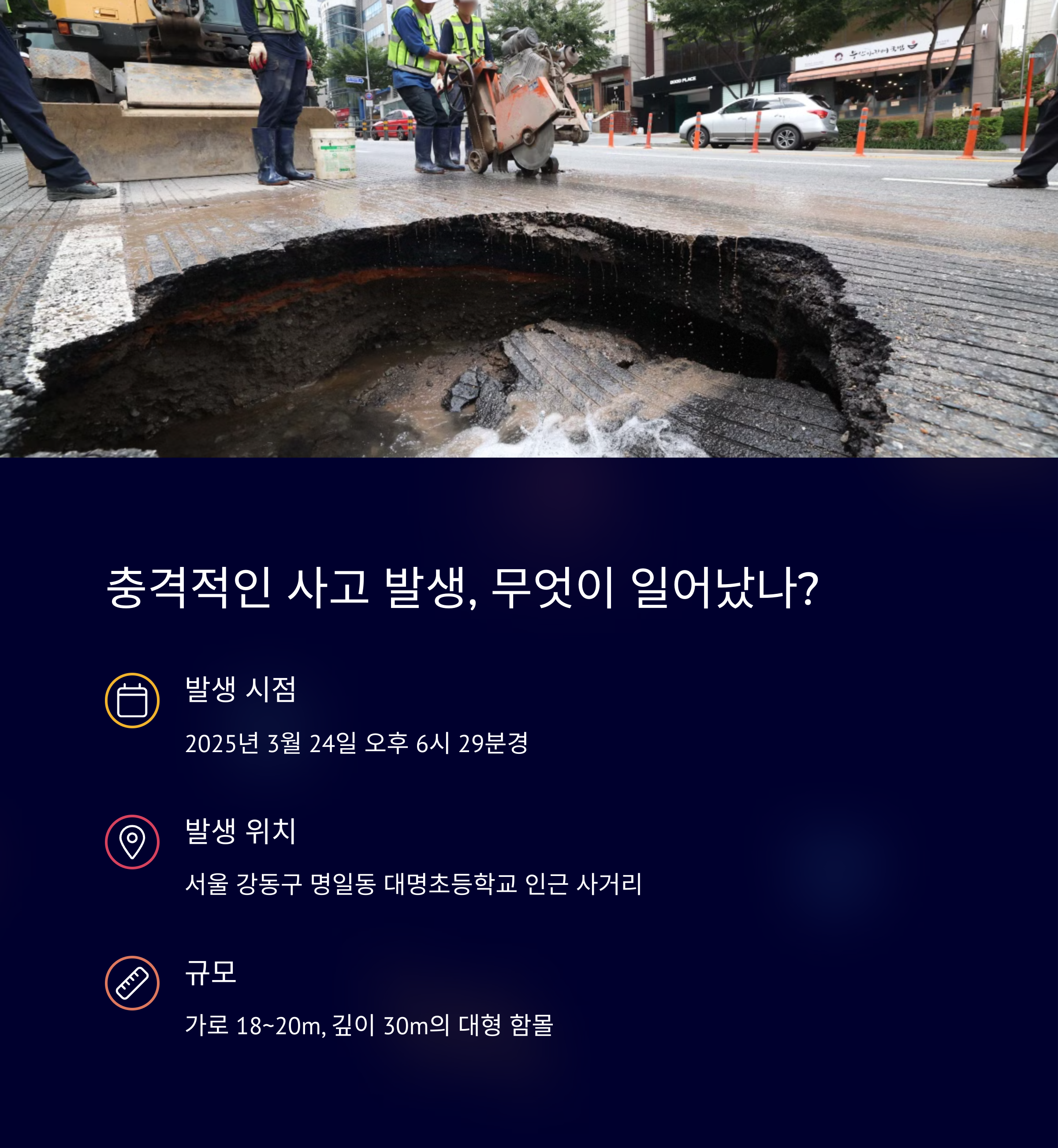 | 사고 개요 | 2025년 3월 24일 서울 명일동에서 대형 싱크홀 발생 |
