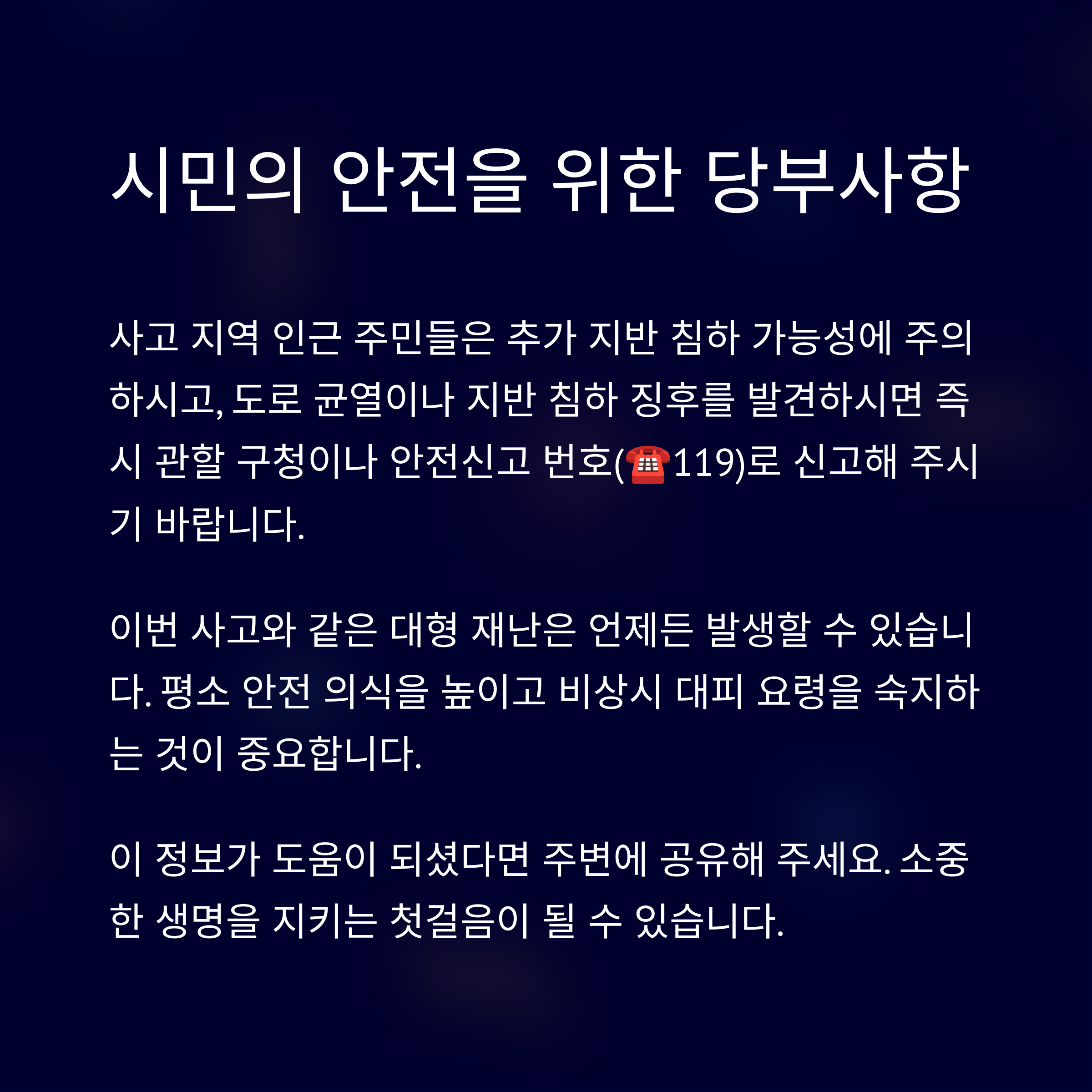 명일동 싱크홀 사고는 단순한 도로 함몰 이상의 문제를 내포하고 있습니다. 도시 인프라의 노후화, 공공 시설 관리의 부실, 그리고 사고 대응 체계의 미흡함이 반복되고 있습니다. 이러한 재난은 언제든 우리의 일상 속에서 발생할 수 있으며, 그로 인한 피해는 매우 큽니다. 피해자와 유가족은 민법, 국가배상법 등 법률을 바탕으로 정당한 보상을 청구할 수 있으며, 서울시와 관련 기관은 책임 소재를 명확히 하여 재발 방지를 위한 조치를 취해야 합니다. 더불어 우리는 이 사건을 계기로 도시 안전 점검과 예방 조치가 얼마나 중요한지를 다시 한 번 인식해야 하며, 사회 전반에 걸쳐 근본적인 시스템 개선이 필요합니다.