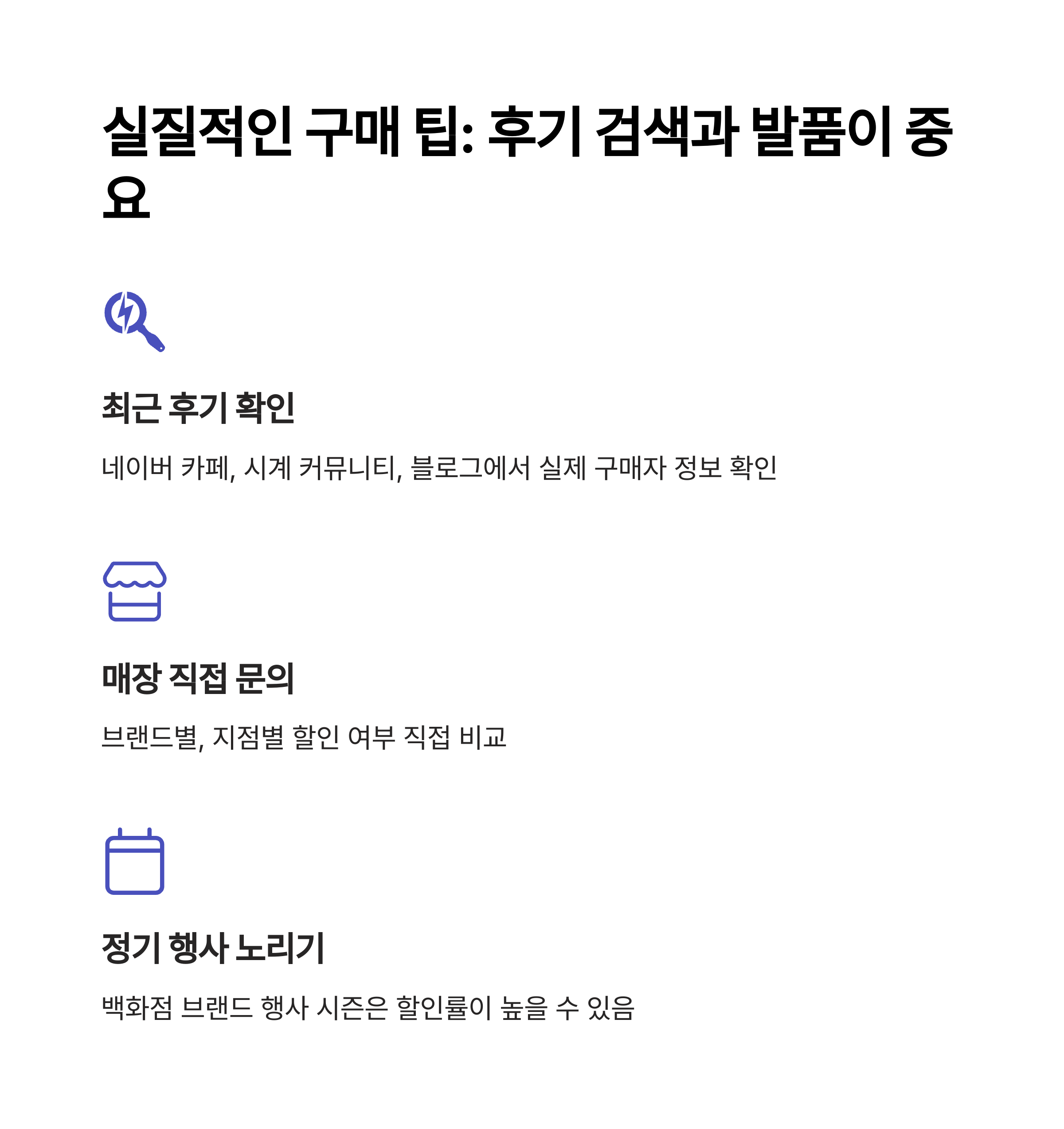 | 정기 행사 노리기 | 백화점 브랜드 행사 시즌은 할인률이 높을 수 있음 |