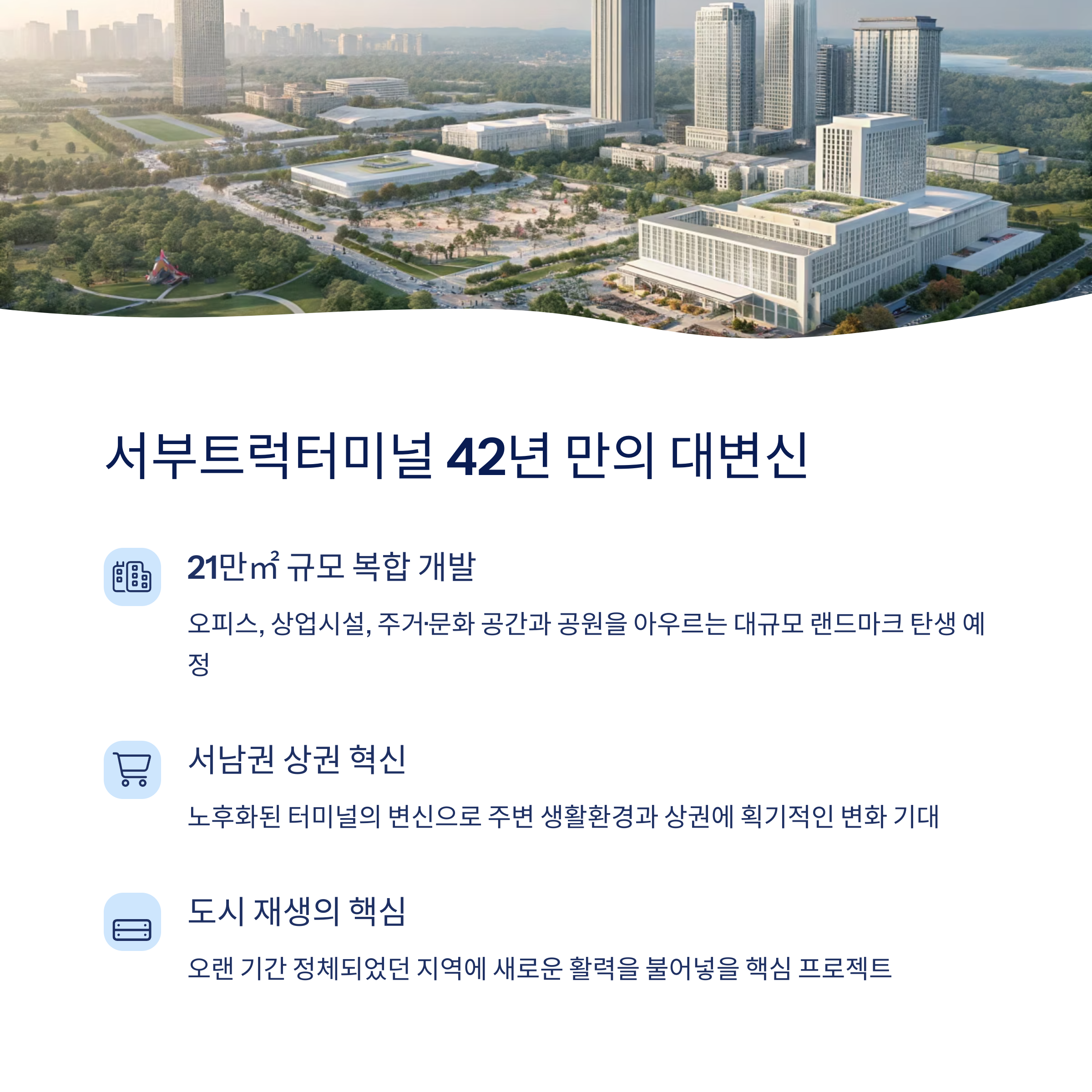 예비타당성조사 통과 시역세권 프리미엄 급상승, 대기매물 소진 예상. - 서부트럭터미널 상권 확대–주거·상업 복합단지 주변 가치 폭등