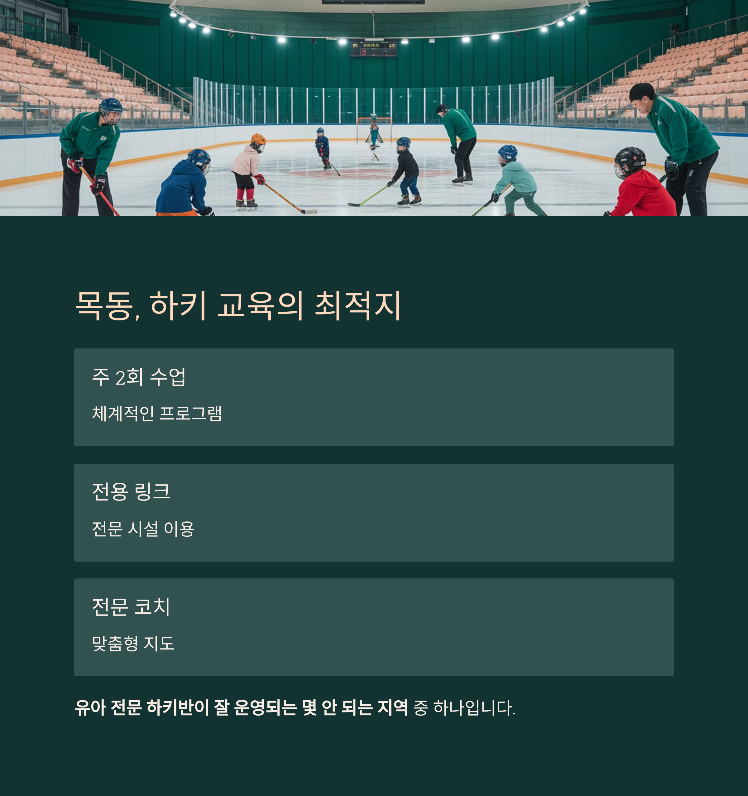 주 2회 수업, 전용 링크, 전문 코치, 같은 또래 아이들과의 자연스러운 경쟁.