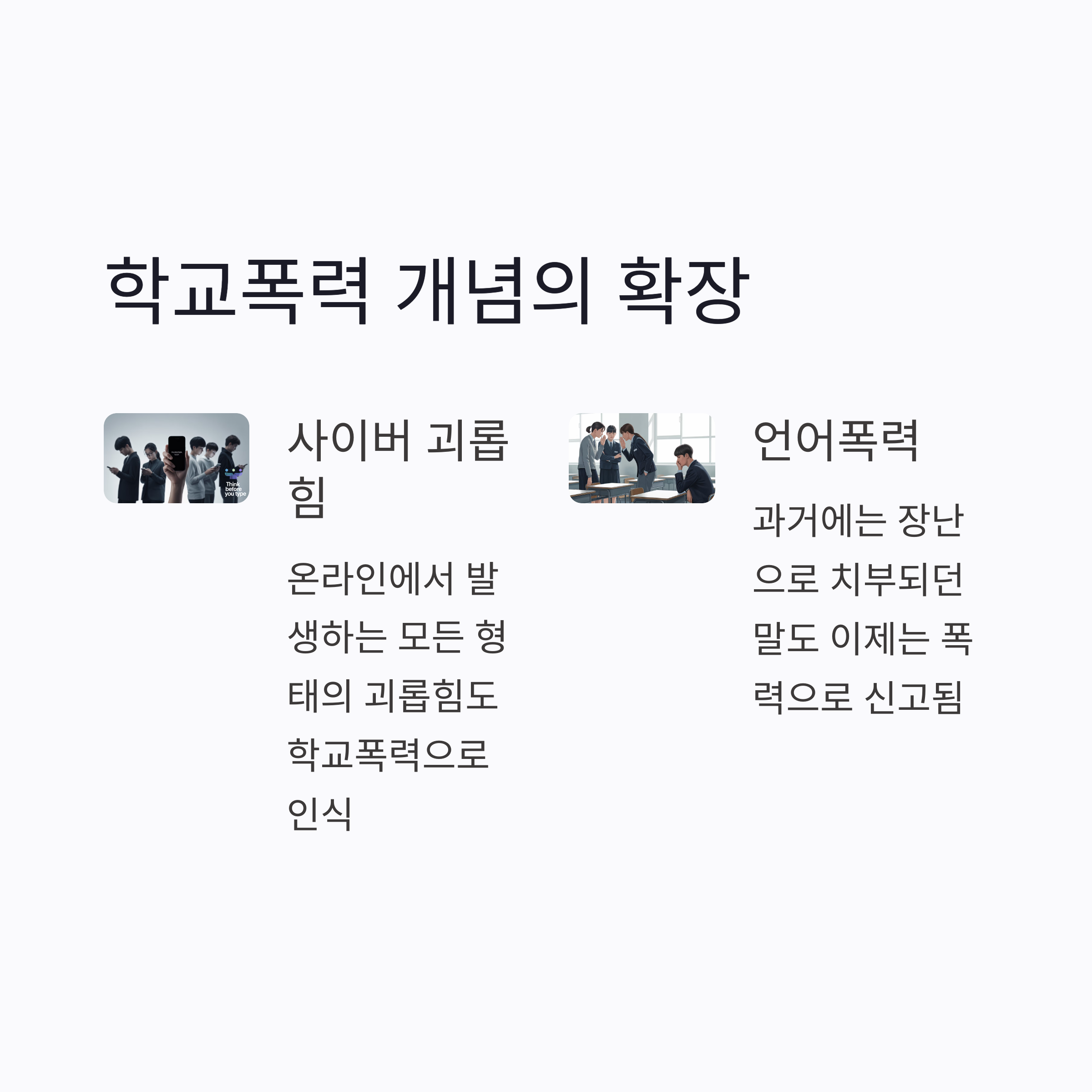 최근 몇 년간 학교폭력의 정의와 인식이 확장되었습니다.