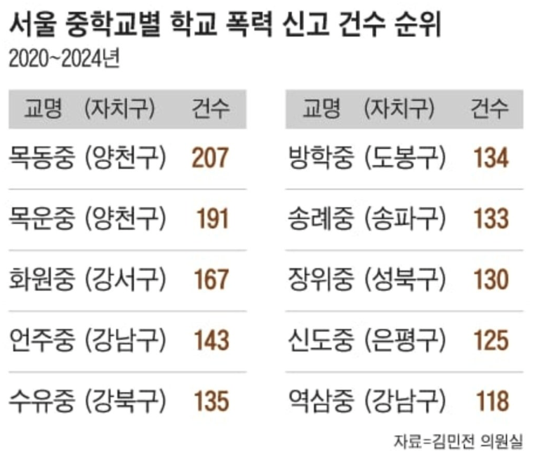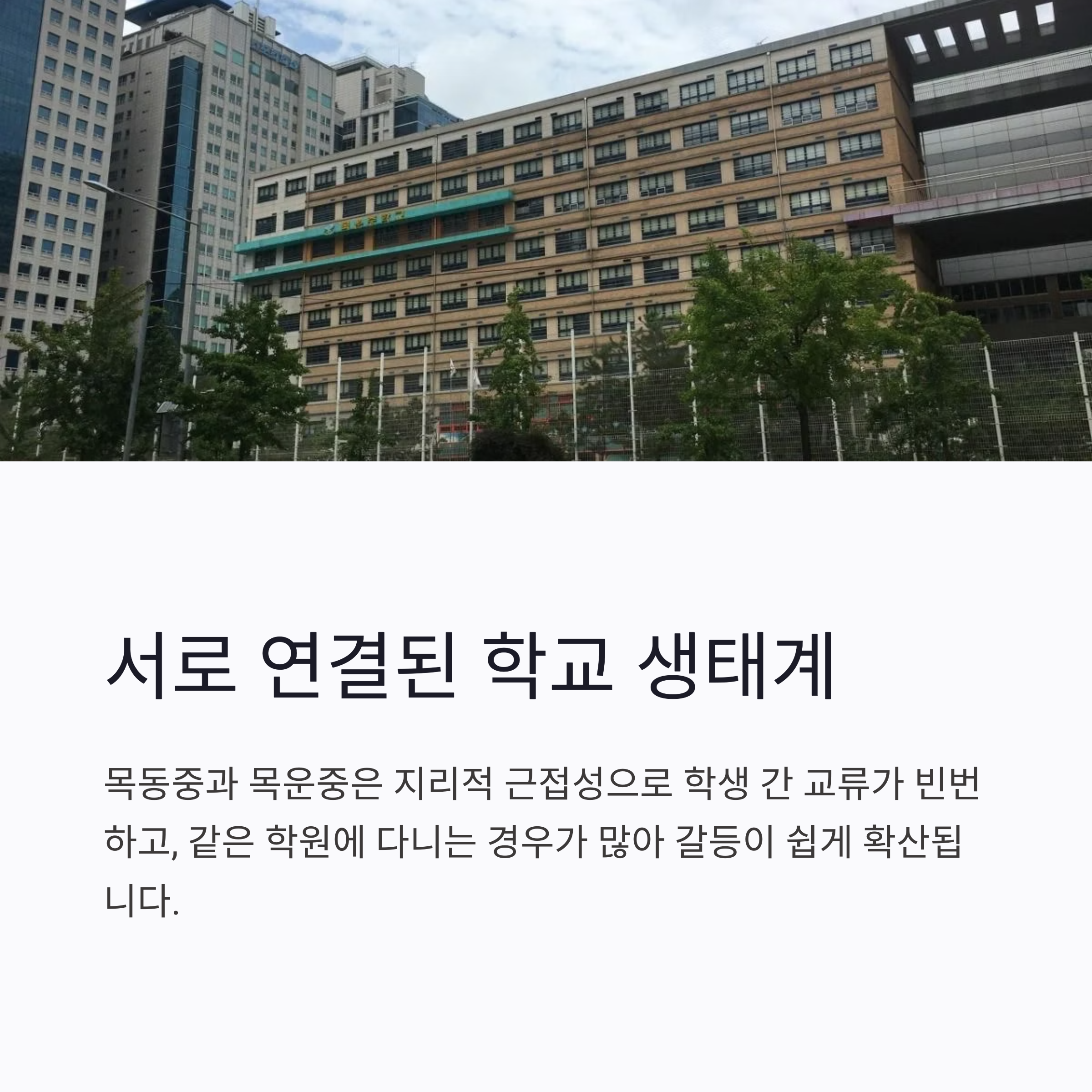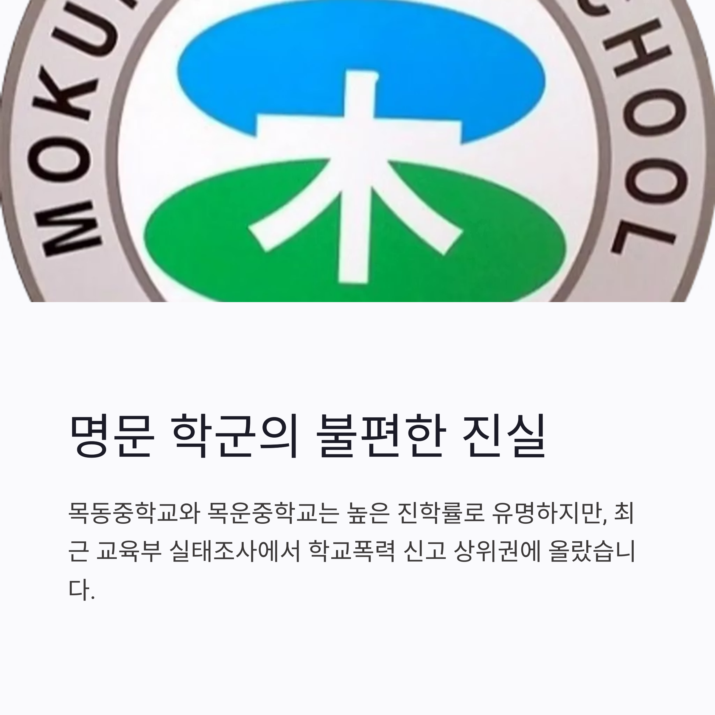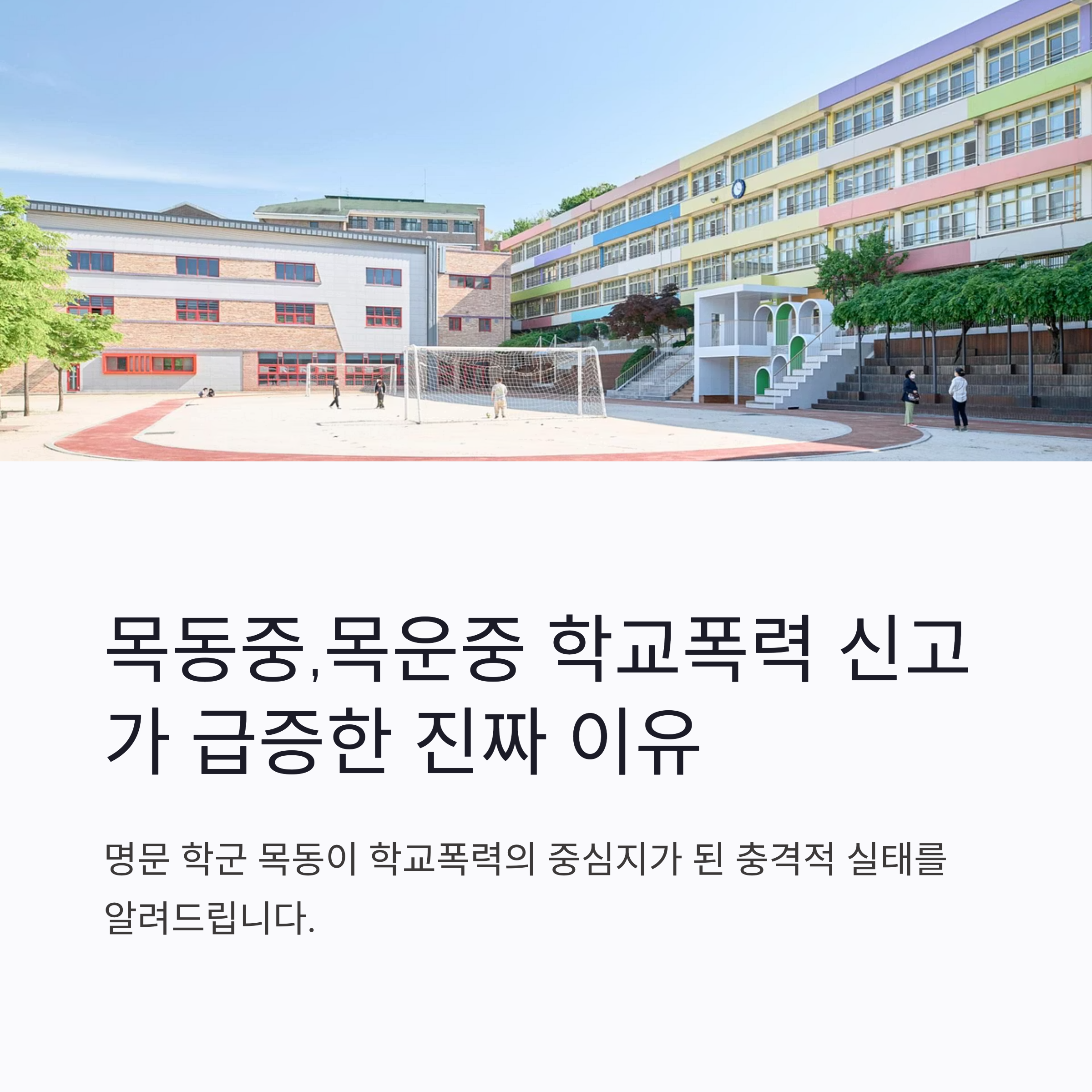 서울 양천구 목동은 전통적인 명문 학군으로 꼽히는 지역입니다. 그 중심에 있는 목동중학교와 목운중학교는 높은 진학률과 학부모 관심을 받는 학교지만, 최근 교육부 실태조사에서 학교폭력 신고 상위권에 이름을 올리며 우려의 목소리가 커지고 있습니다. 이번 글에서는 왜 이들 학교가 문제의 중심에 놓였는지 그 배경과 원인을 정리해드립니다.