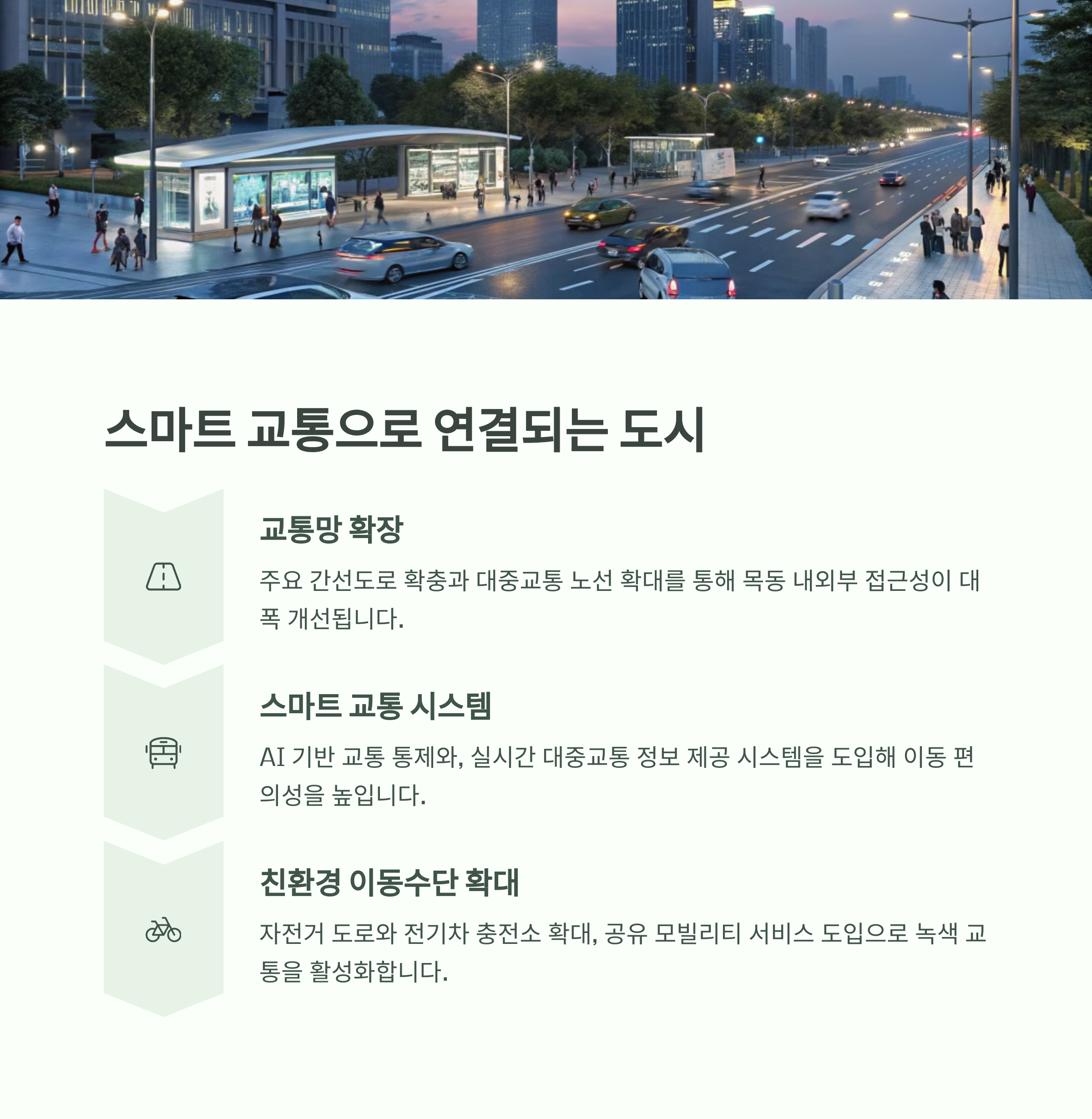 목동은 교통의 중심지로서 중요한 위치에 있지만, 교통 체증 문제는 여전히 해결해야 할 과제입니다. 이를 해결하기 위해, 도시개발 계획에는 교통망 확장과 개선이 중요한 요소로 포함되어 있습니다. 2030년까지 목동 일대는 지하철 노선 추가와 도로 확장, 스마트 교통 시스템 등을 통해 더욱 효율적인 교통 체계를 구축할 예정입니다. 이를 통해 주민들은 더욱 빠르고 편리한 교통 수단을 이용할 수 있게 될 것입니다.