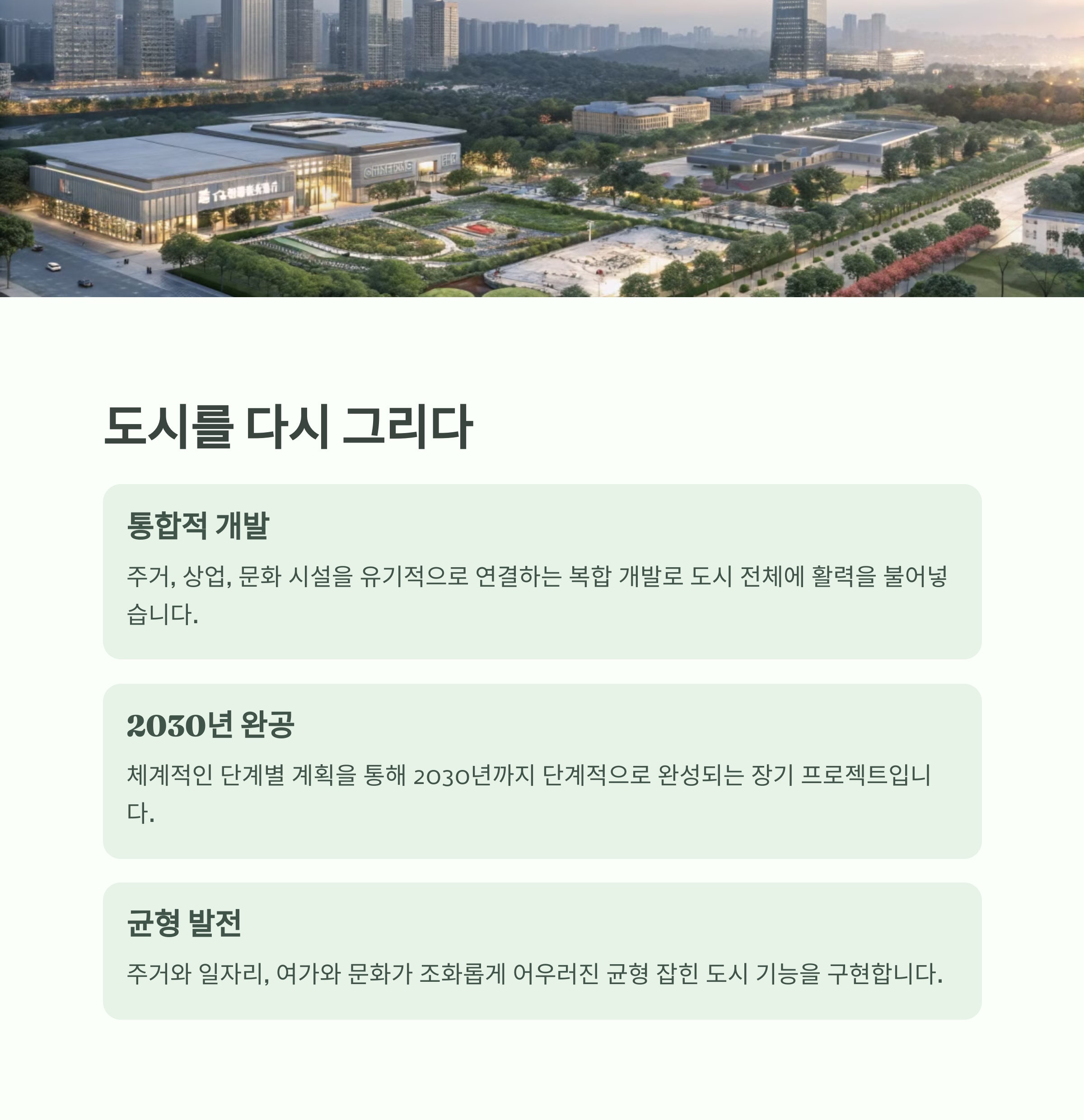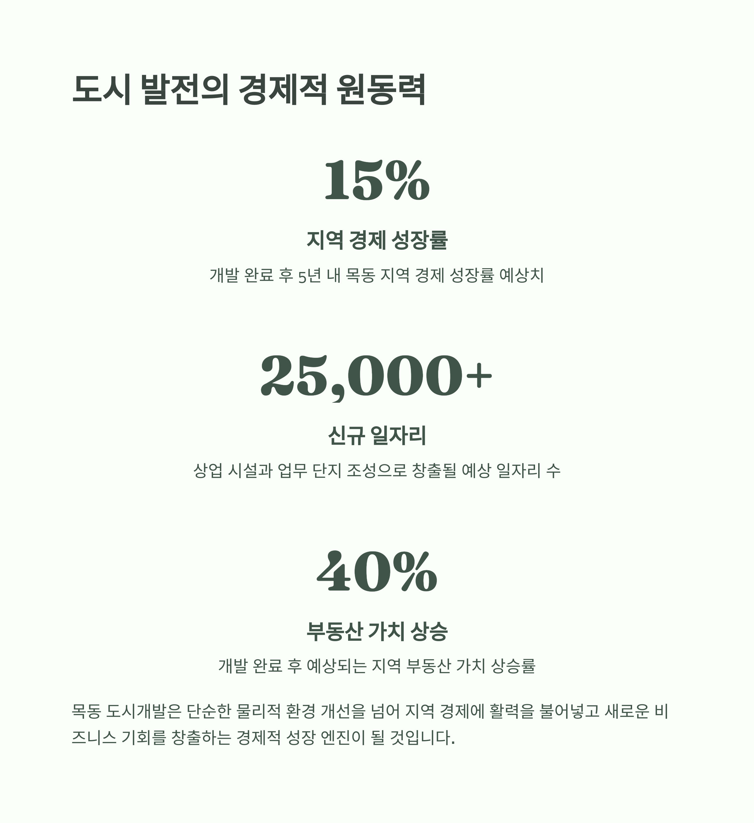 목동 도시개발 프로젝트는 단순히 주거지 개발을 넘어서 상업과 문화 공간을 확장하는 것을 목표로 합니다. 이를 통해 지역 경제 활성화는 물론, 주민들의 문화적 여가를 충족시킬 수 있는 시설들이 구축됩니다. 대형 쇼핑몰, 문화센터, 공원 등이 포함된 개발 계획은 목동을 더 매력적인 지역으로 만들어줄 것입니다.