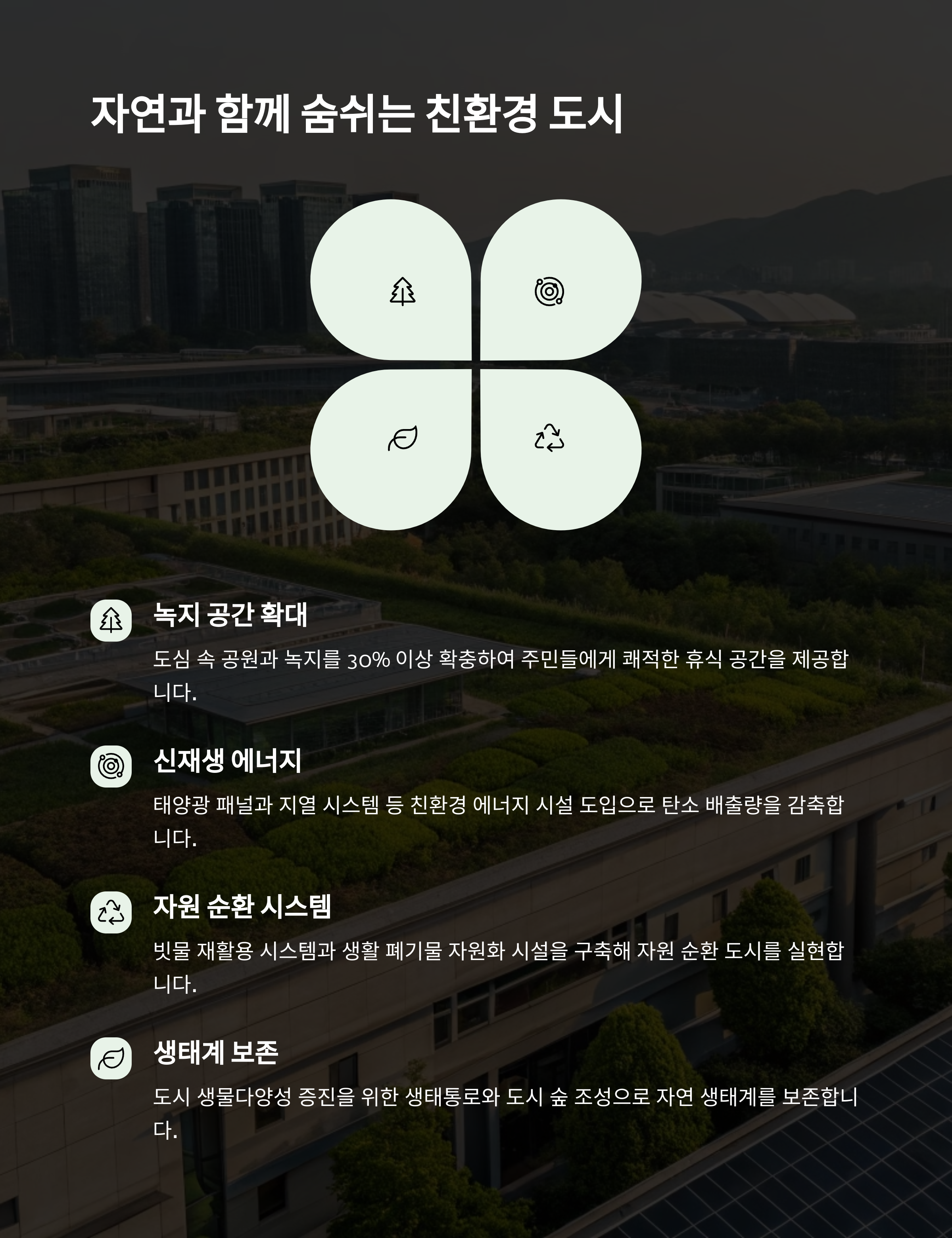 목동 도시개발은 환경을 고려한 개발을 중요한 원칙으로 삼고 있습니다. 재개발과 재건축 과정에서 기존의 자연 환경을 최대한 보호하고, 친환경 건축 자재와 에너지 효율적인 시스템을 도입하여 지속 가능한 도시로 발전할 계획입니다. 또한, 공원과 녹지 공간을 확충하여 지역 주민들에게 쾌적한 생활 환경을 제공할 것입니다.