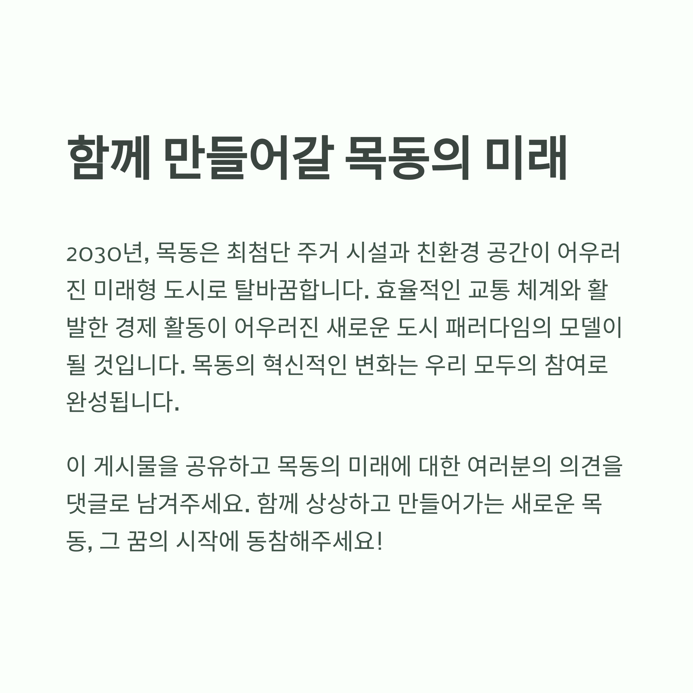 목동 도시개발 프로젝트는 2030년 완공을 목표로 하여, 현재 진행 중인 다양한 사업들이 앞으로 지역 발전에 중요한 역할을 할 것입니다. 재개발, 재건축, 상업지구 확장, 교통망 개선, 환경 친화적인 개발 등을 통해 목동은 더욱 살기 좋은 지역으로 거듭날 것입니다. 이러한 변화는 목동 주민들에게는 더 나은 주거 환경을 제공하고, 서울 전체적으로도 중요한 발전을 이끌어낼 것입니다.