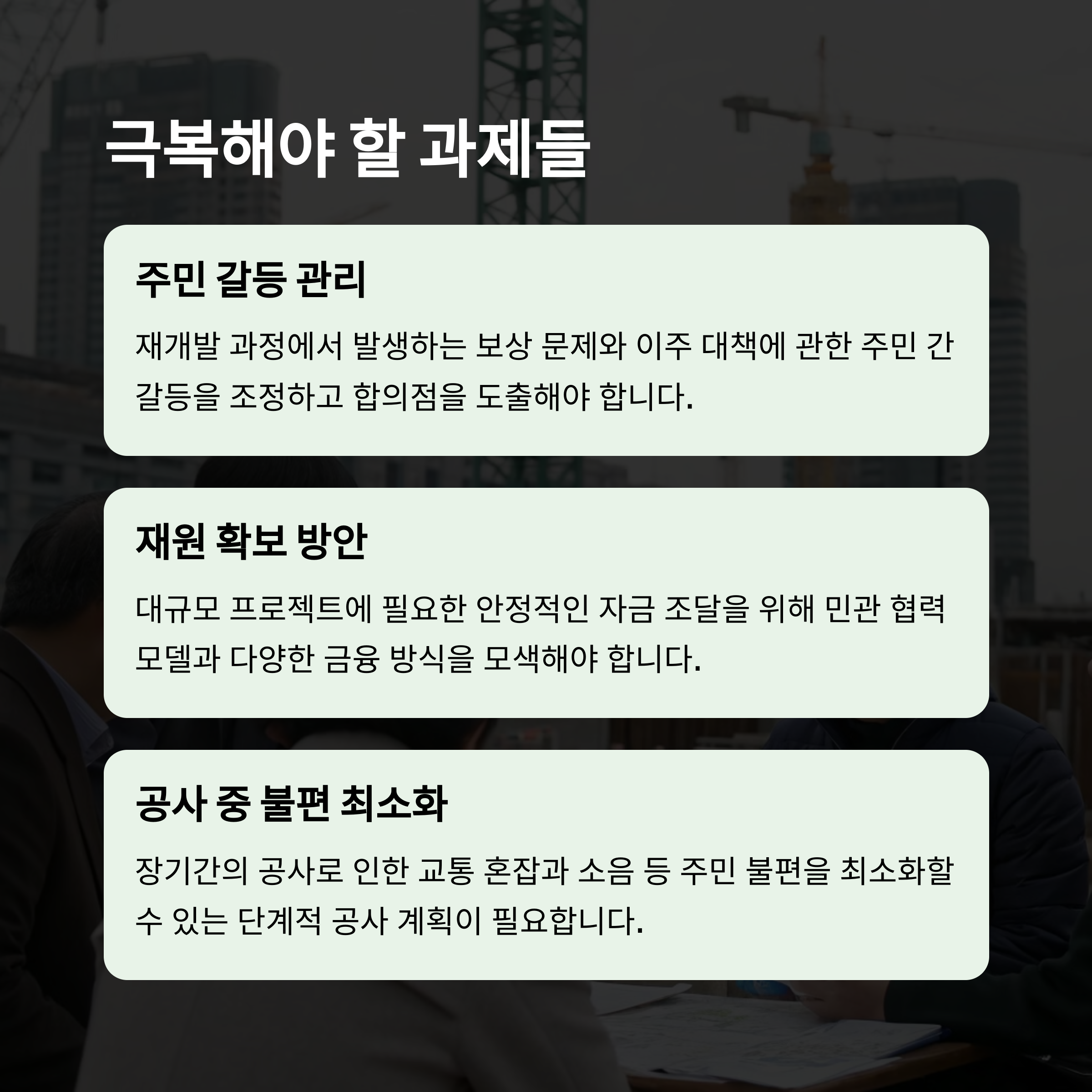 목동 도시개발이 2030년까지 완공되기 위해서는 여러 가지 도전과제가 있습니다. 첫째, 재개발과 재건축 과정에서 발생할 수 있는 주민들의 이주 문제와 갈등을 해결하는 것이 중요합니다. 둘째, 도시개발에 필요한 자금을 확보하고, 효율적으로 배분하는 것이 필수적입니다. 셋째, 환경과 교통 문제를 동시에 해결하는 과정에서 발생할 수 있는 예기치 않은 장애물을 극복해야 합니다.
