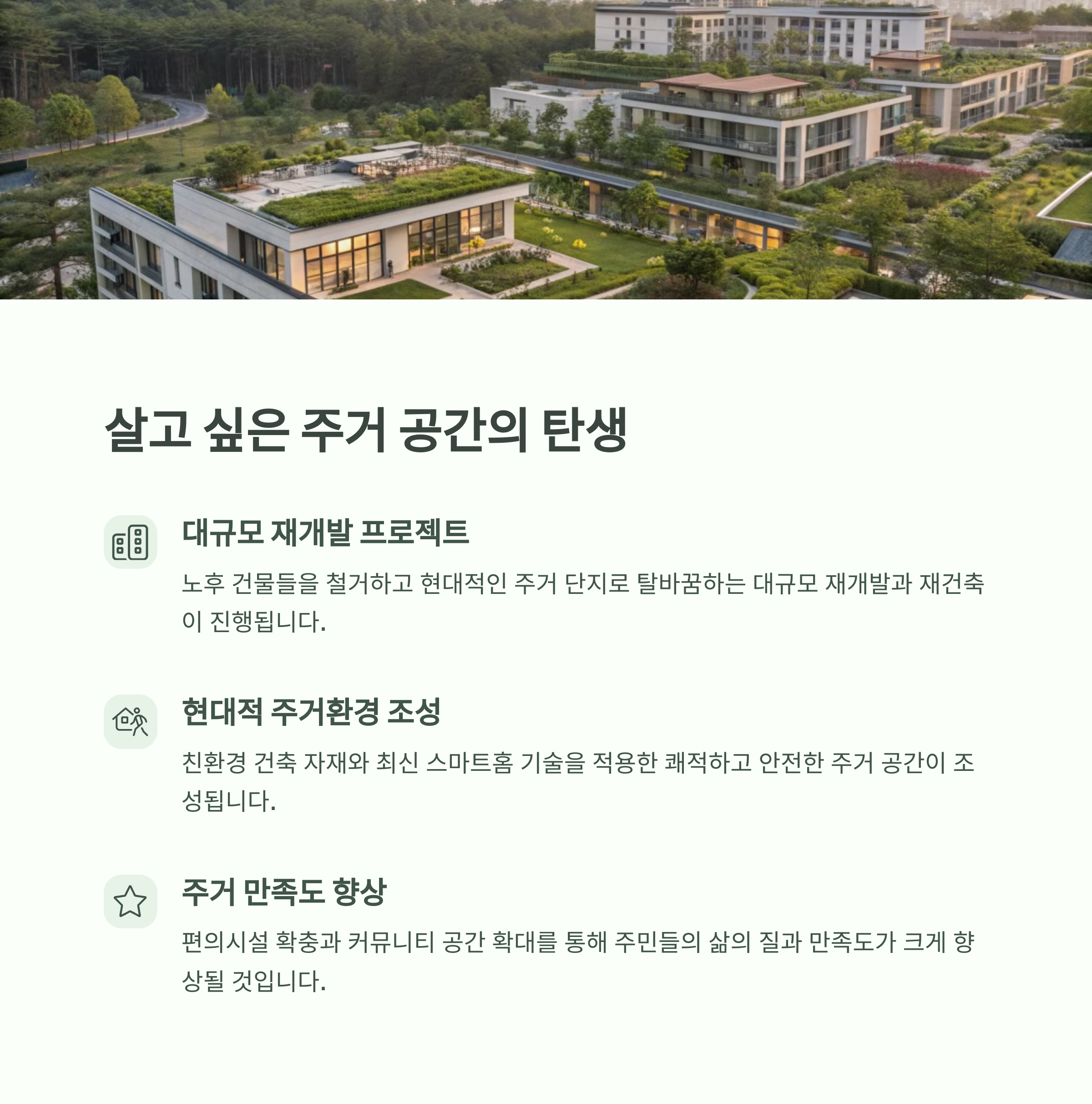 목동의 재개발과 재건축은 도시개발의 핵심적인 부분을 차지합니다. 낡은 건물들을 철거하고 새로운 고층 아파트 단지와 상업시설을 포함한 복합 개발이 진행되고 있습니다. 이로 인해 목동의 주거 환경은 큰 변화를 겪고 있으며, 2030년까지 다양한 생활 편의 시설이 새로 구축될 것입니다. 또한, 재개발 과정에서는 환경 친화적인 건축 기법과 에너지 효율적인 설계가 적용될 예정이어서, 지속 가능한 도시로서의 변화를 이끌 것입니다.