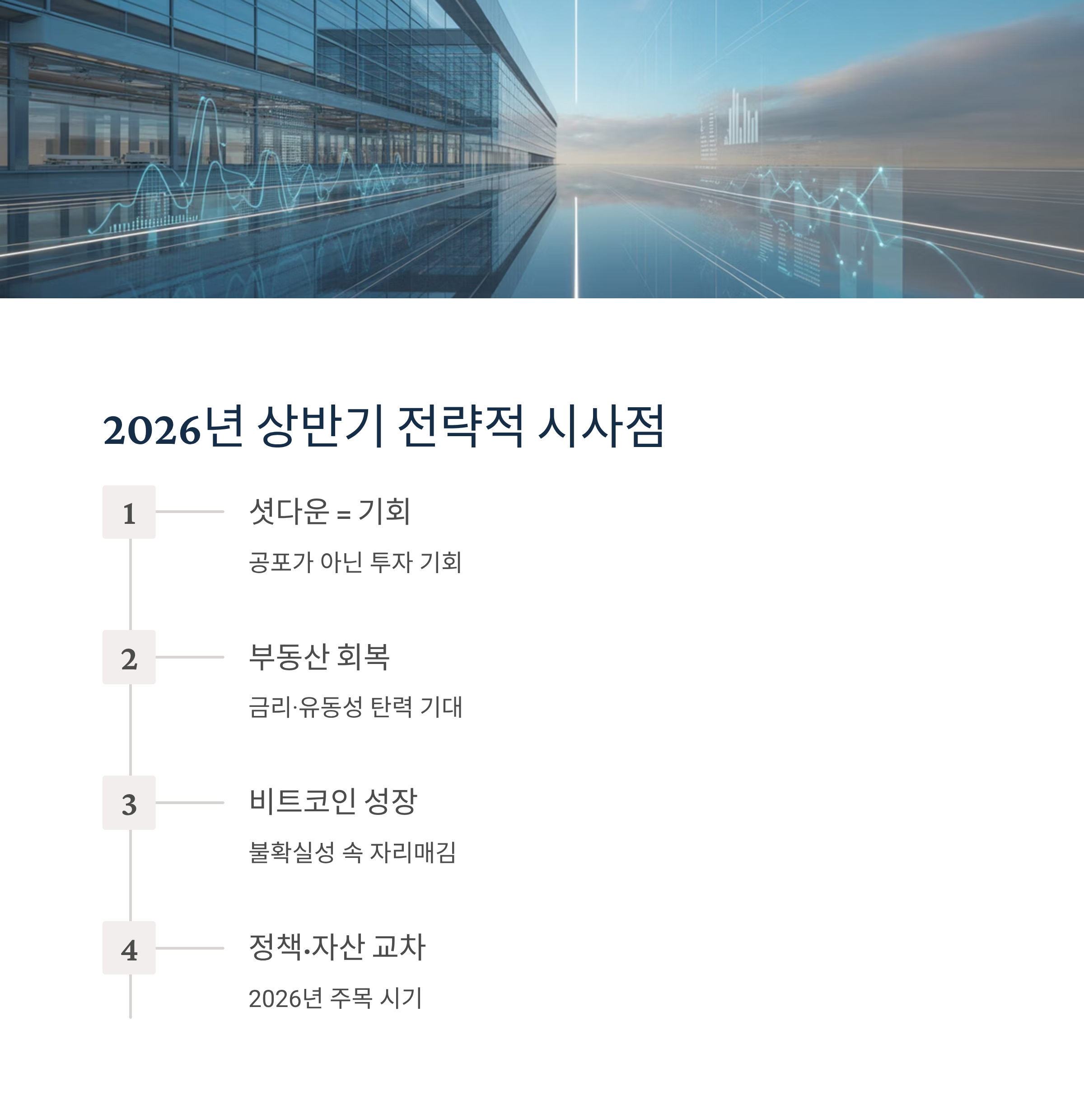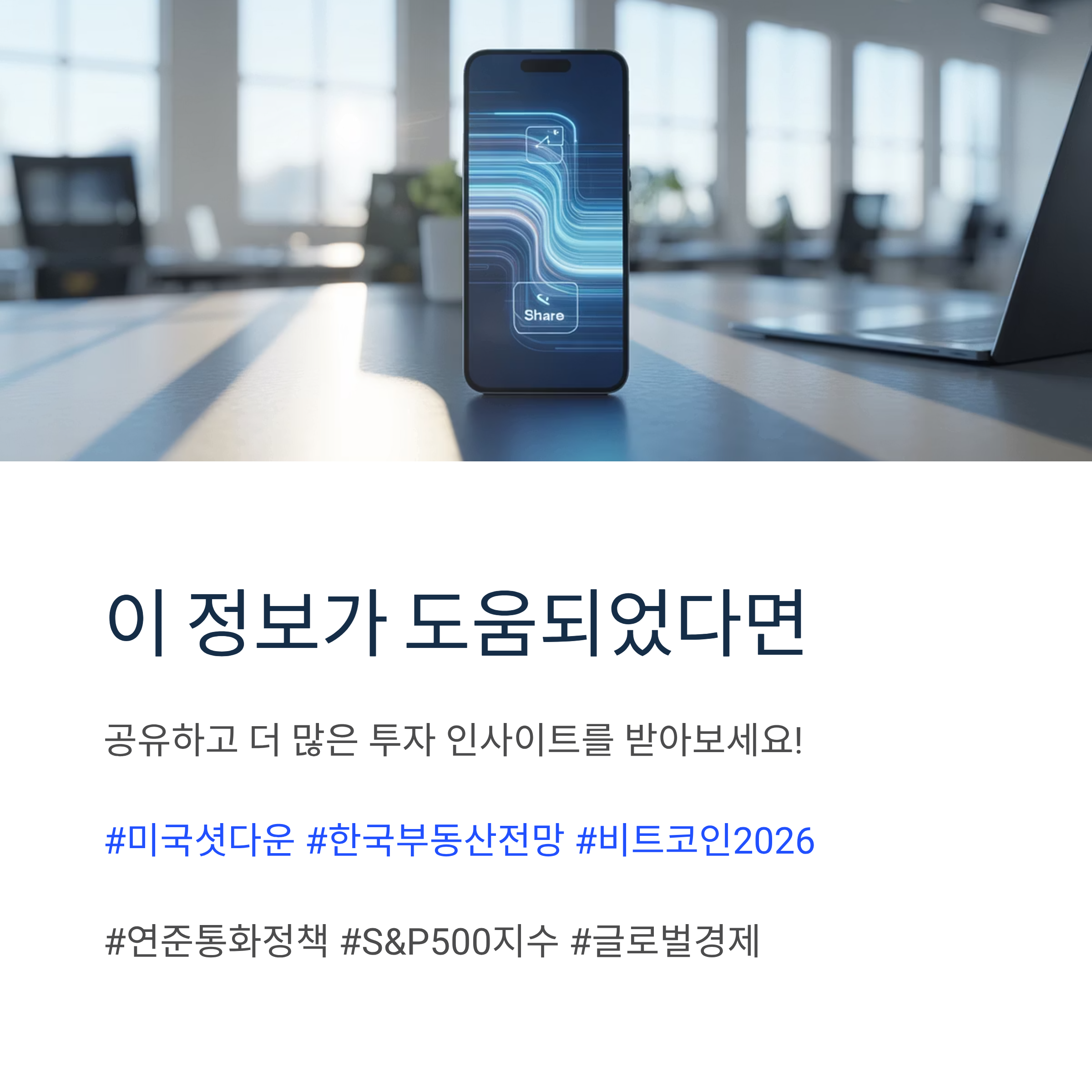 결국 셧다운은 공포가 아니라 투자 기회였습니다. 한국 부동산은 금리 흐름과 유동성에 따라 회복 탄력을 받을 수 있고, 비트코인은 글로벌 불확실성을 먹고 자라나는 자산으로 자리매김할 가능성이 높습니다. 2026년 상반기는 단순한 경기 흐름을 넘어, 정치·정책과 자산시장이 어떻게 교차하는지 주목해야 할 시기입니다.