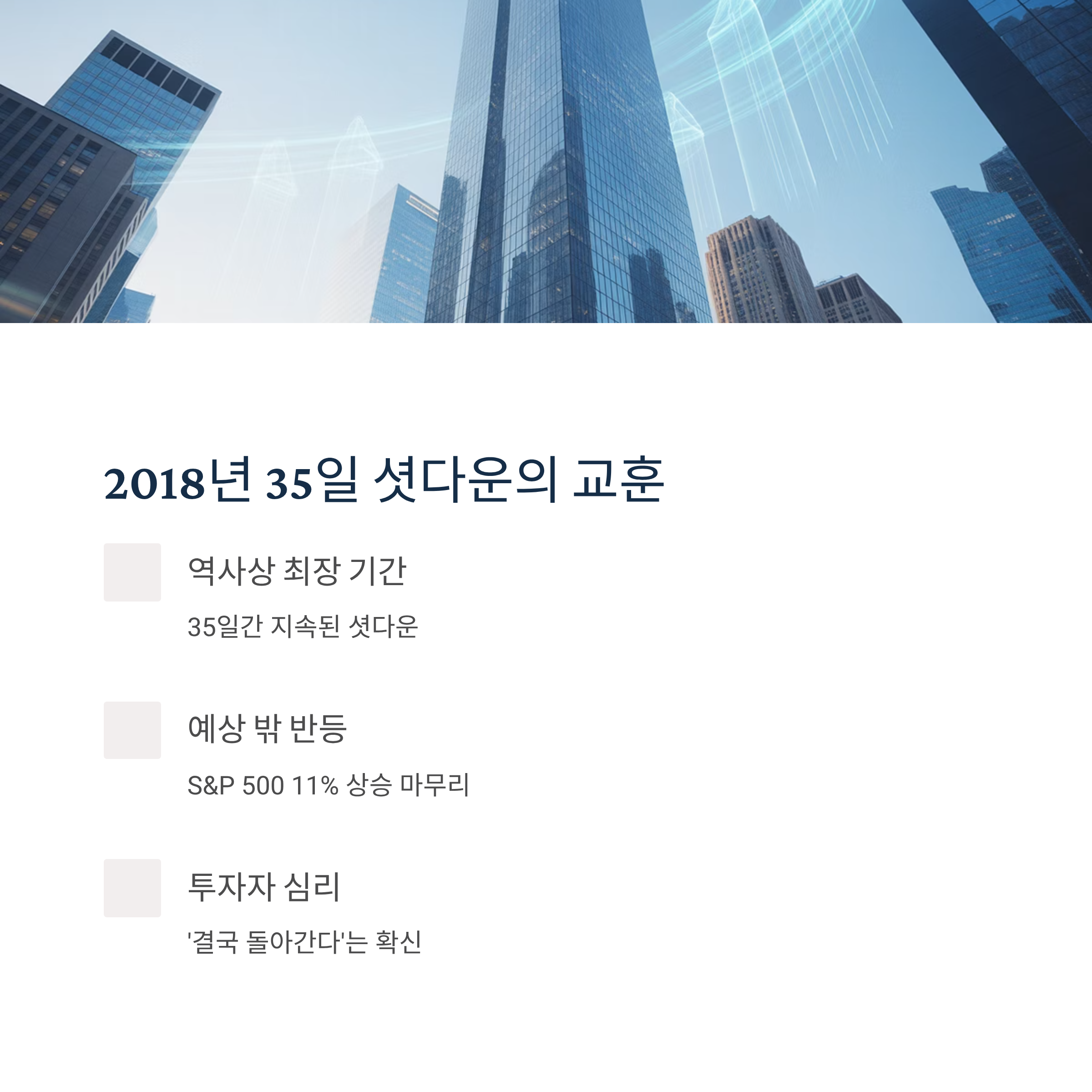 역사상 가장 긴 35일 셧다운이 있었던 2018년, 시장은 예상과 달리 오히려 반등했습니다. 당시 S&P 500은 11% 상승으로 마무리됐죠. 이는 투자자 심리가 ‘정부가 멈췄지만 결국 돌아간다’는 확신으로 작동한 사례라 할 수 있습니다. 한국 투자자 입장에서도 단기 변동성보다는 중장기 방향성을 읽는 것이 중요하다는 메시지를 줍니다.
