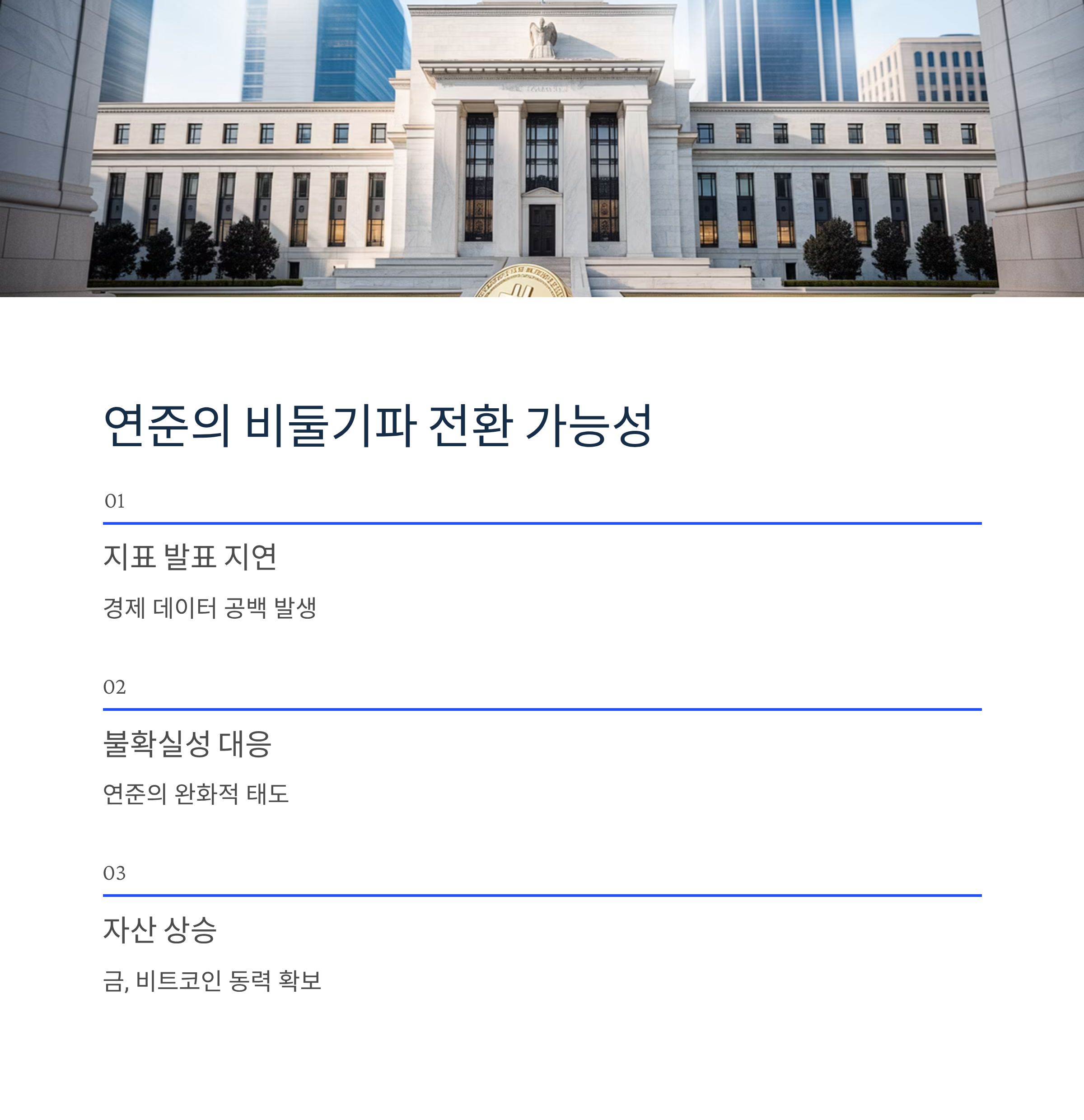 셧다운 기간에는 경제 지표 발표가 지연됩니다. 그러면 연준은 불확실성 속에서 보다 완화적인 태도를 취하는 경우가 많습니다. 금리 동결이나 인하 같은 신호가 빨리 나오면서, 주식뿐 아니라 금, 비트코인 같은 자산도 상승 동력을 얻습니다.