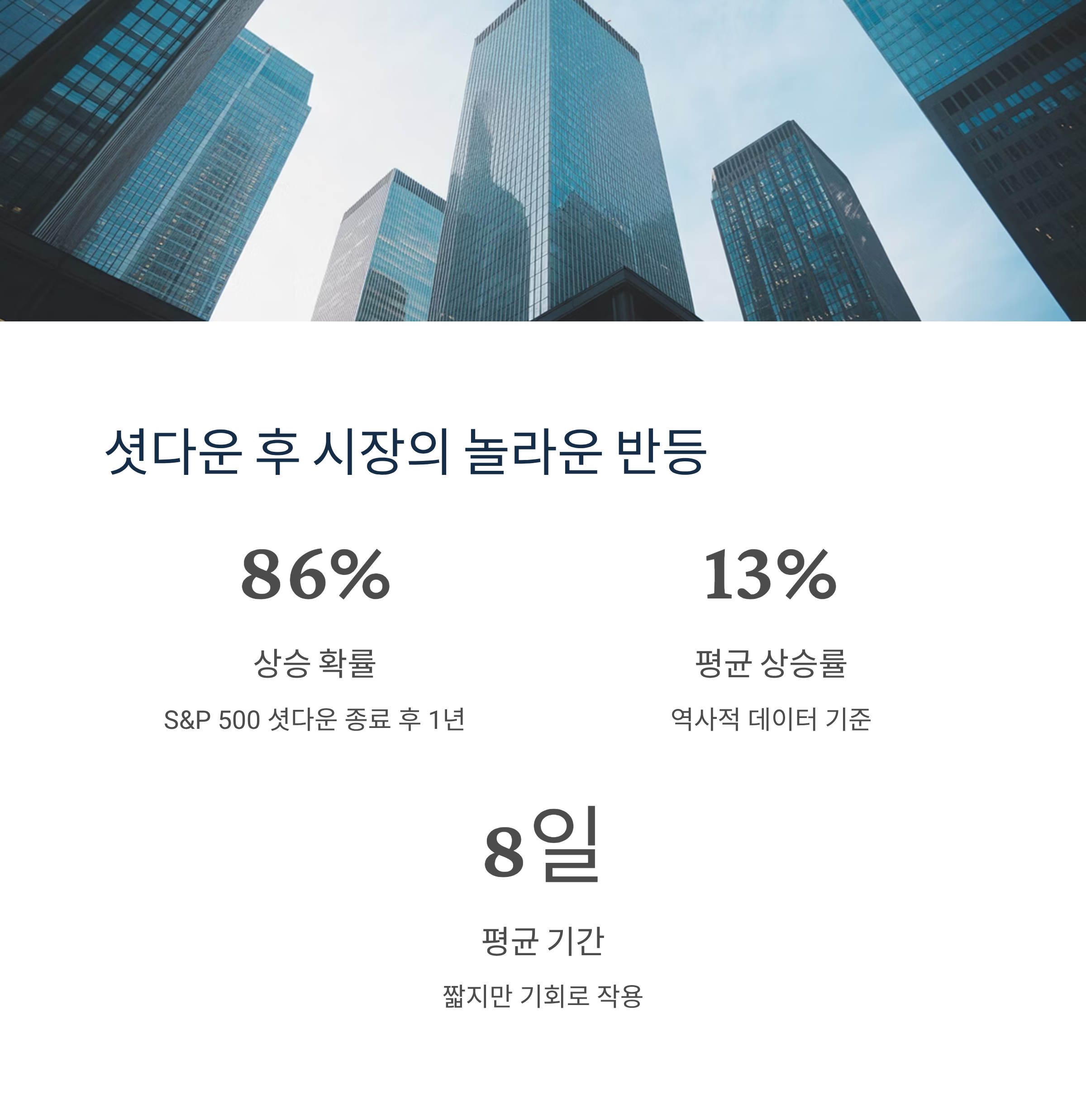 미국 정부 셧다운은 평균 8일 정도로 길지 않습니다. 하지만 그 짧은 공백이 시장에는 기회로 작용해 왔습니다. 셧다운 직후에는 불확실성으로 흔들리지만, 1년 뒤에는 오히려 상승률이 두드러진 경우가 많았습니다. 실제로 과거 86% 확률로 S&P 500은 셧다운 종료 후 1년 뒤 상승 마감했고, 평균 상승률도 13%에 달했습니다.