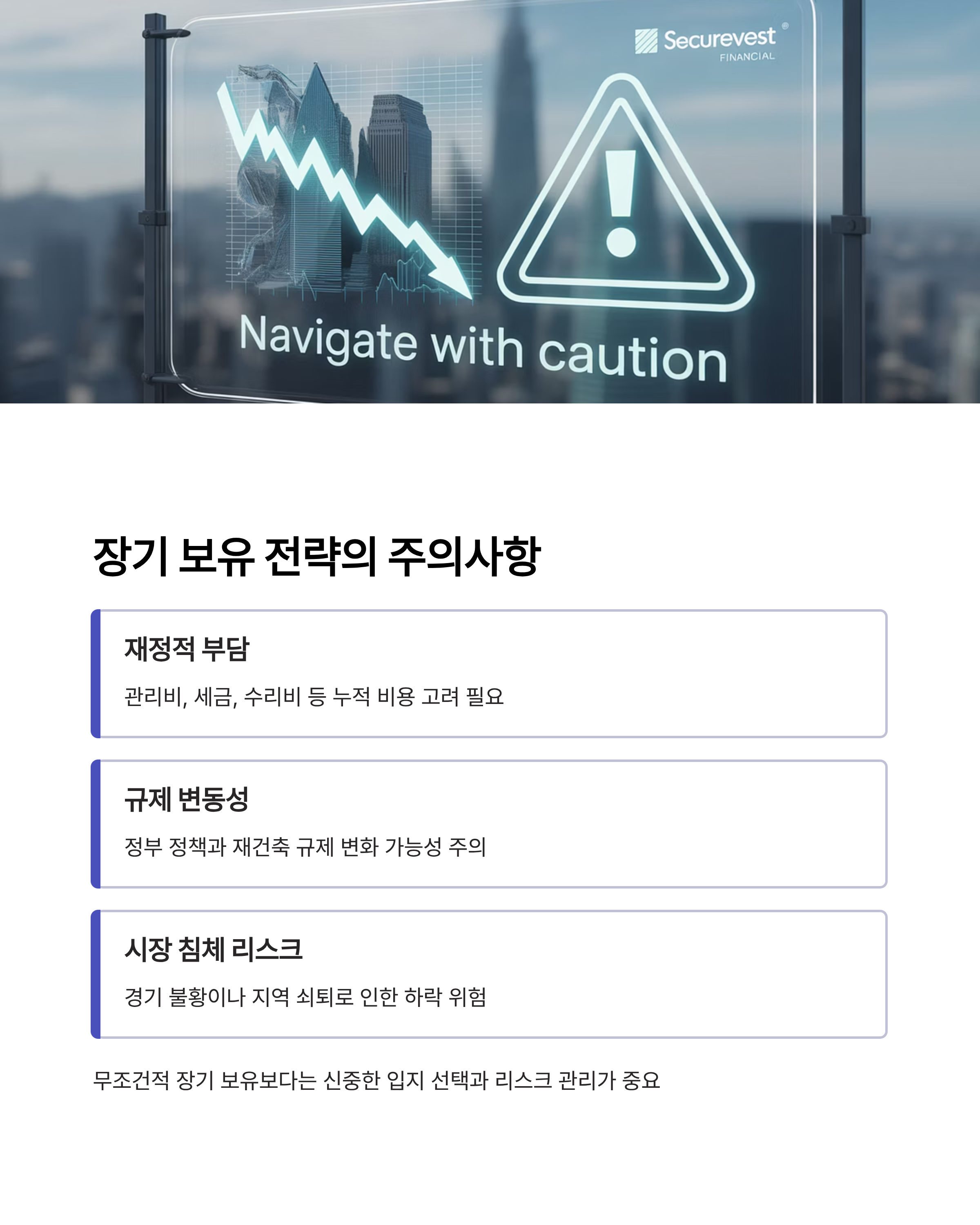- 규제 변동성: 정부의 부동산 정책, 세제 및 재건축 규제·허가 등이 바뀔 수 있어 예측 불가능성 있음