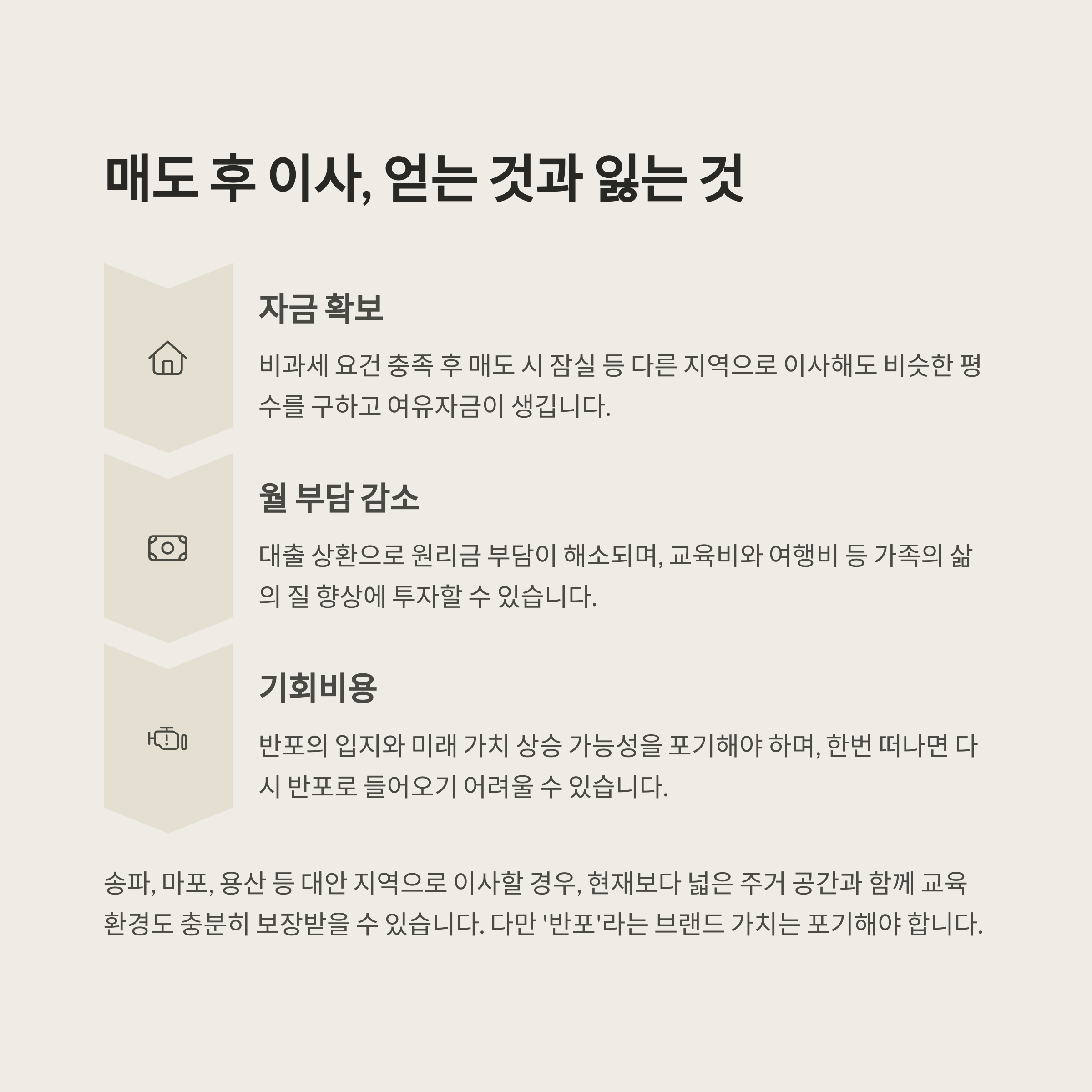 단점도 분명합니다. 반포의 입지, 가치 상승 가능성, 현재의 삶의 질을 버리는 결정이기 때문입니다. 한 번 손에서 놓치면 다시 반포로 들어오긴 매우 어려울 수 있다는 점도 고려해야 합니다.