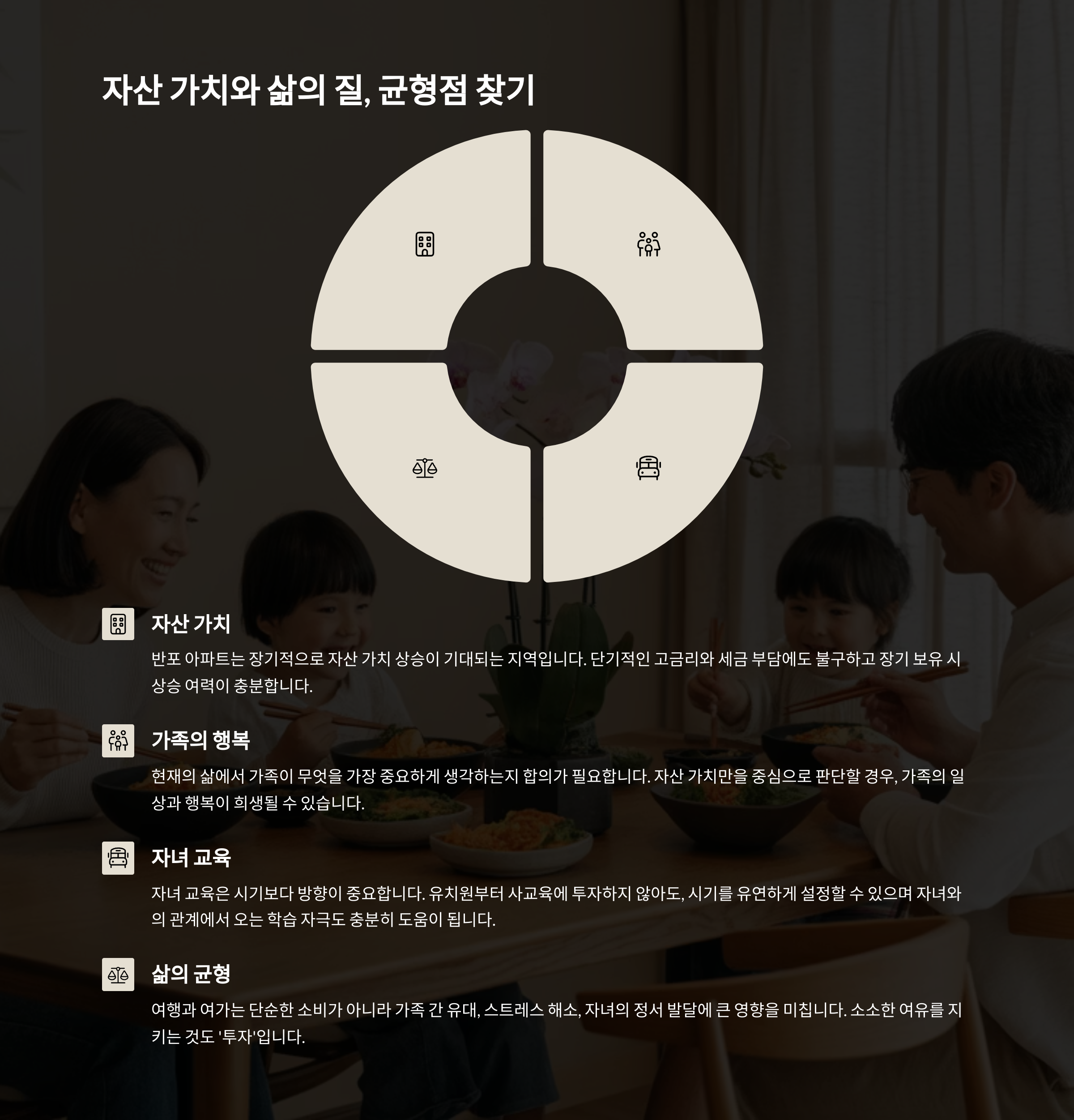 그러나 자산 가치만을 중심으로 판단할 경우, 가족의 일상과 행복은 뒷전이 될 수 있습니다. 현재의 삶에서 ‘무엇이 가장 중요한가’에 대한 가족 간의 합의가 필요합니다.