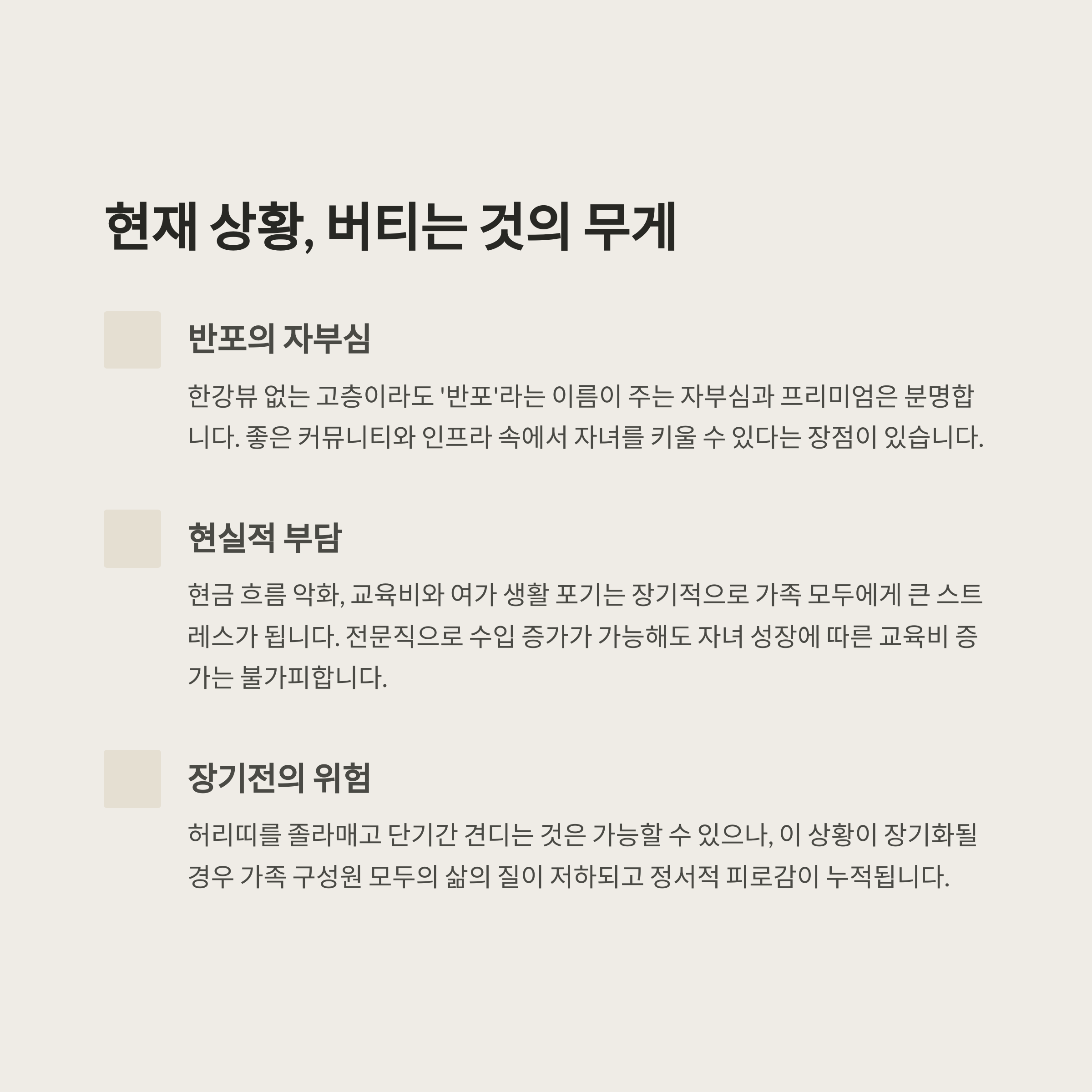 반포에 산다는 자부심은 분명 값진 경험입니다. 자녀들이 좋은 환경에서 자라나고, 커뮤니티와 인프라를 누릴 수 있다는 것도 강점입니다. 하지만 현금 흐름이 막히고, 교육·여가까지 포기하는 삶은 장기적으로는 큰 부담이 됩니다.