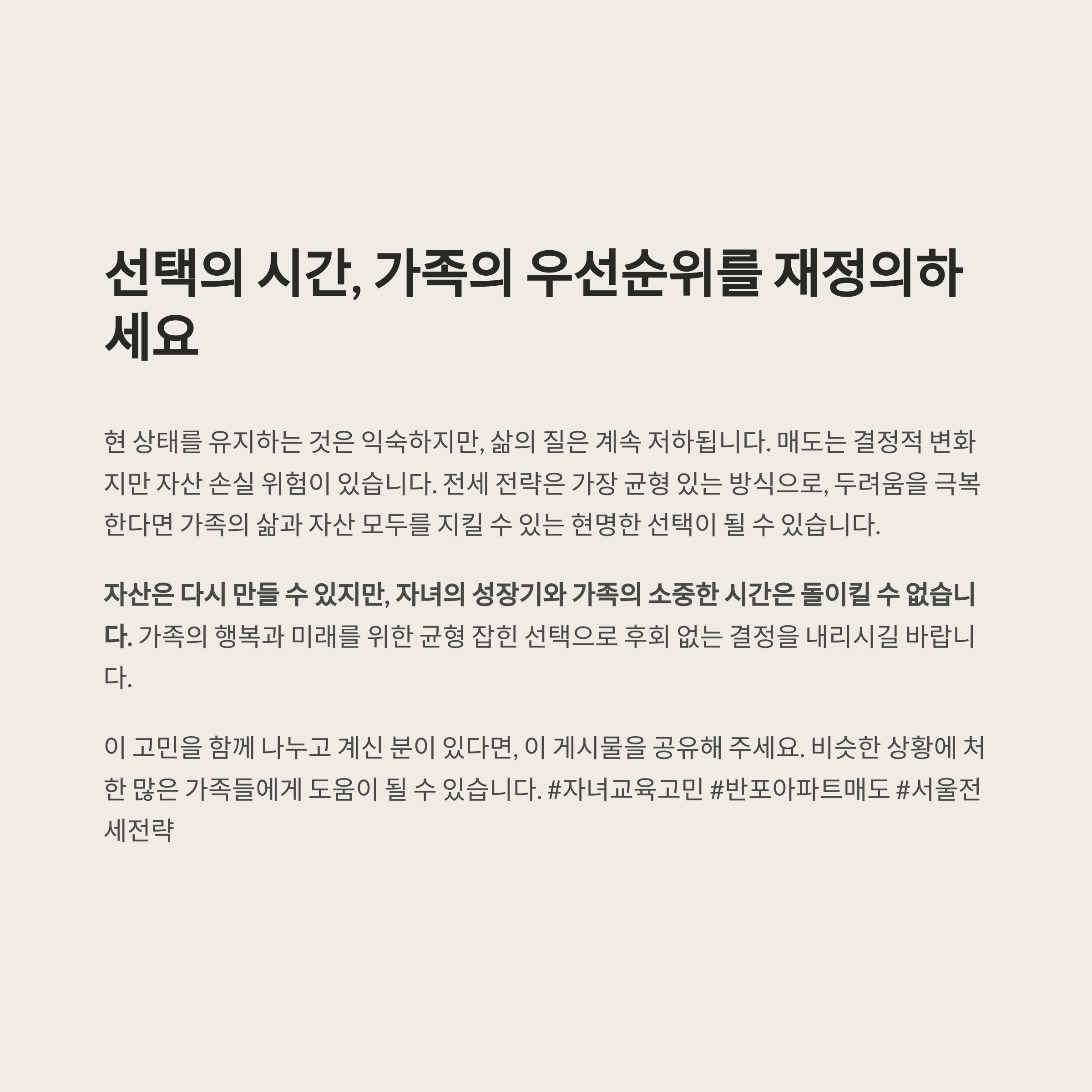궁극적으로는 ‘가족의 삶’이 우선이라는 점을 잊지 마시기 바랍니다. 자산은 다시 만들 수 있지만, 자녀의 성장기와 가족의 시간은 돌이킬 수 없습니다.