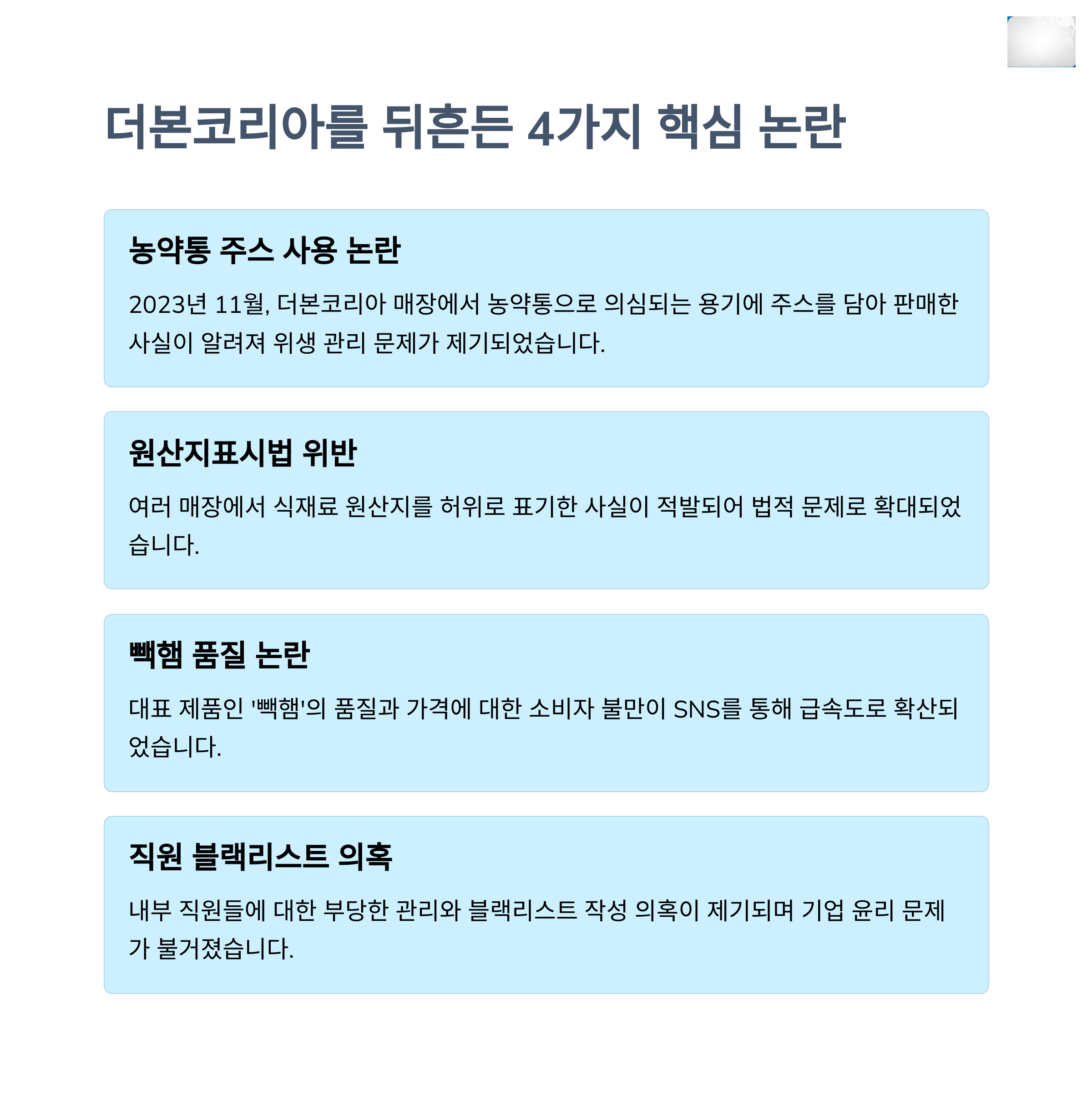 | 주요 논란 | 원산지 위반, 제품 품질, 직원 관리 문제 등 복합적 이슈 |