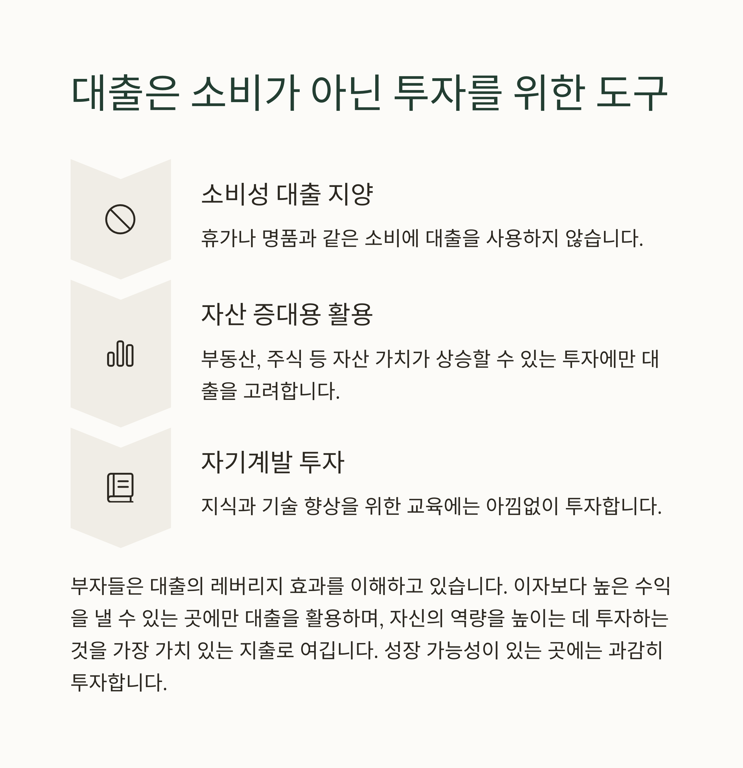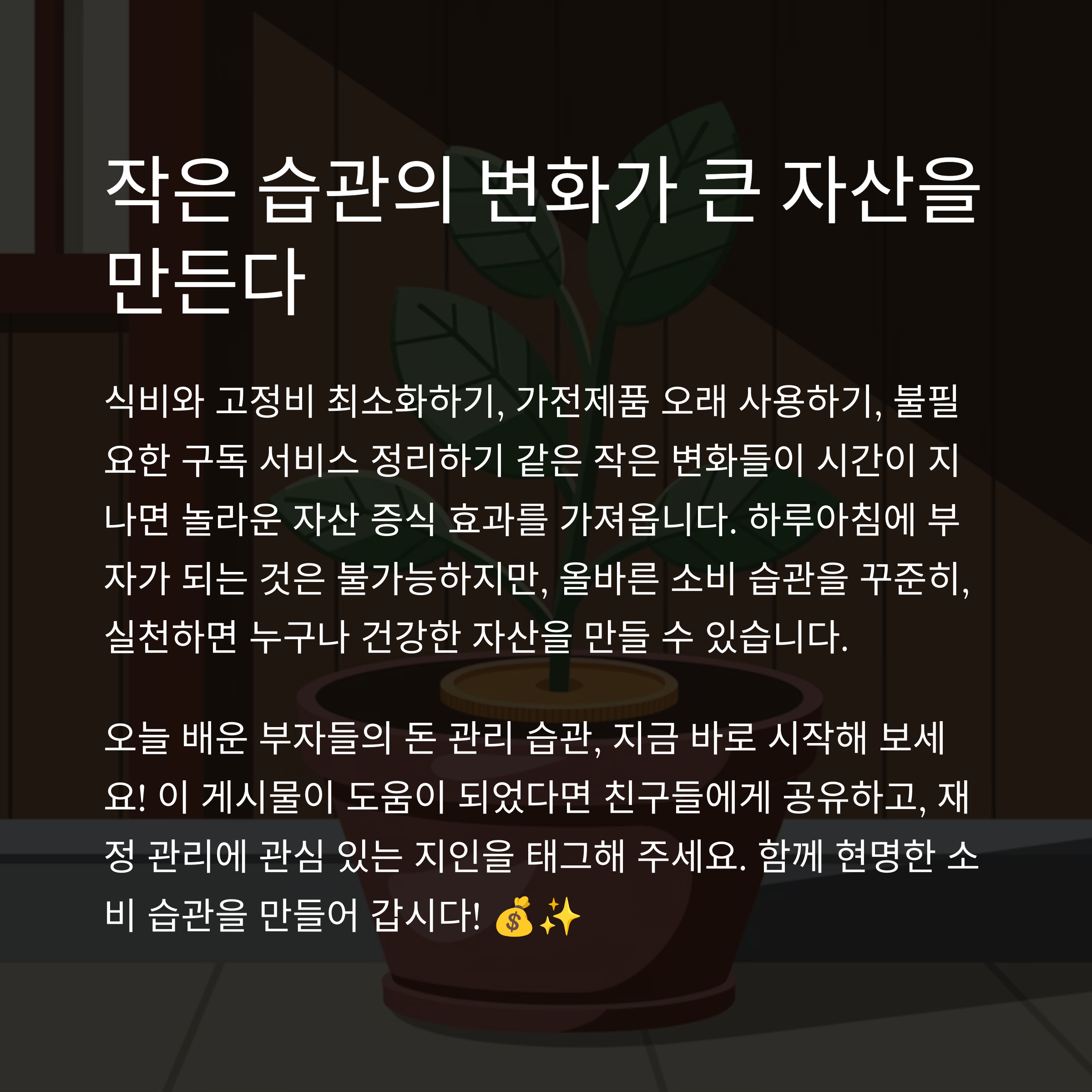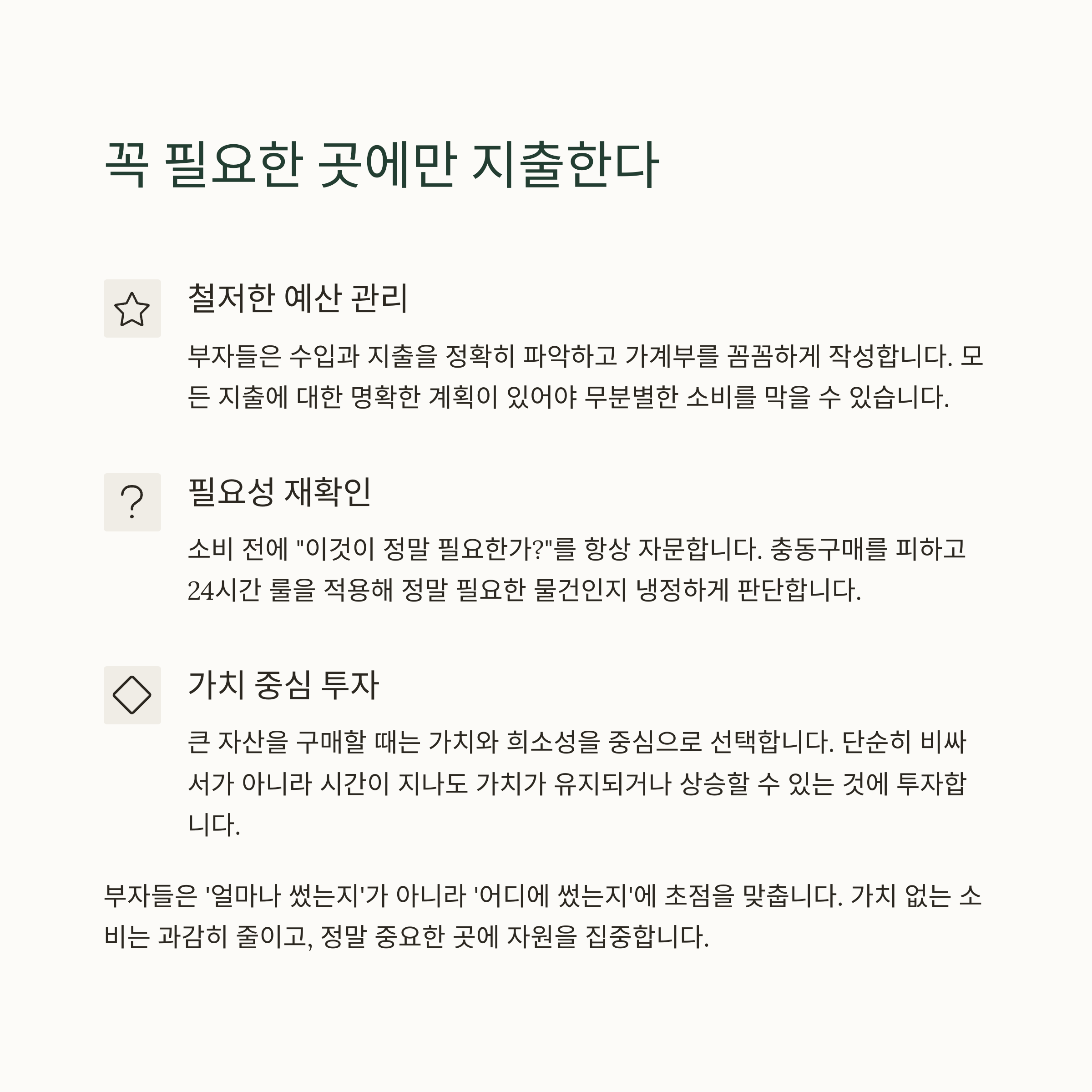 부자들은 소비와 투자를 명확히 구분합니다. 불필요한 지출을 피하고, 반드시 필요한 부분에 효율적으로 돈을 사용합니다.