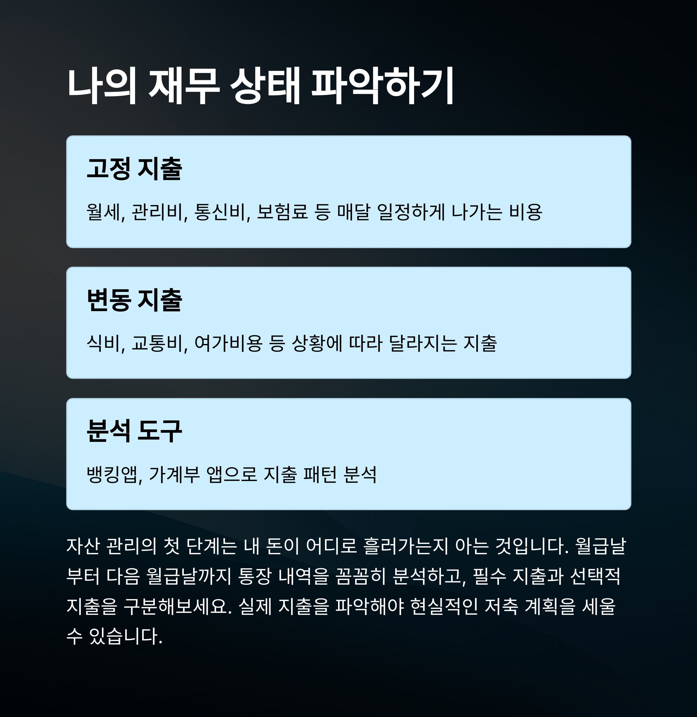 | 고정지출 | 50% | 월세, 교통비 | 안정적 생활 유지 |