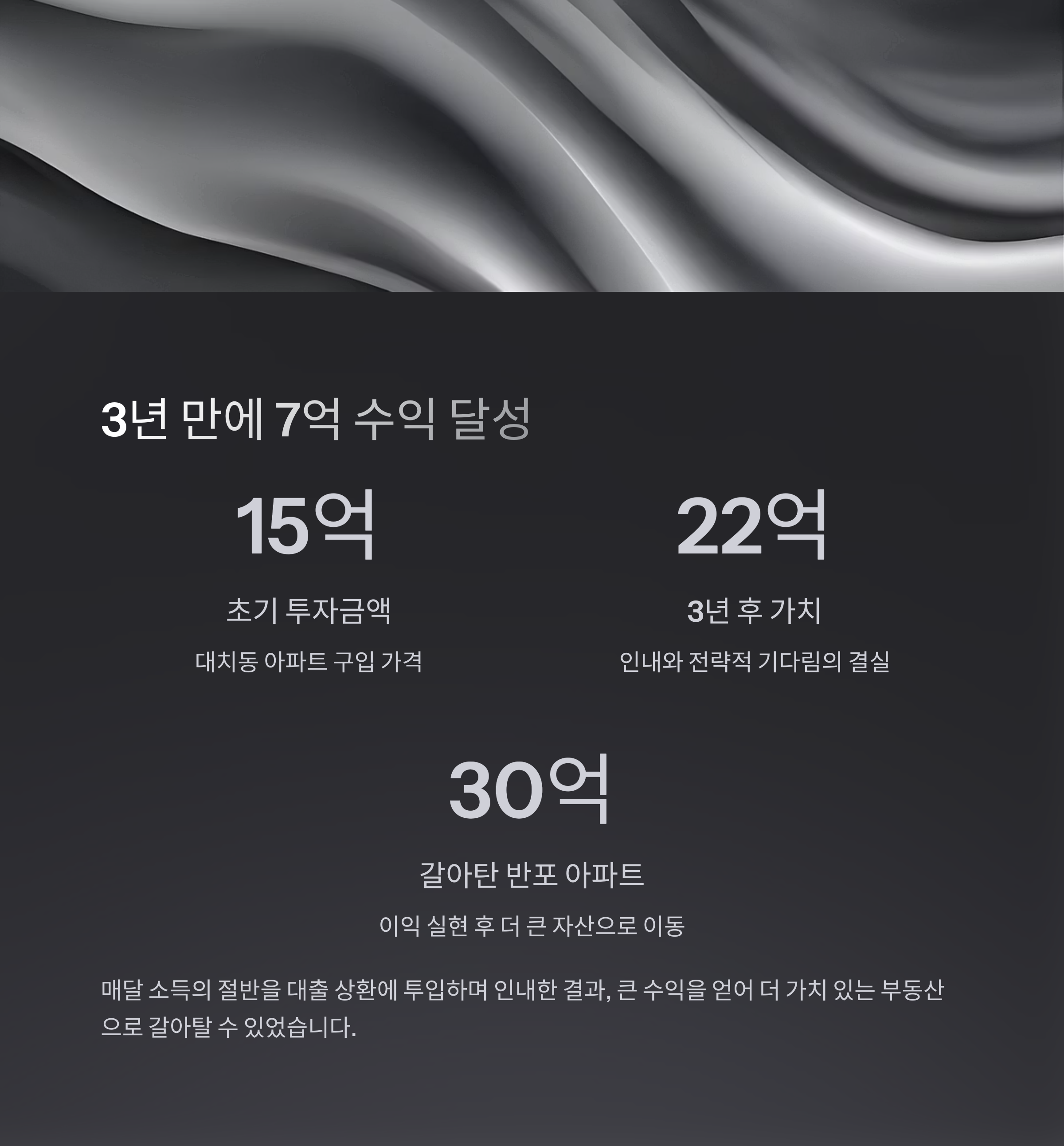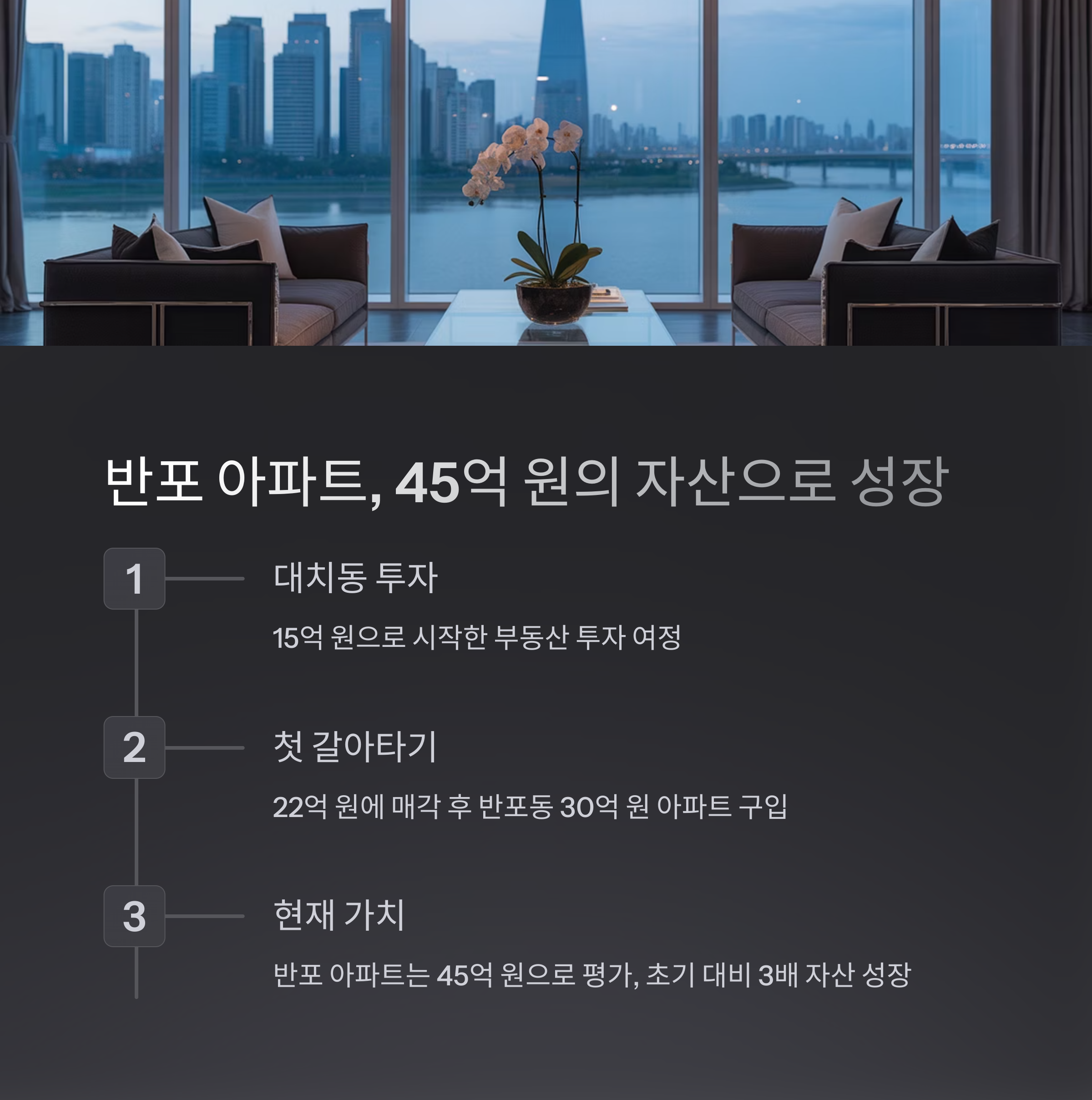 | 두 번째 투자 | 반포동 아파트 30억 원 (갈아타기) |