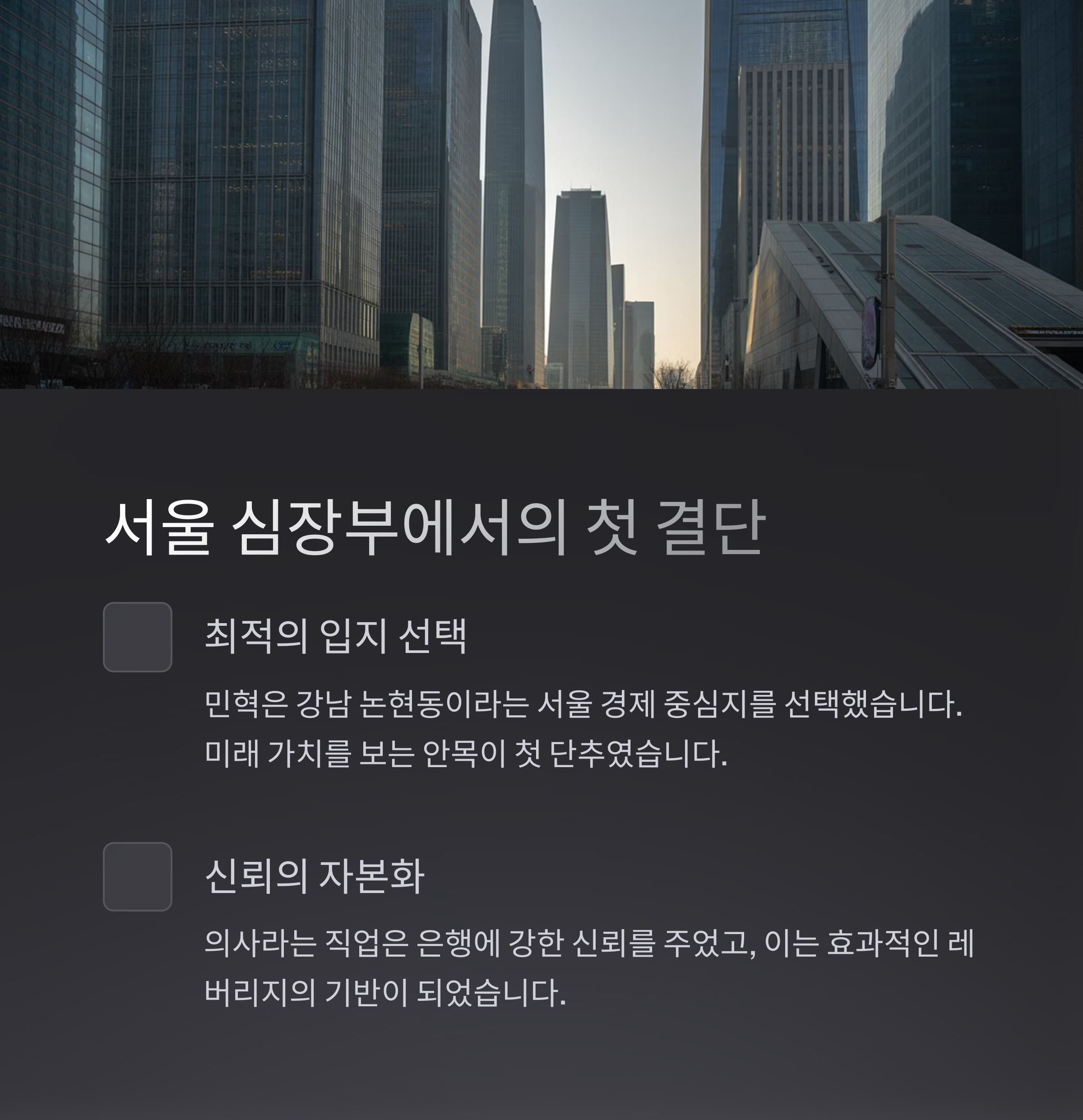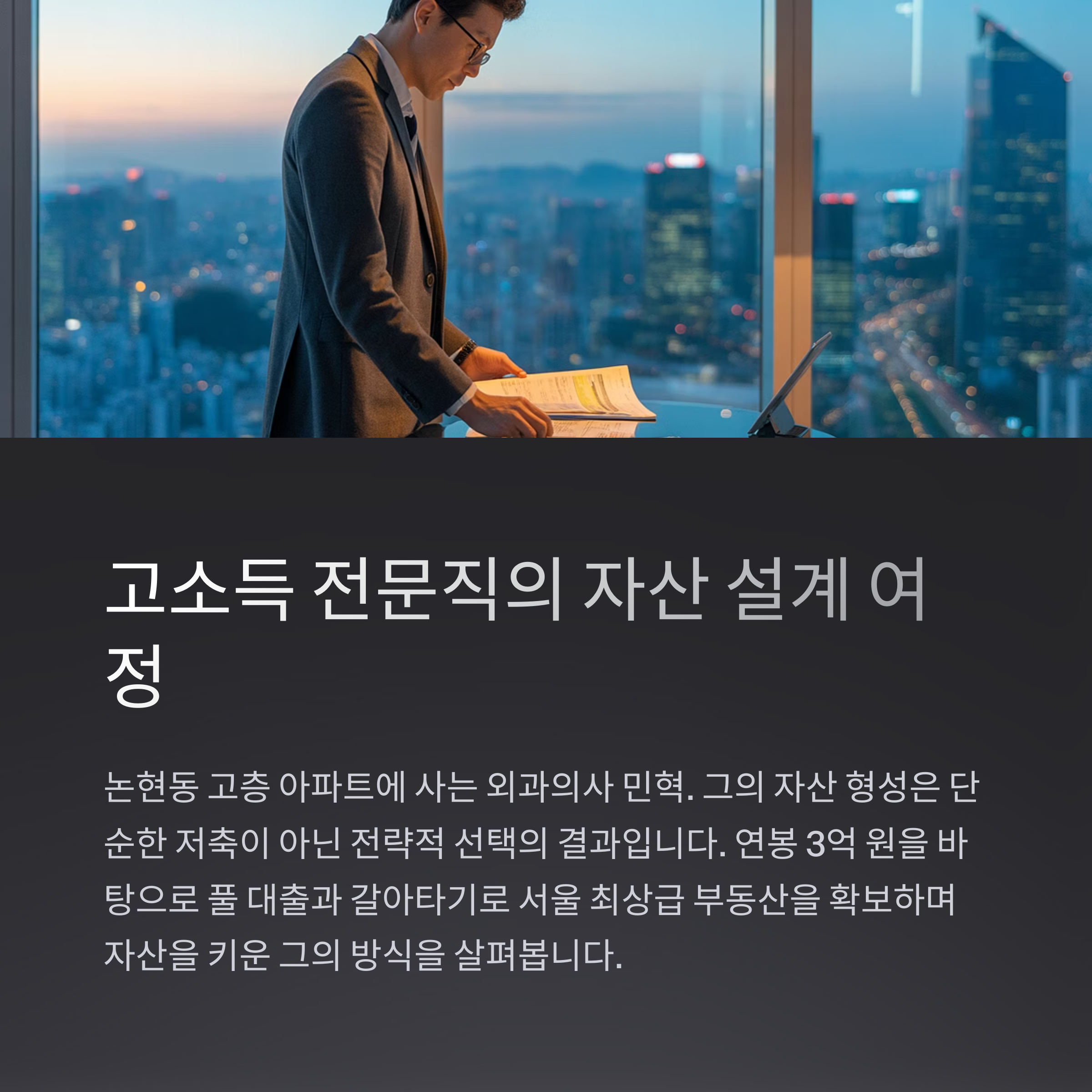 서울 논현동의 고층 아파트, 야경이 반짝이는 창가에 선 민혁은 외과 의사입니다.