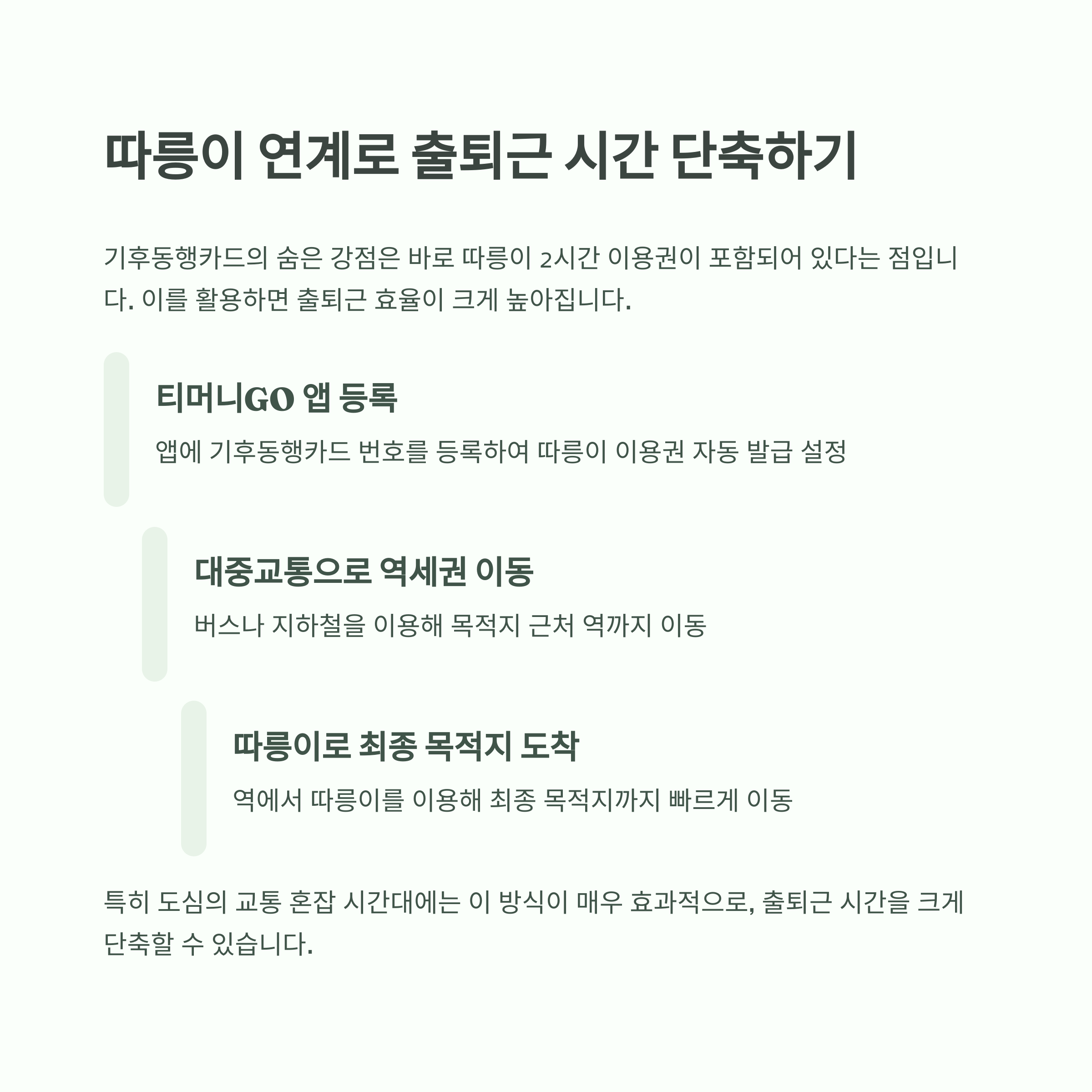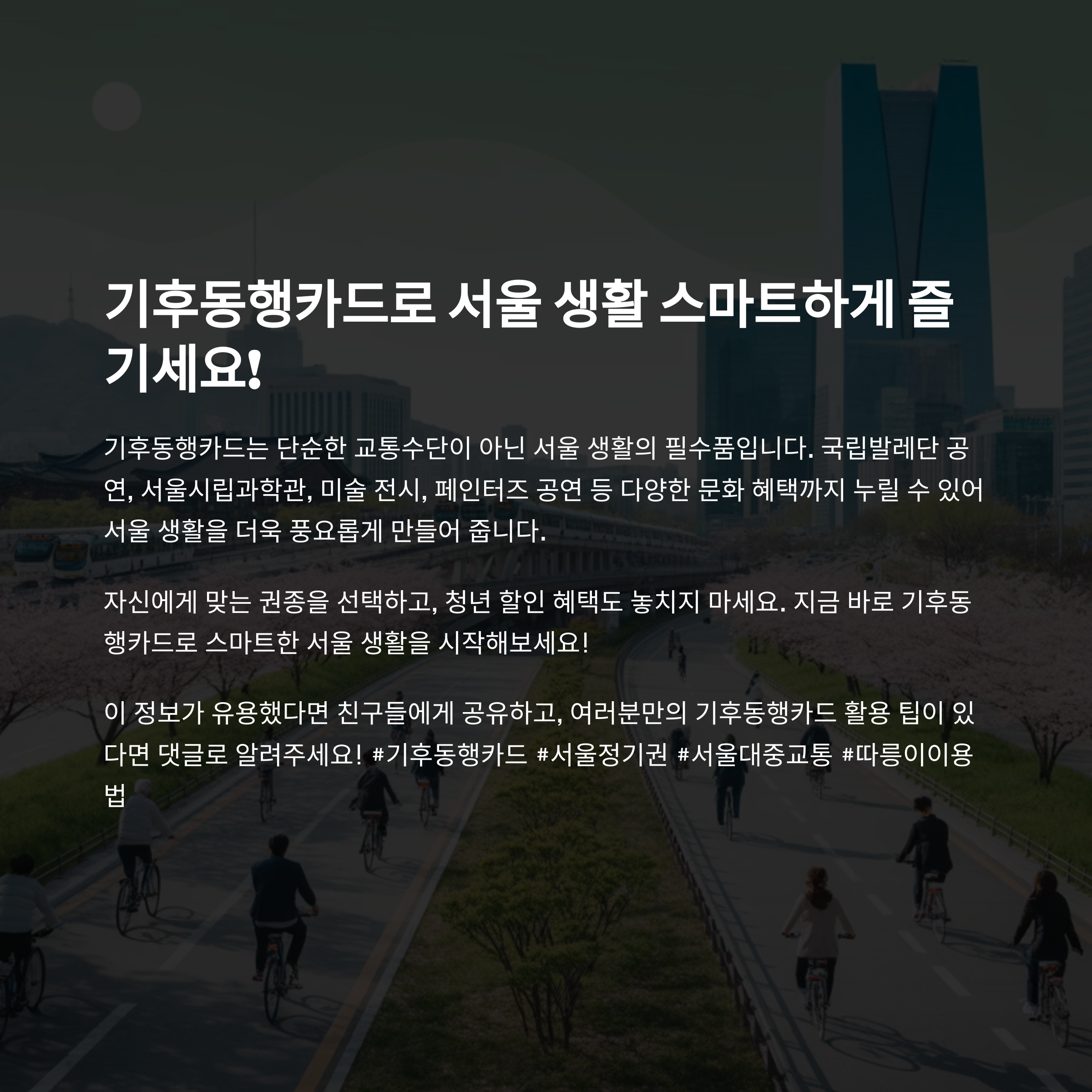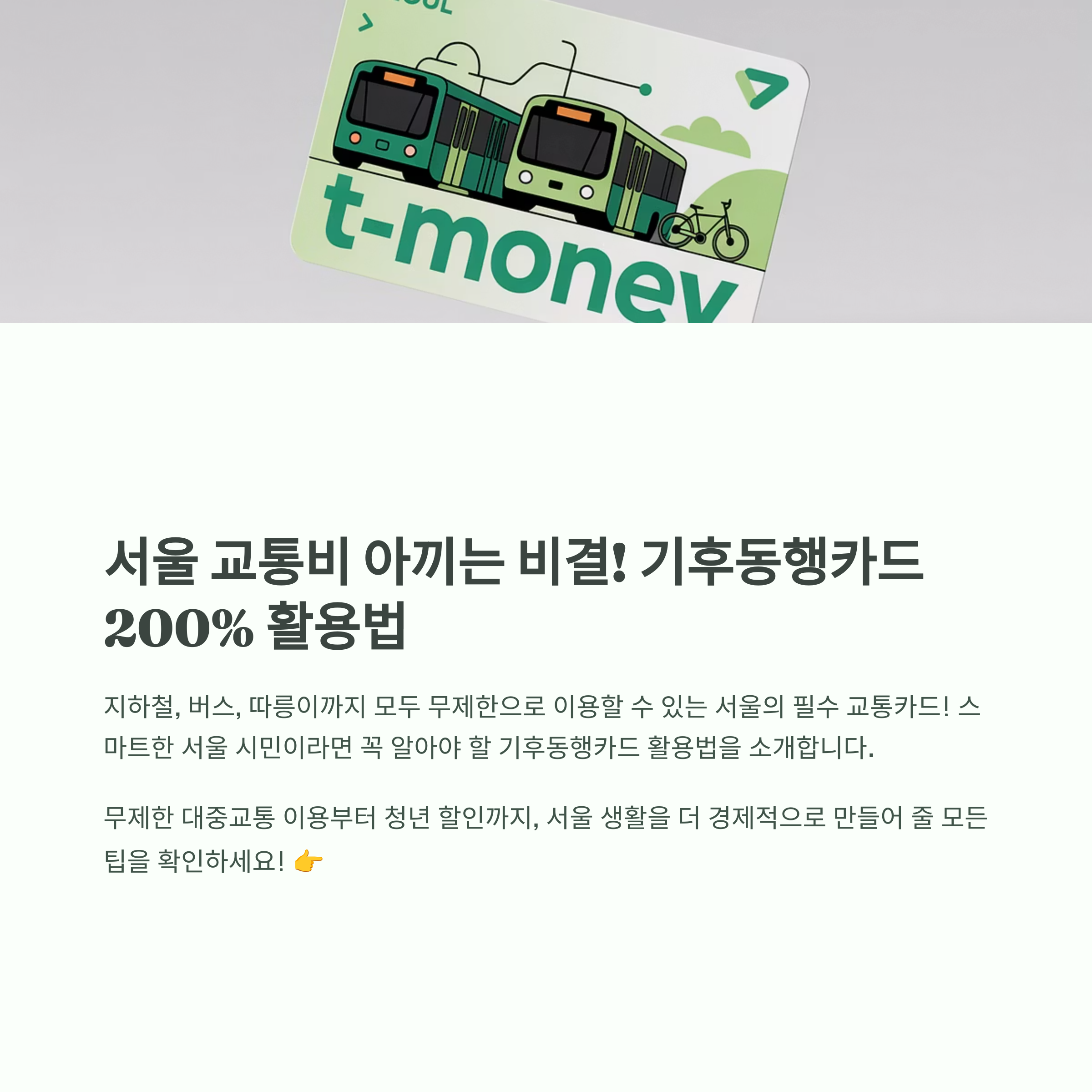 서울에서 교통비를 절약하면서 대중교통을 더 효율적으로 이용하고 싶다면, ‘기후동행카드’가 최고의 선택입니다. 이 글에서는 30일권부터 단기권, 실물·모바일 선택, 따릉이 연동, 청년 할인까지 기후동행카드를 똑똑하게 사용하는 방법을 한눈에 정리해드립니다. 사용 시 주의사항과 환불 조건까지 꼼꼼히 확인하시고, 서울 생활을 더 스마트하게 누려보세요.