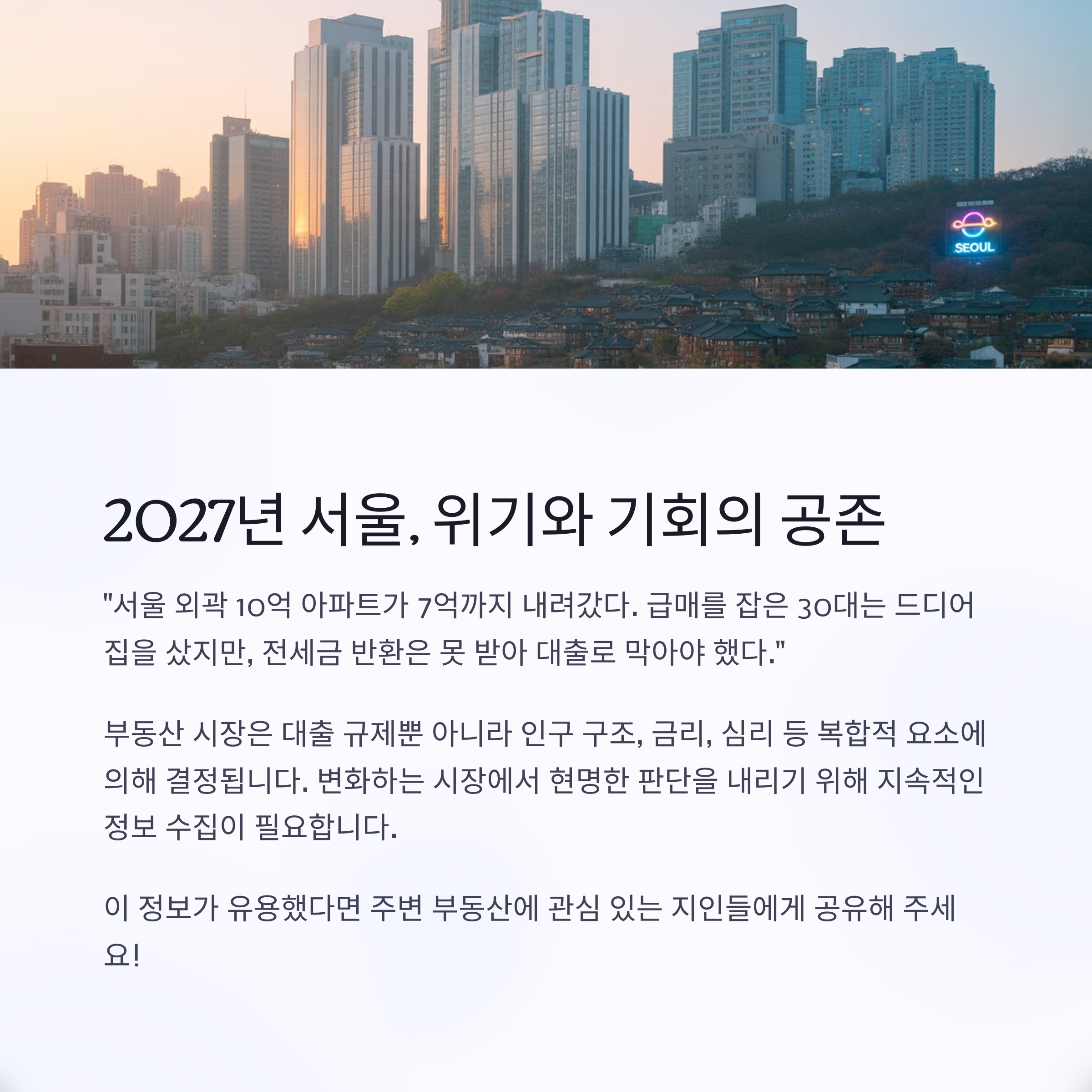 "서울 외곽, 10억 아파트가 7억까지 내려갔다. 강남은 꿈도 못 꾸지만, 급매를 잡은 30대는 드디어 집을 샀다. 다만 전세금 반환은 못 받아 대출로 막아야 했다."