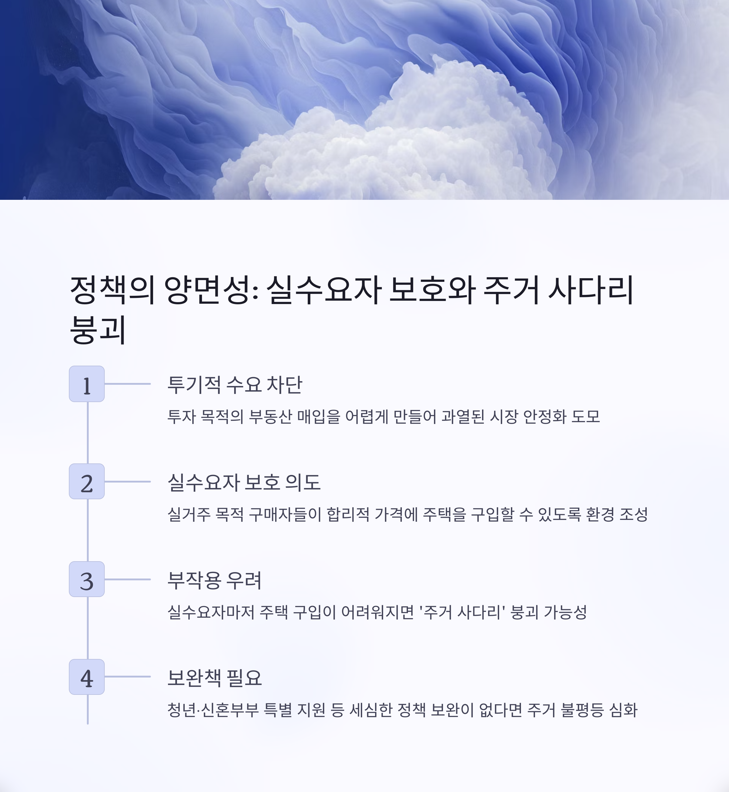 결국 이번 정책의 핵심은 "투기적 수요 차단"과 "실수요자 보호"에 있습니다. 다만 실수요자조차 집을 사기 어려운 구조라면 시장이 과도하게 위축될 우려도 있습니다.