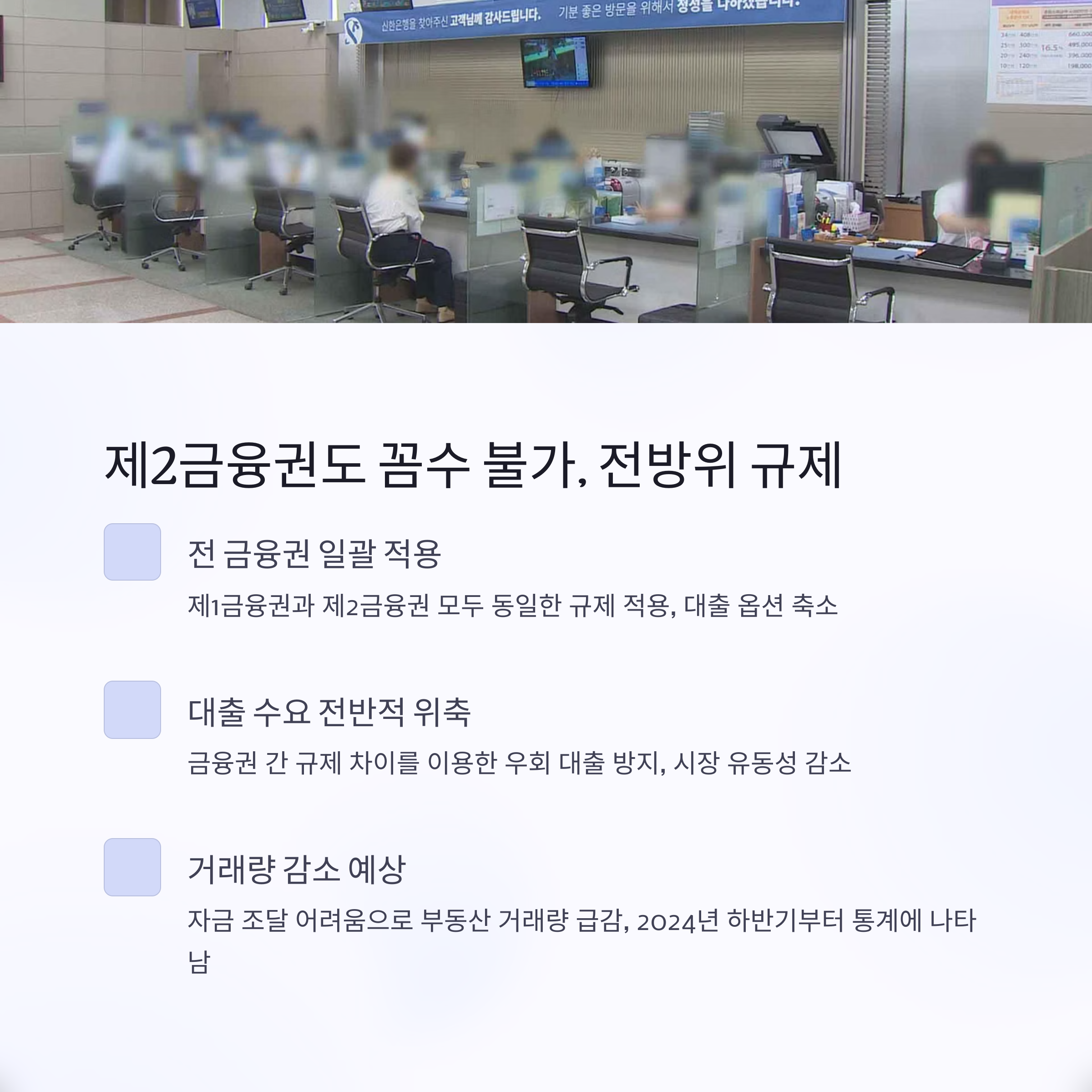 이번 조치의 가장 강력한 측면 중 하나는 '전 금융권 일괄 적용'입니다. 그동안 제1금융권의 규제를 피해 제2금융권에서 자금을 끌어오는 방식이 암암리에 활용돼 왔지만, 이제는 제2금융권 역시 같은 규제를 받습니다.