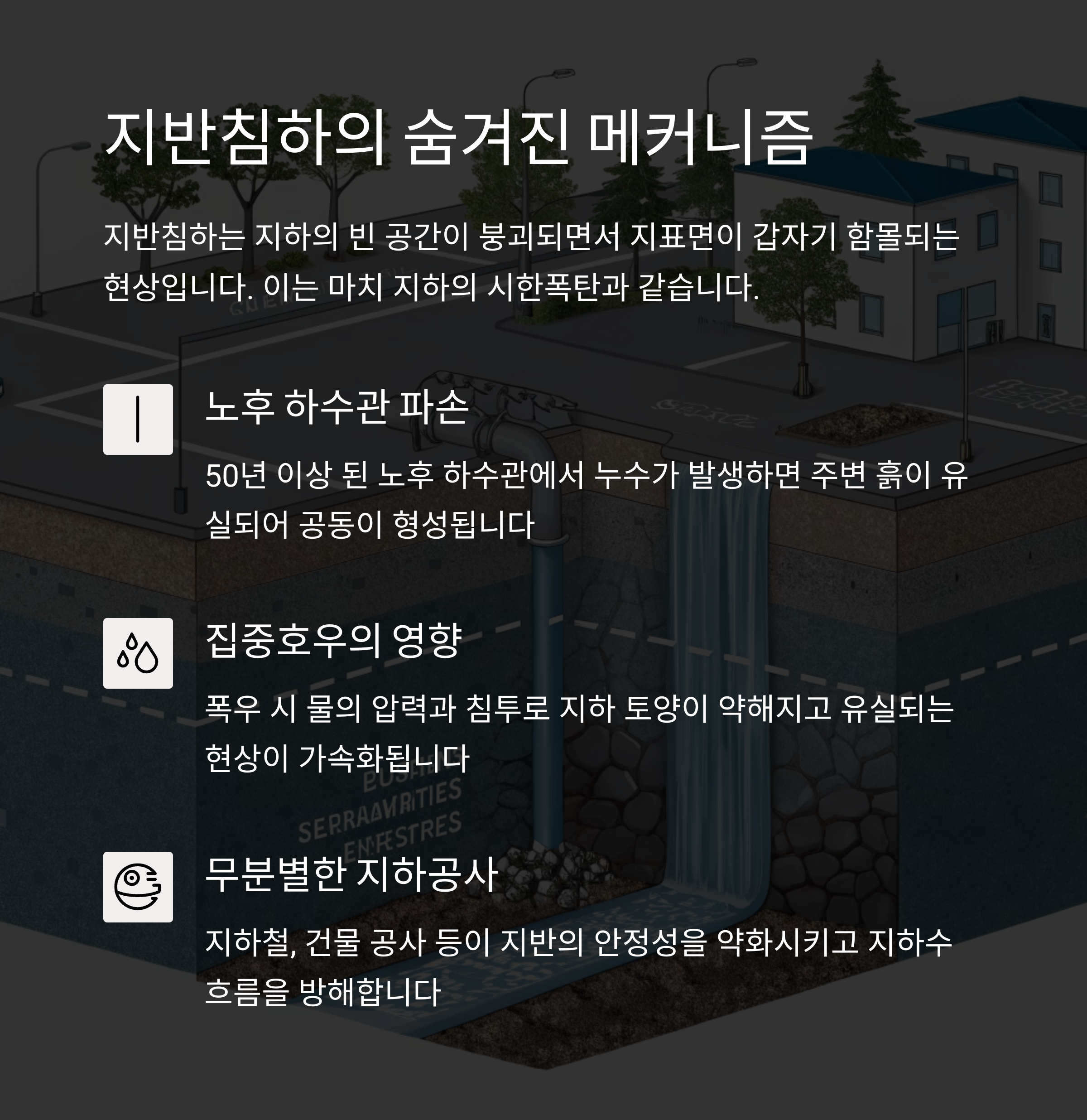 특히 낡은 하수도관, 지하 공사, 지질 구조 불안정이 주된 원인이며,