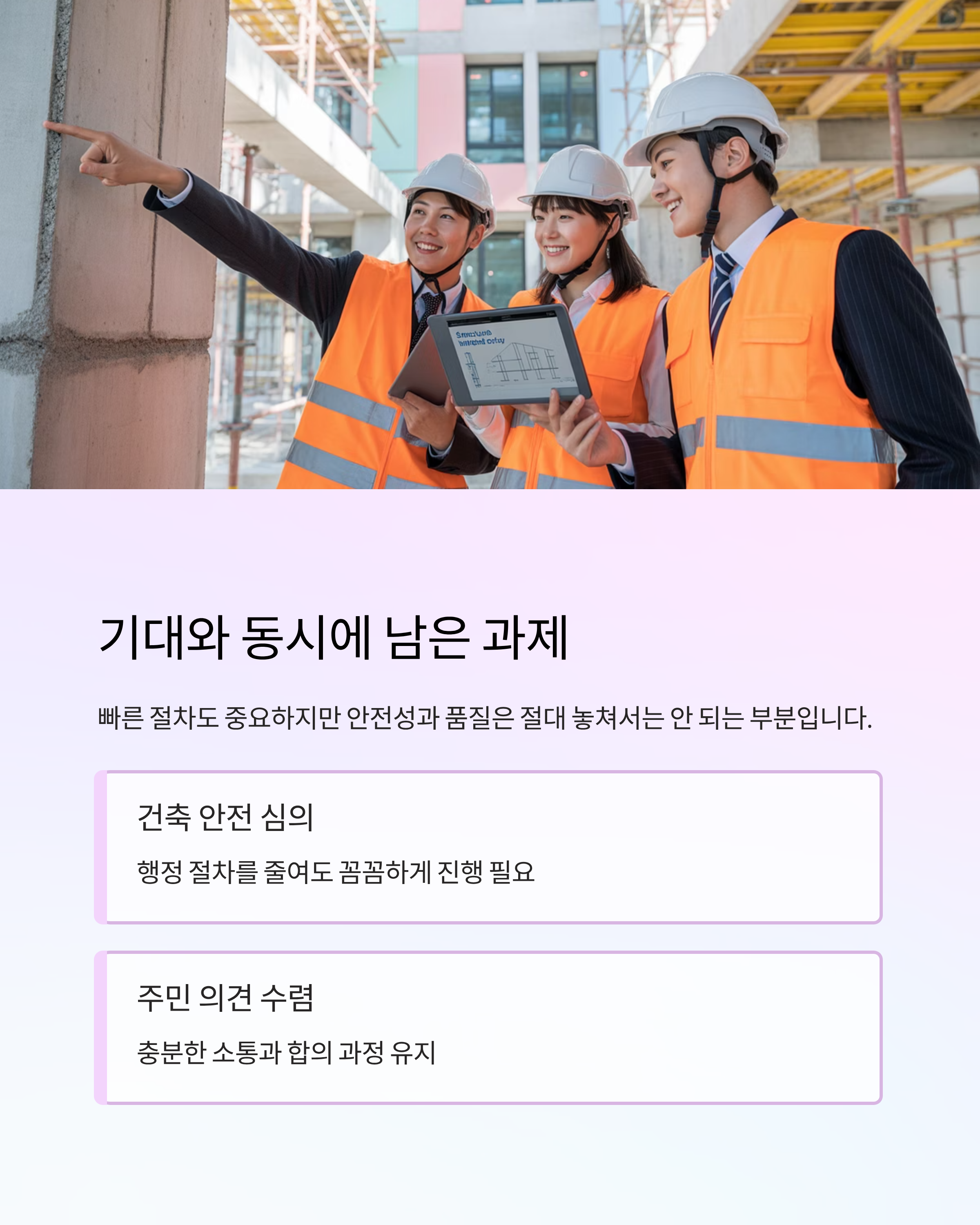 빠른 절차도 중요하지만, 안전성과 품질은 절대 놓쳐서는 안 되는 부분입니다. 행정 절차를 줄이더라도 건축 안전 심의와 주민 의견 수렴은 꼼꼼하게 진행되어야 할 과제입니다.