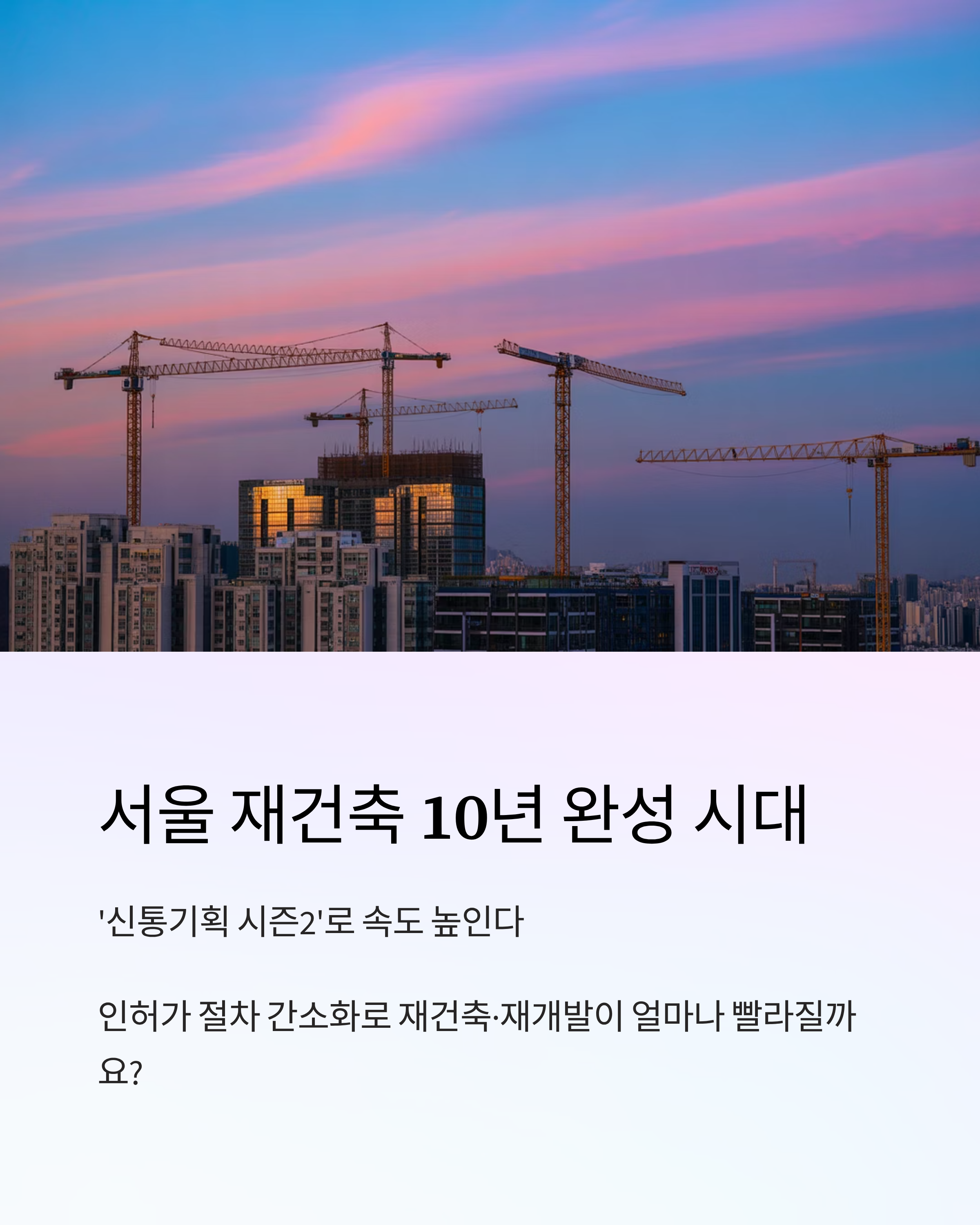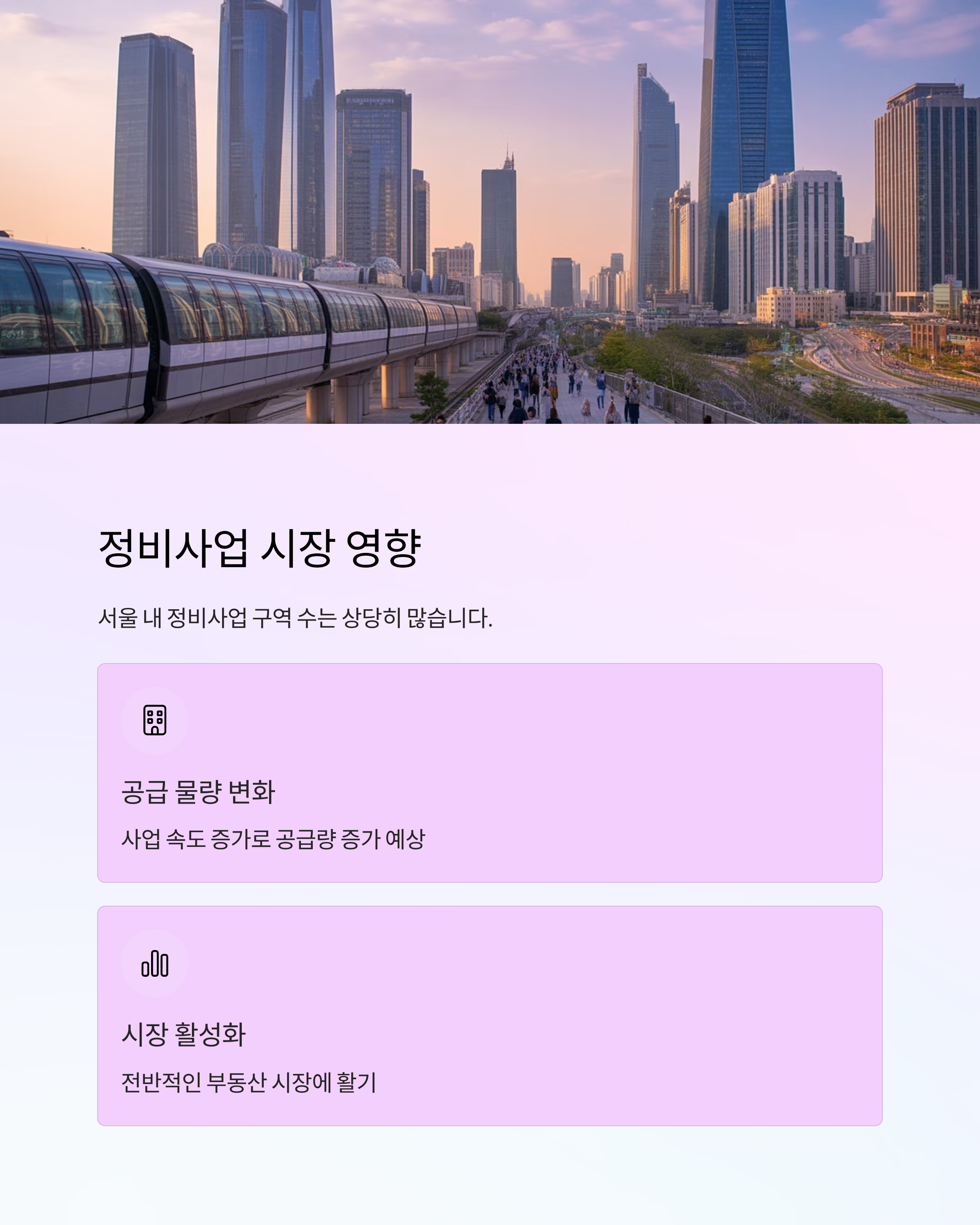 서울 내 정비사업 구역 수는 상당히 많습니다. 사업 속도가 올라가면 공급 물량에도 변화가 생길 수 있고, 시장 전반에 활기를 불어넣을 수 있습니다.